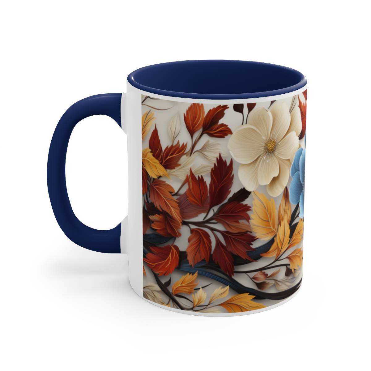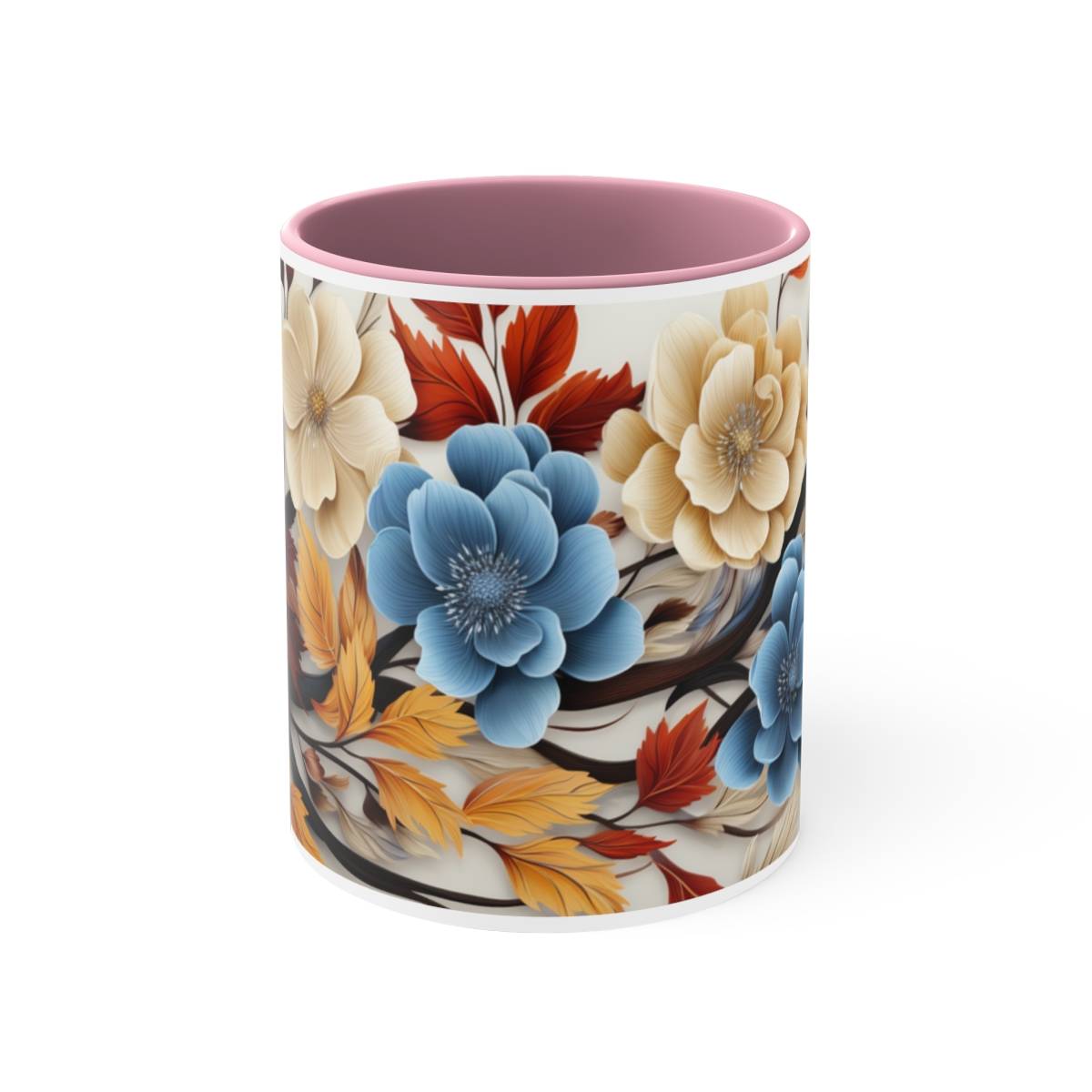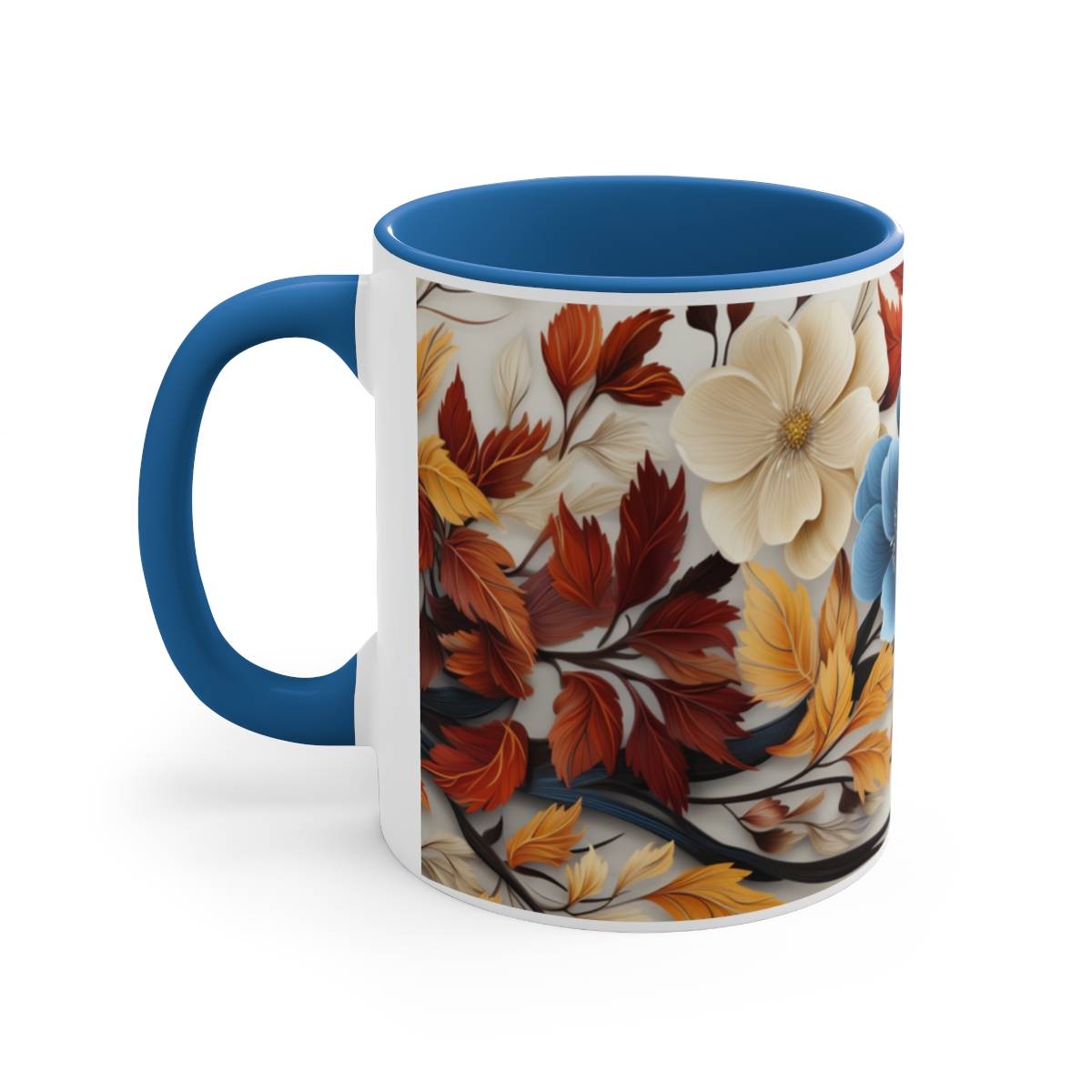 On this mug, you’ll find blue and white flowers gracefully entwined with brown and orange leaves. The flowers are in full bloom, while the leaves carry the warm colors of the changing season. This design evokes a sense of tranquility and the gentle embrace of nature’s transformation.