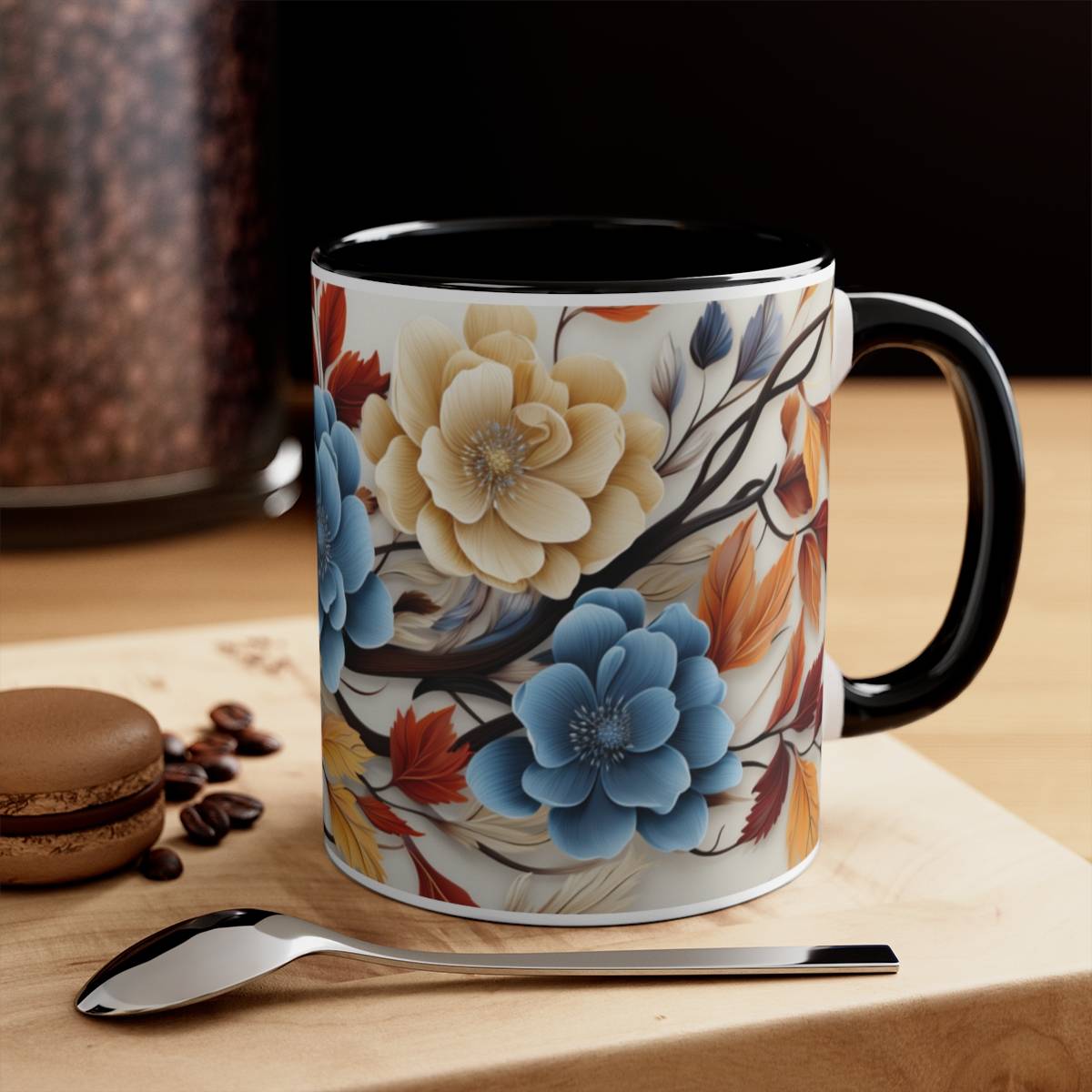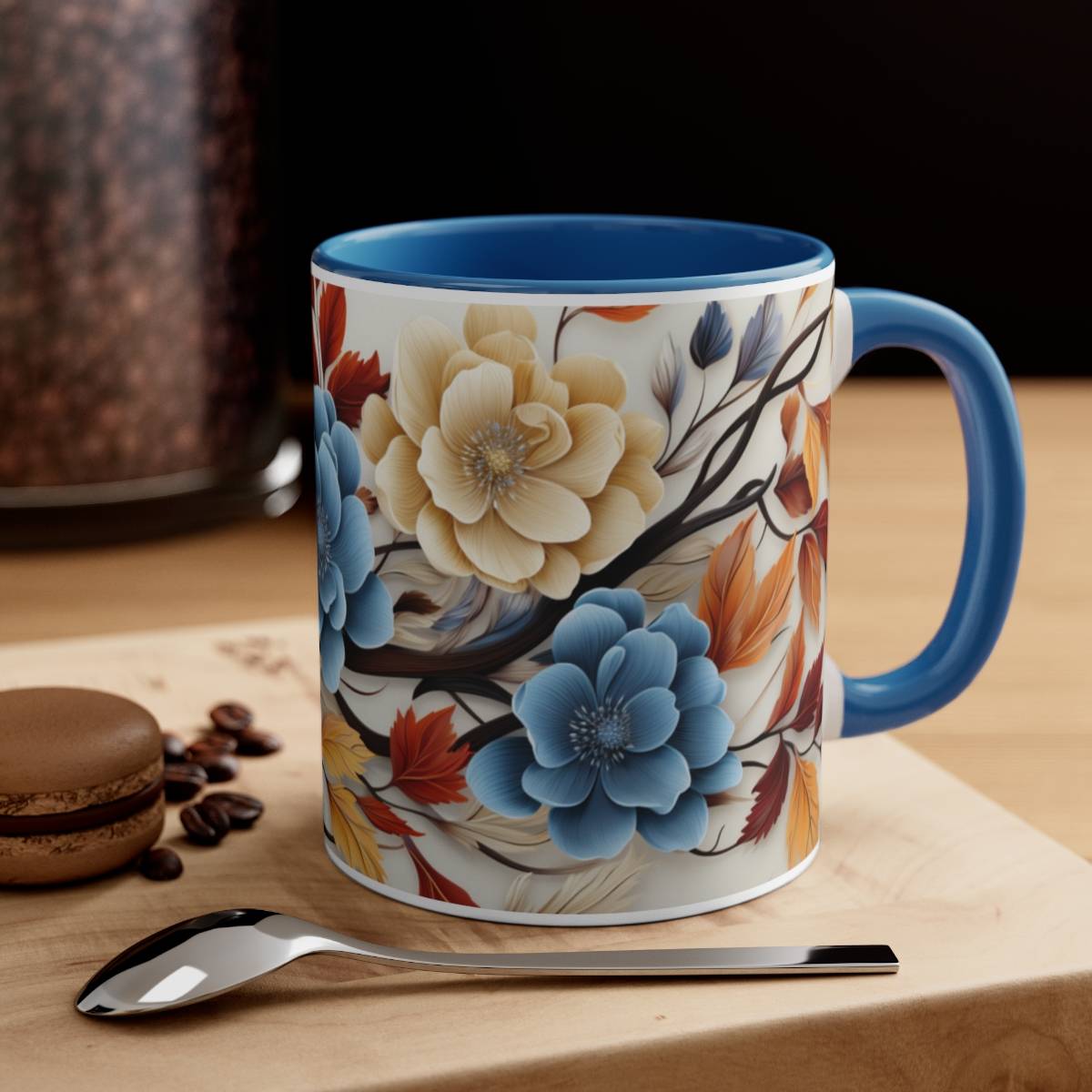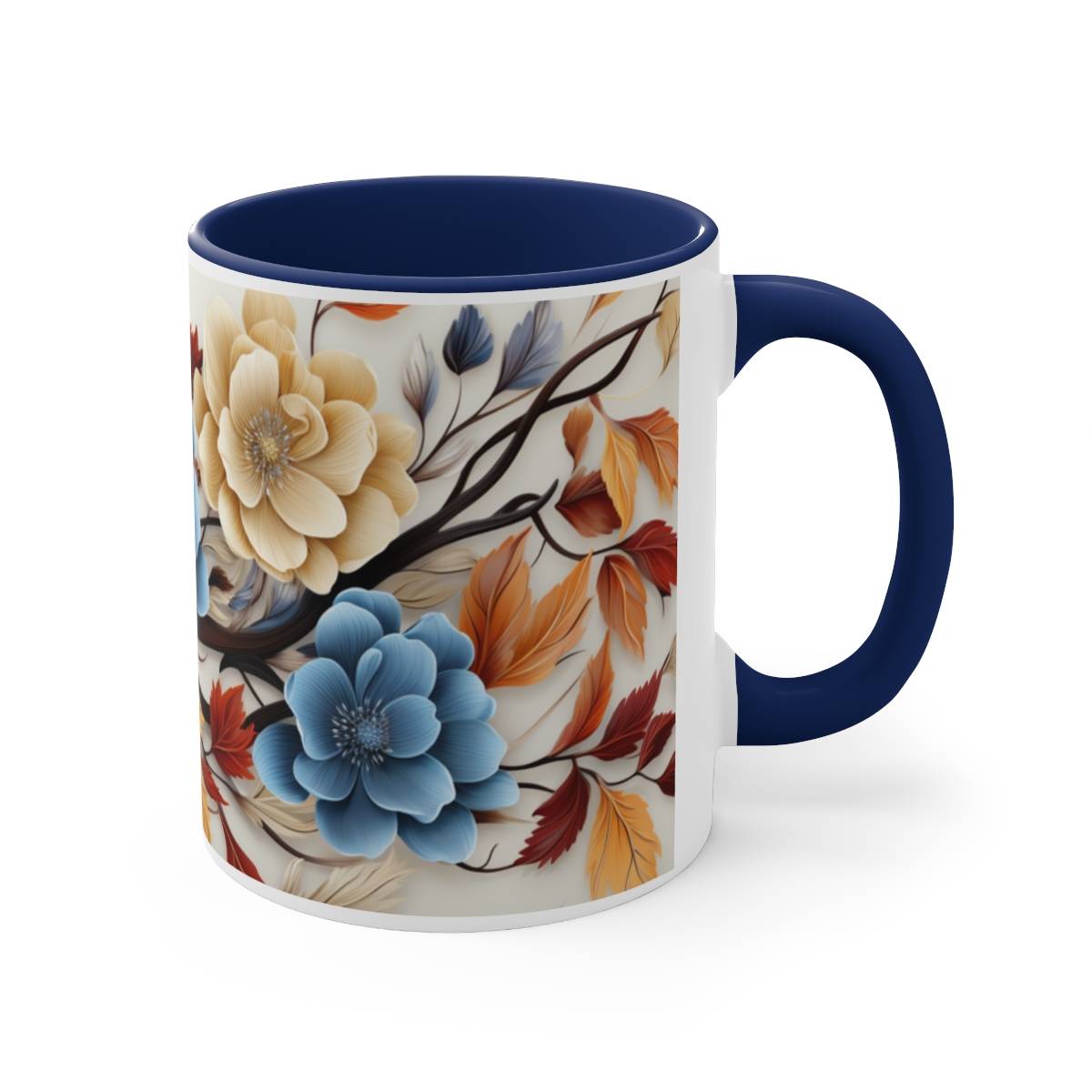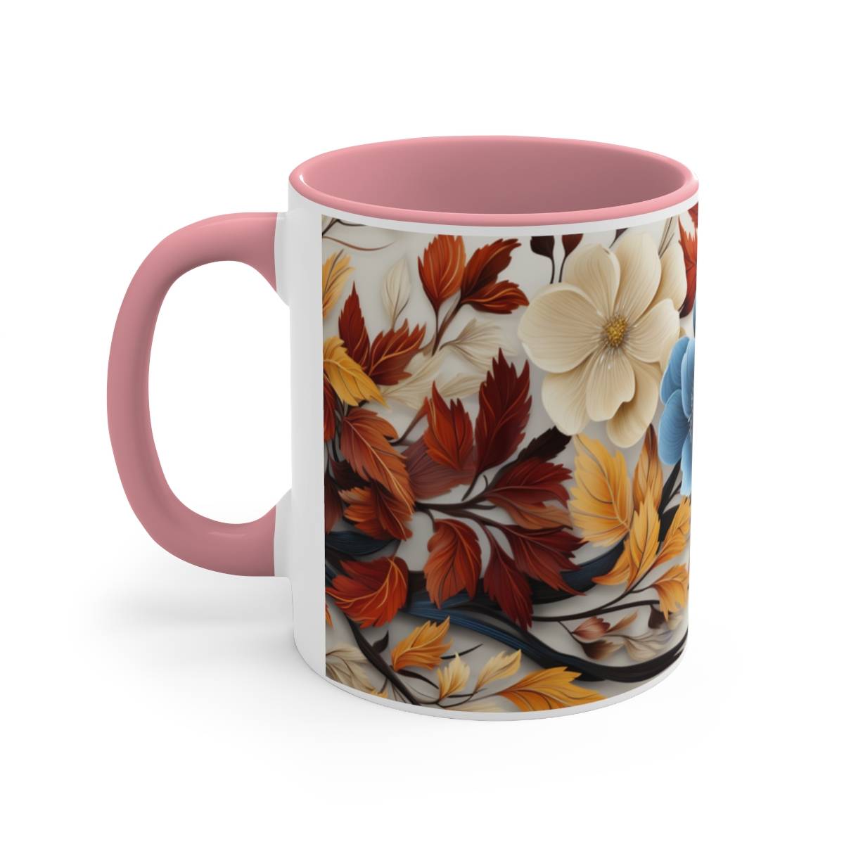 On this mug, you’ll find blue and white flowers gracefully entwined with brown and orange leaves. The flowers are in full bloom, while the leaves carry the warm colors of the changing season. This design evokes a sense of tranquility and the gentle embrace of nature’s transformation.