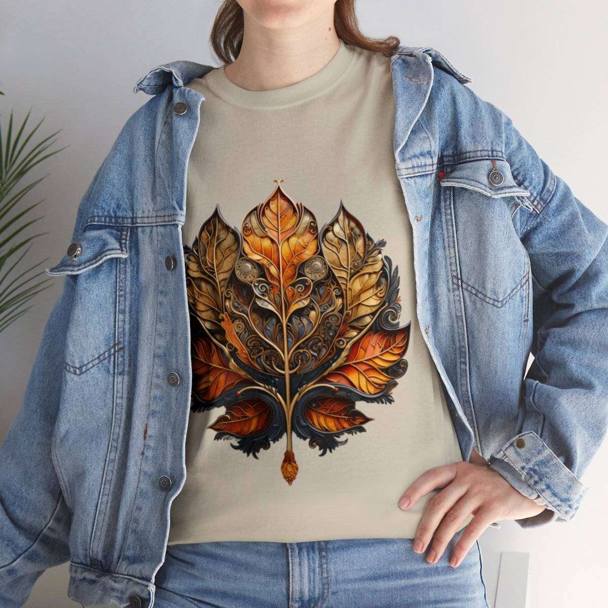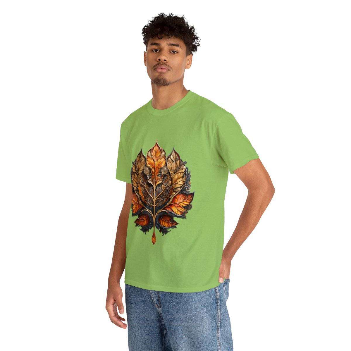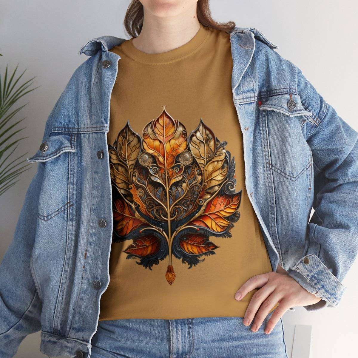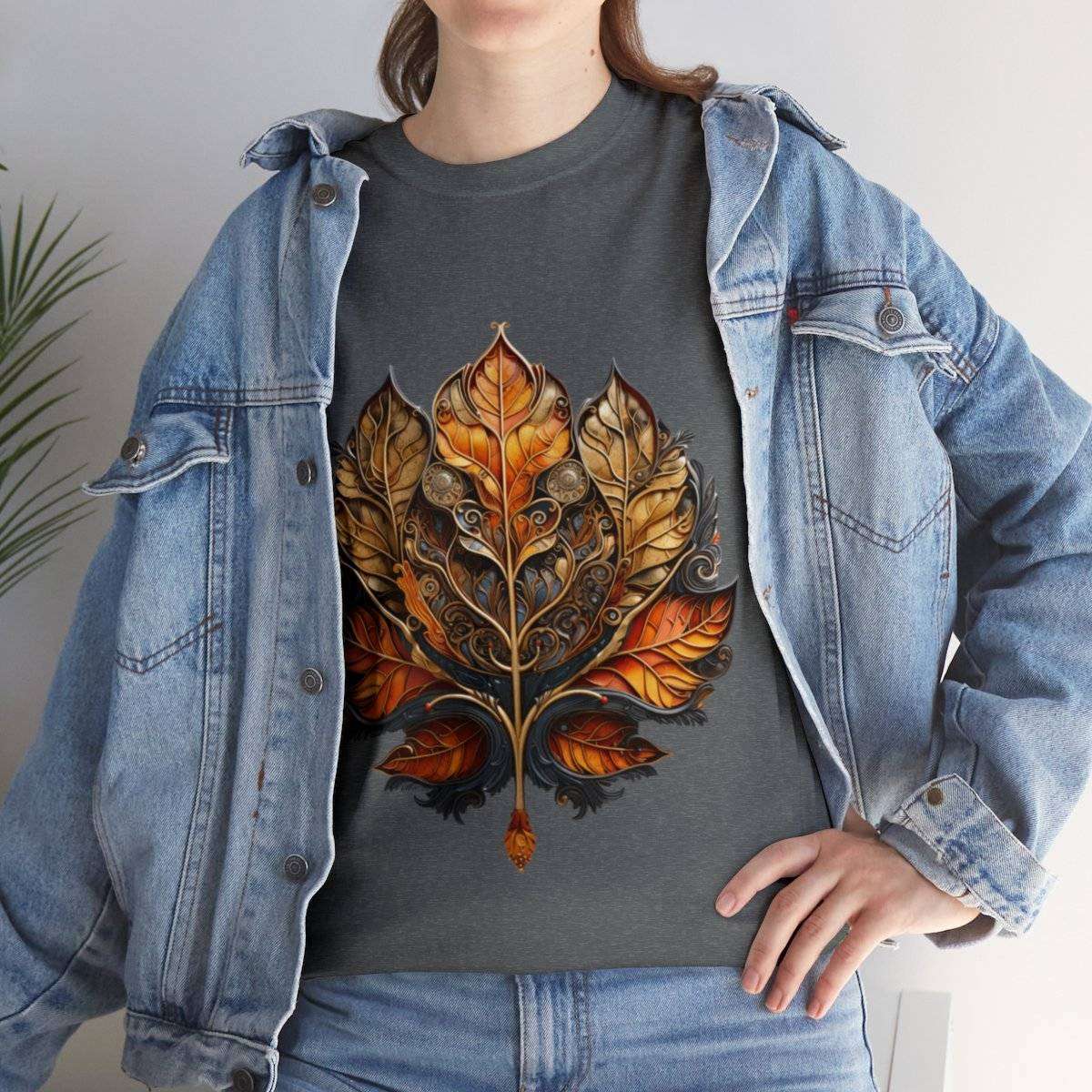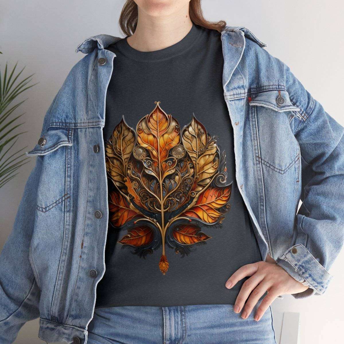 On the front of the tee, you’ll find a unique design, a tree leaf shaped like a shield, adorned with the warm and inviting colors of autumn. It’s a simple yet powerful visual that celebrates the robust and transformative nature of the season.
