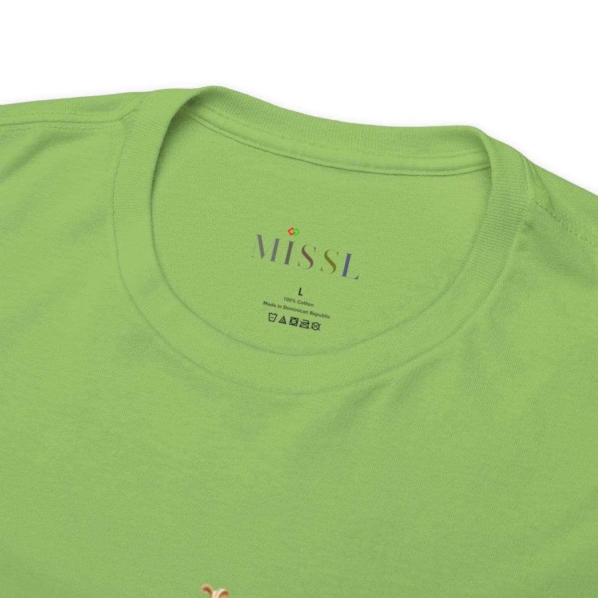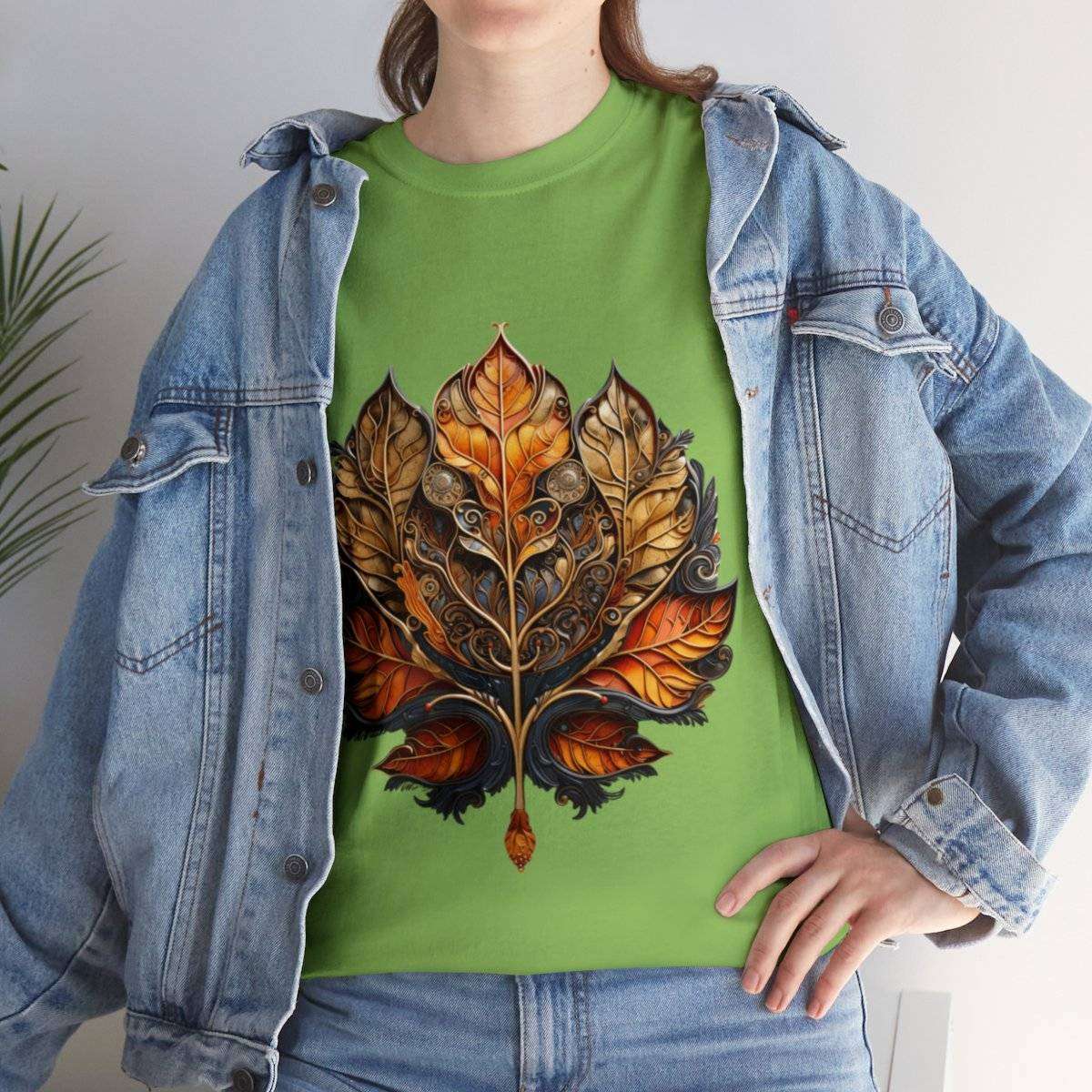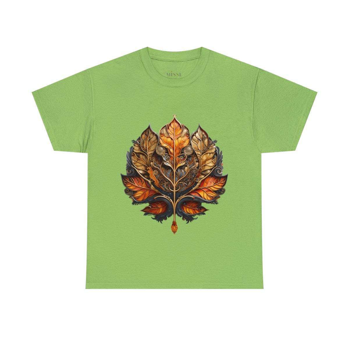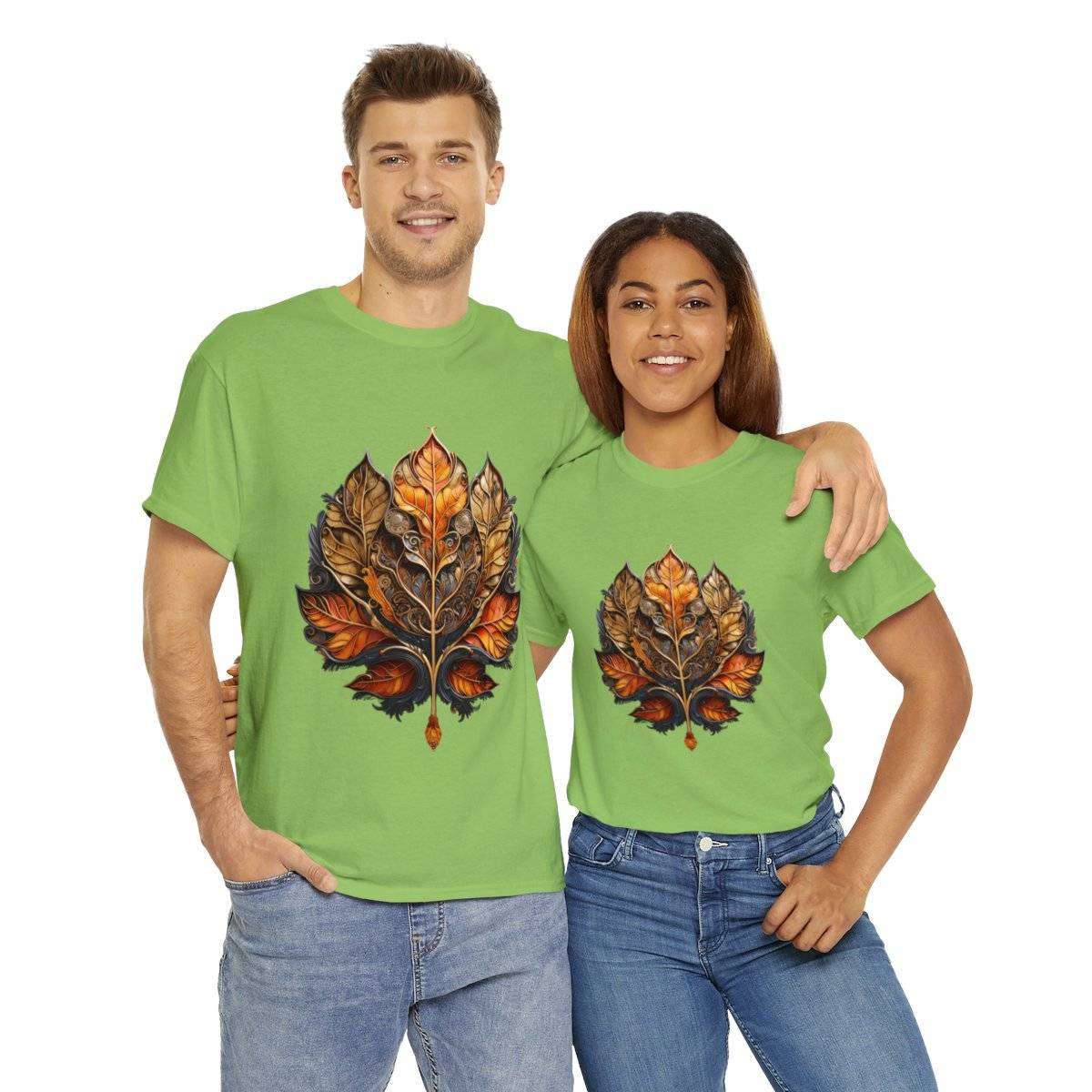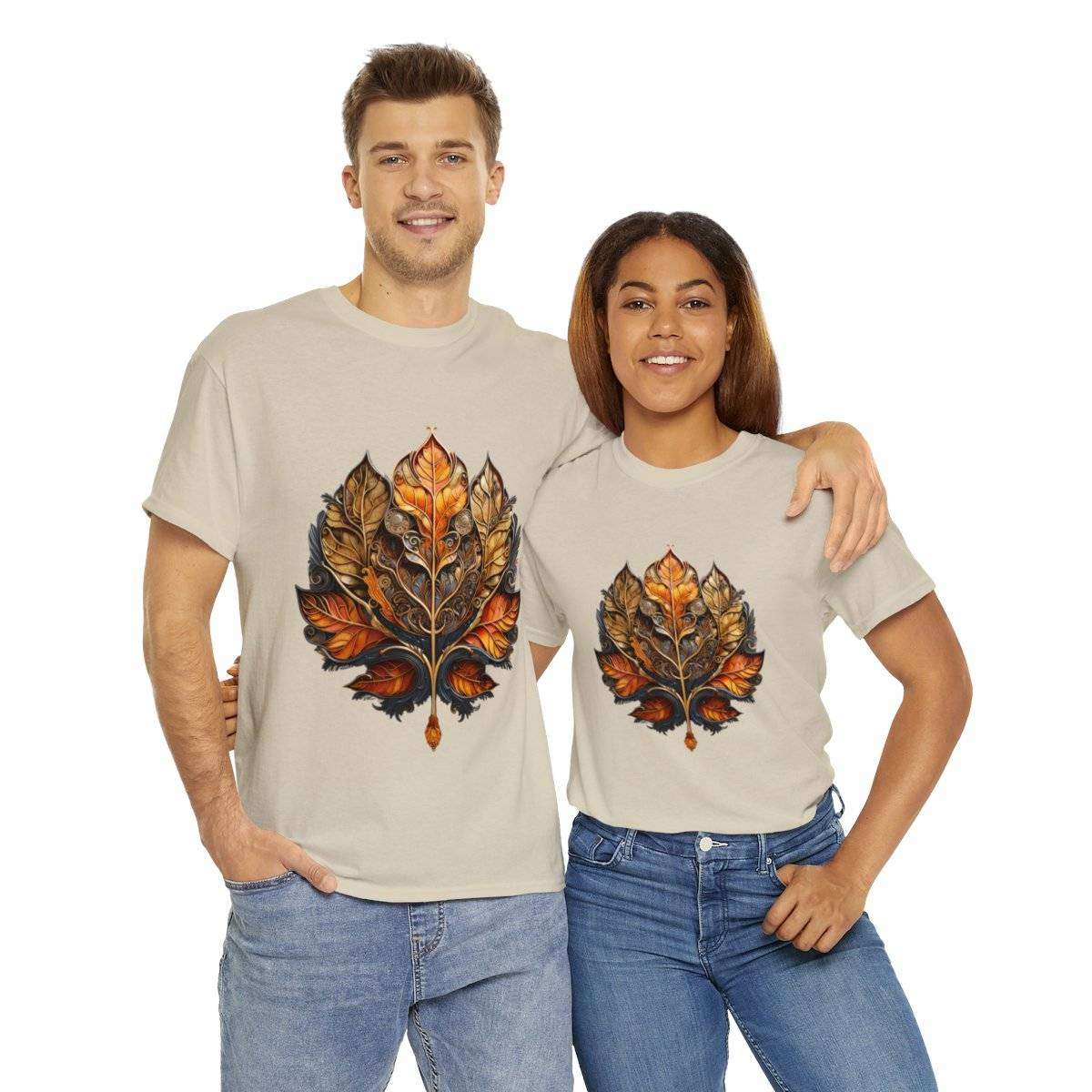 On the front of the tee, you’ll find a unique design, a tree leaf shaped like a shield, adorned with the warm and inviting colors of autumn. It’s a simple yet powerful visual that celebrates the robust and transformative nature of the season.