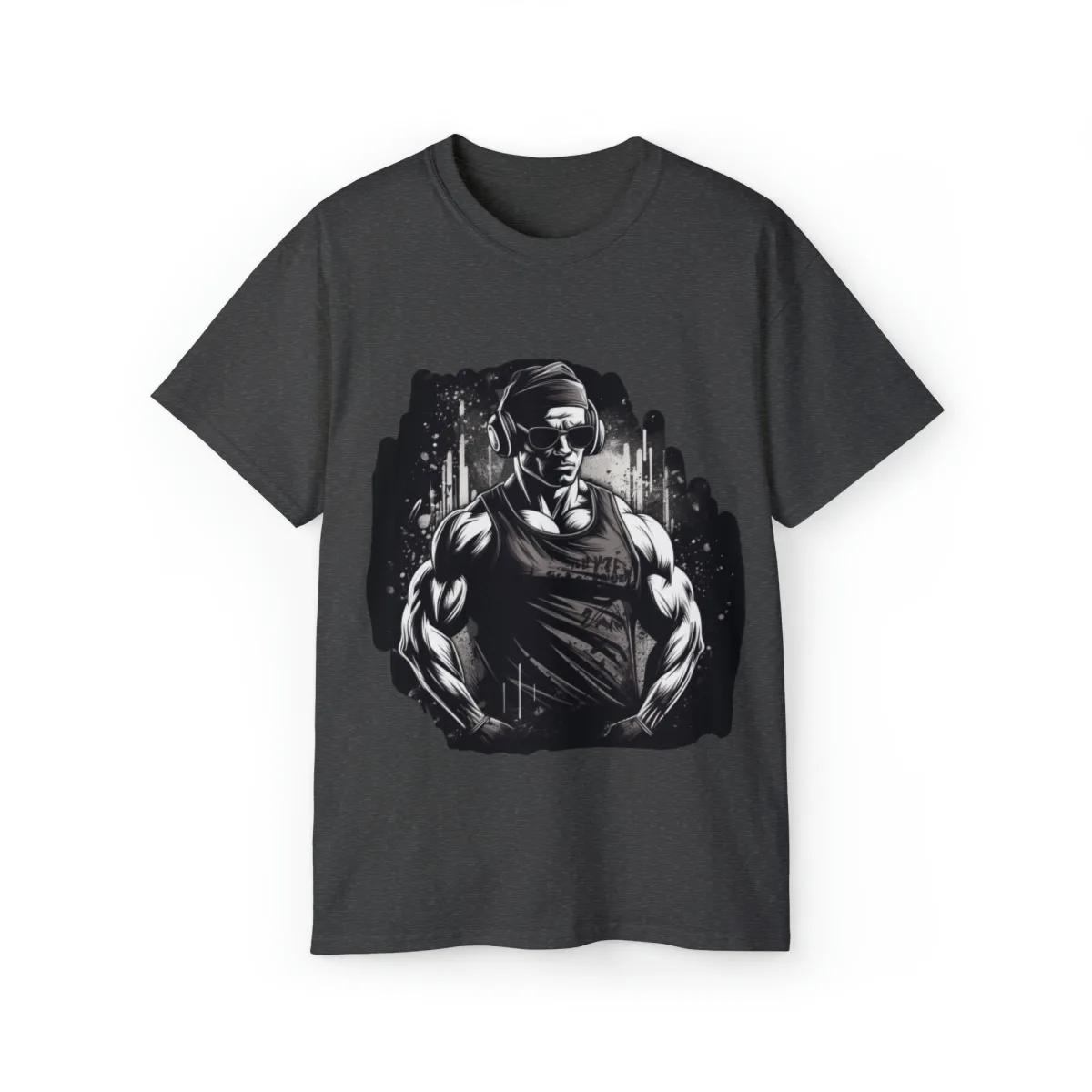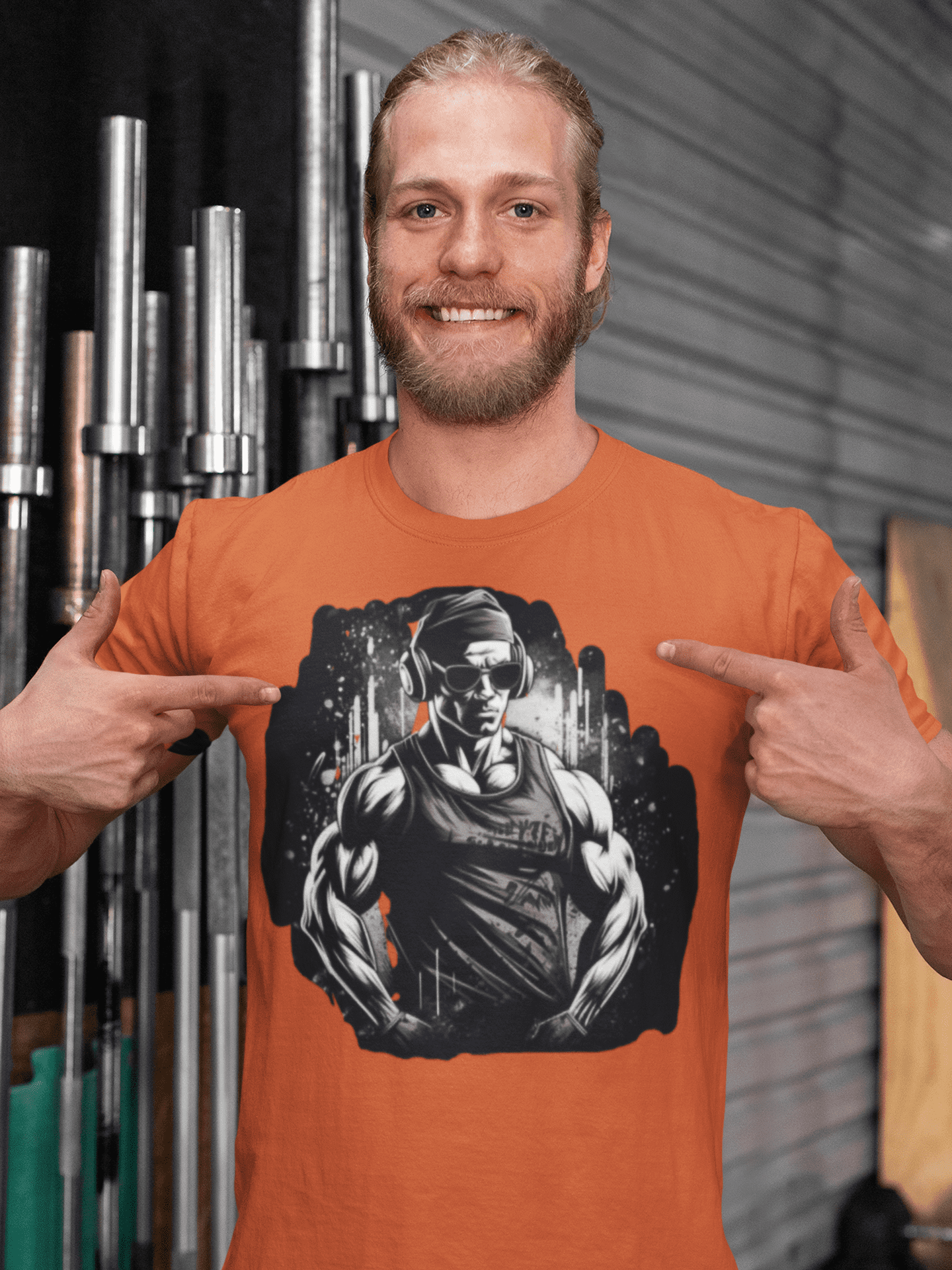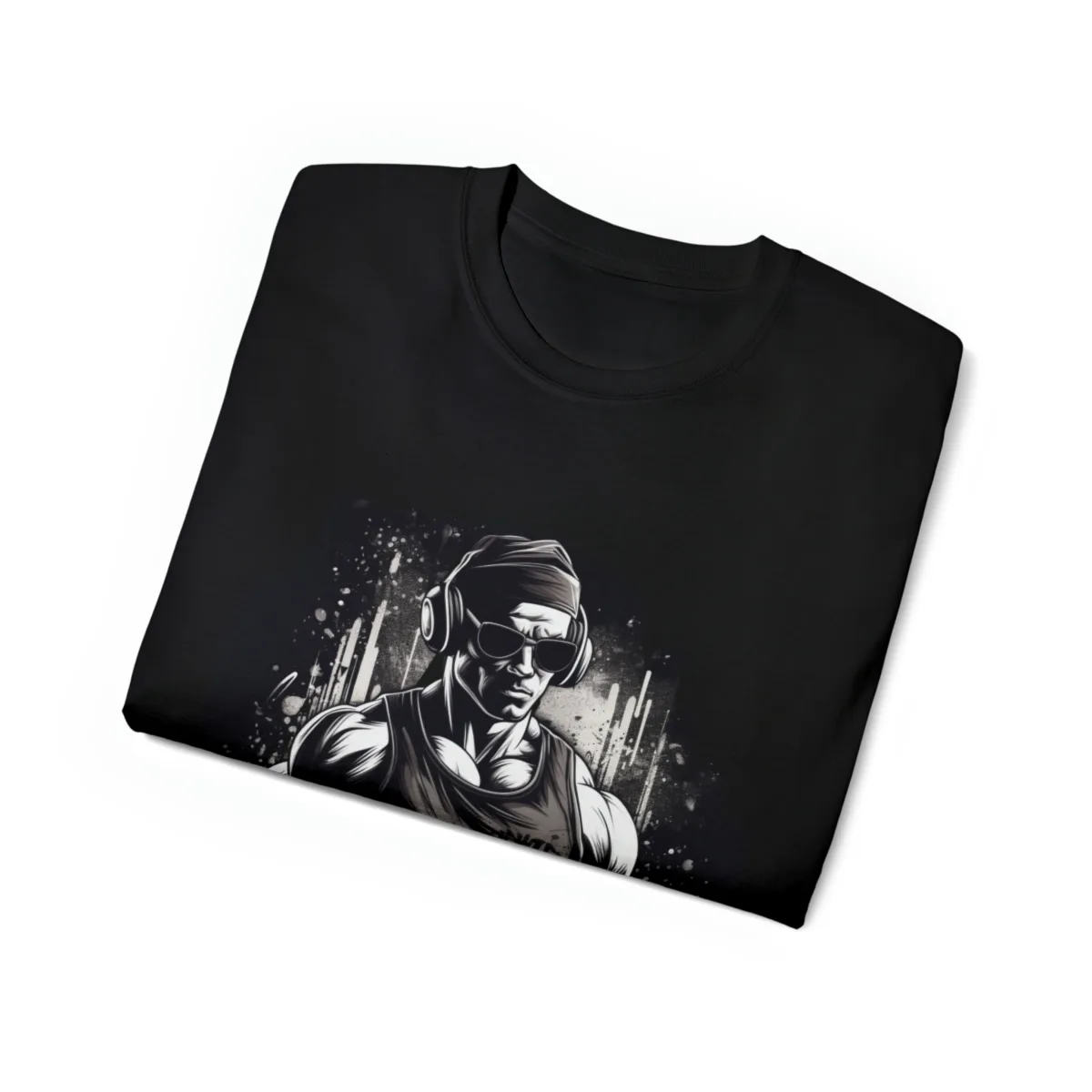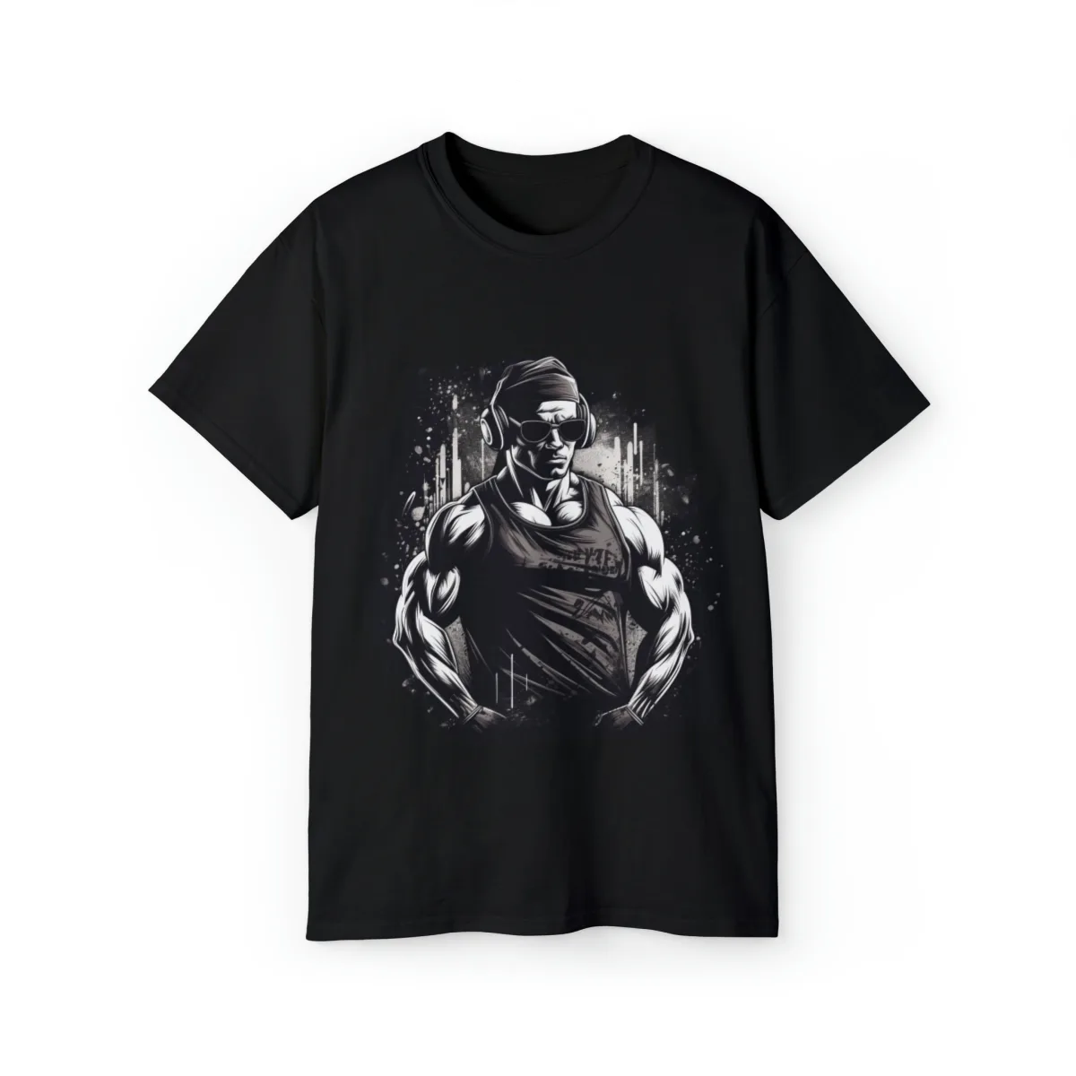 Elevate your gym style with the “Cool Gym T-shirt.” This trendy tee features a bold design of a bodybuilder sporting headphones and sunglasses on the front, making a statement that’s both stylish and motivating.