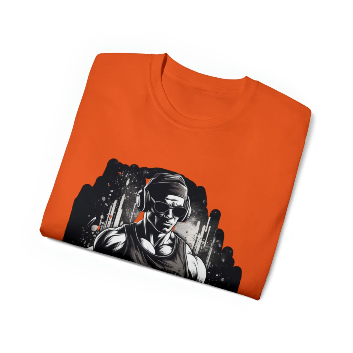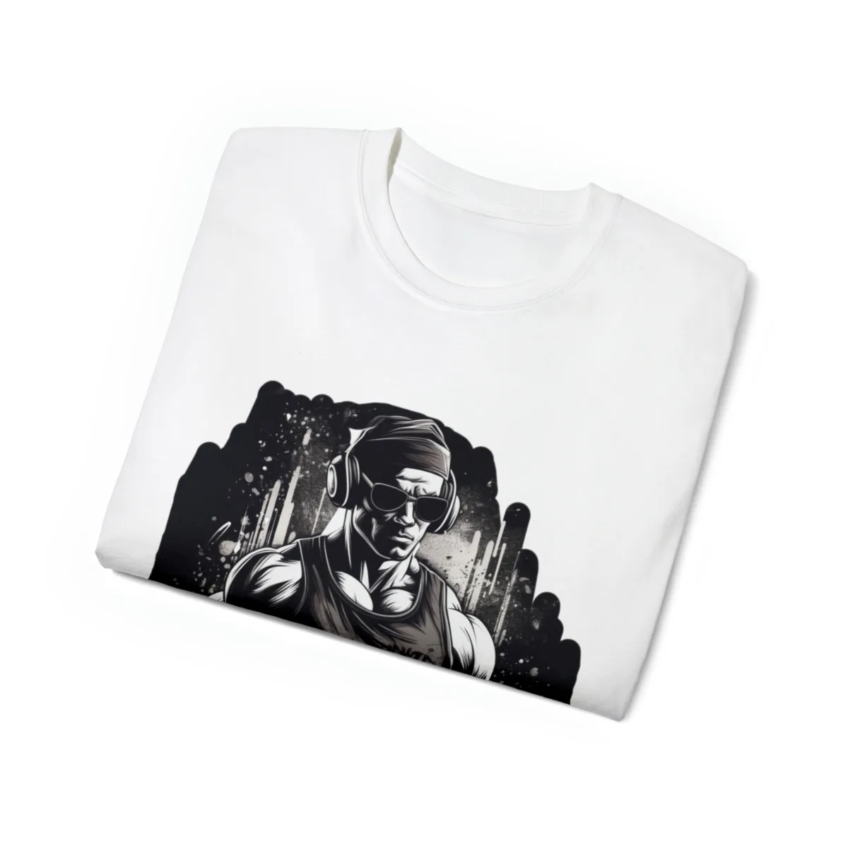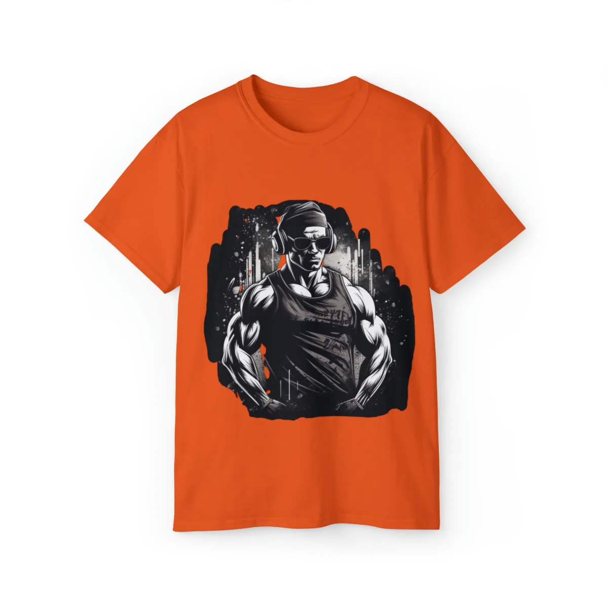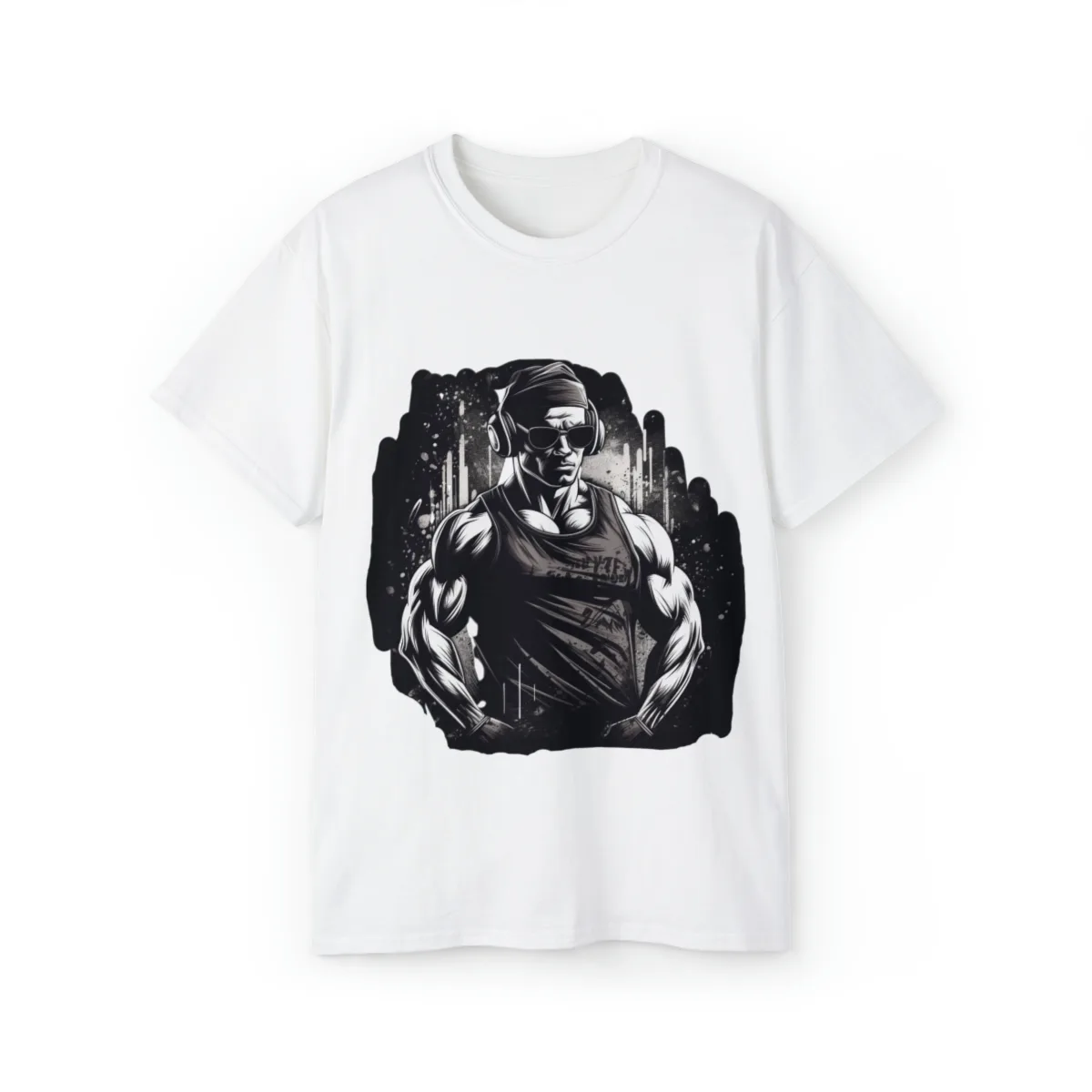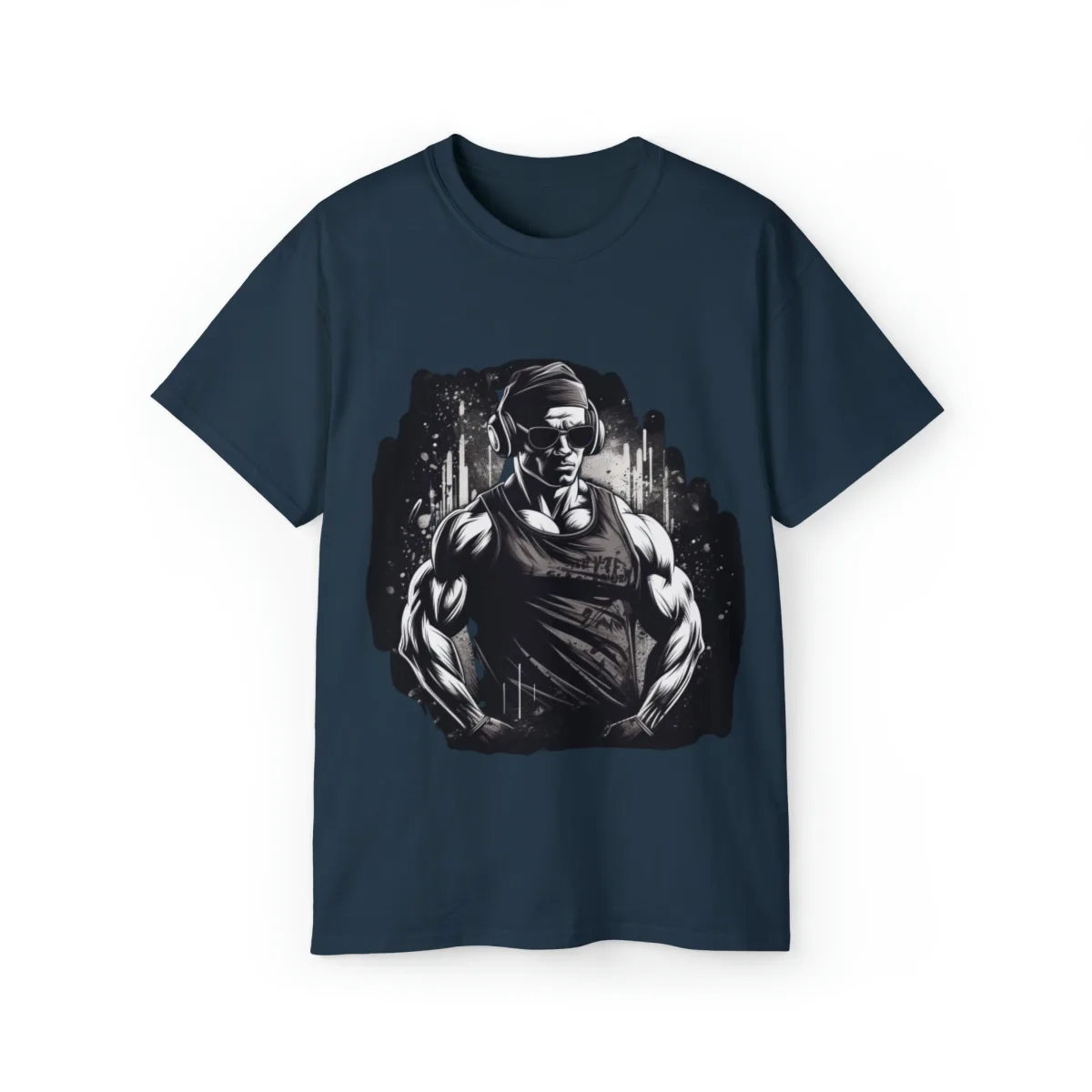 Elevate your gym style with the “Cool Gym T-shirt.” This trendy tee features a bold design of a bodybuilder sporting headphones and sunglasses on the front, making a statement that’s both stylish and motivating.