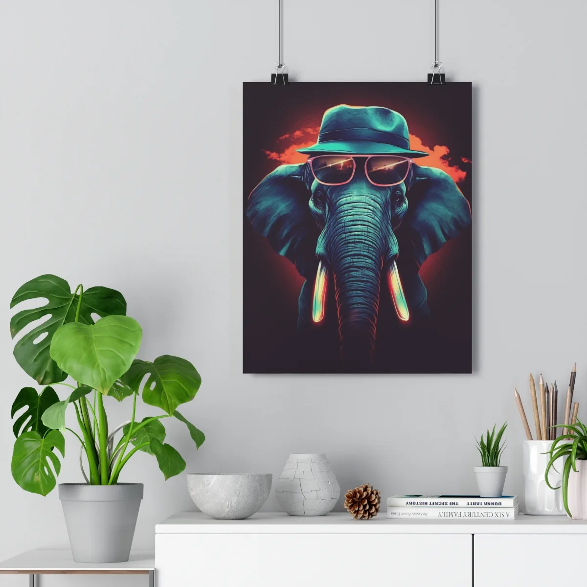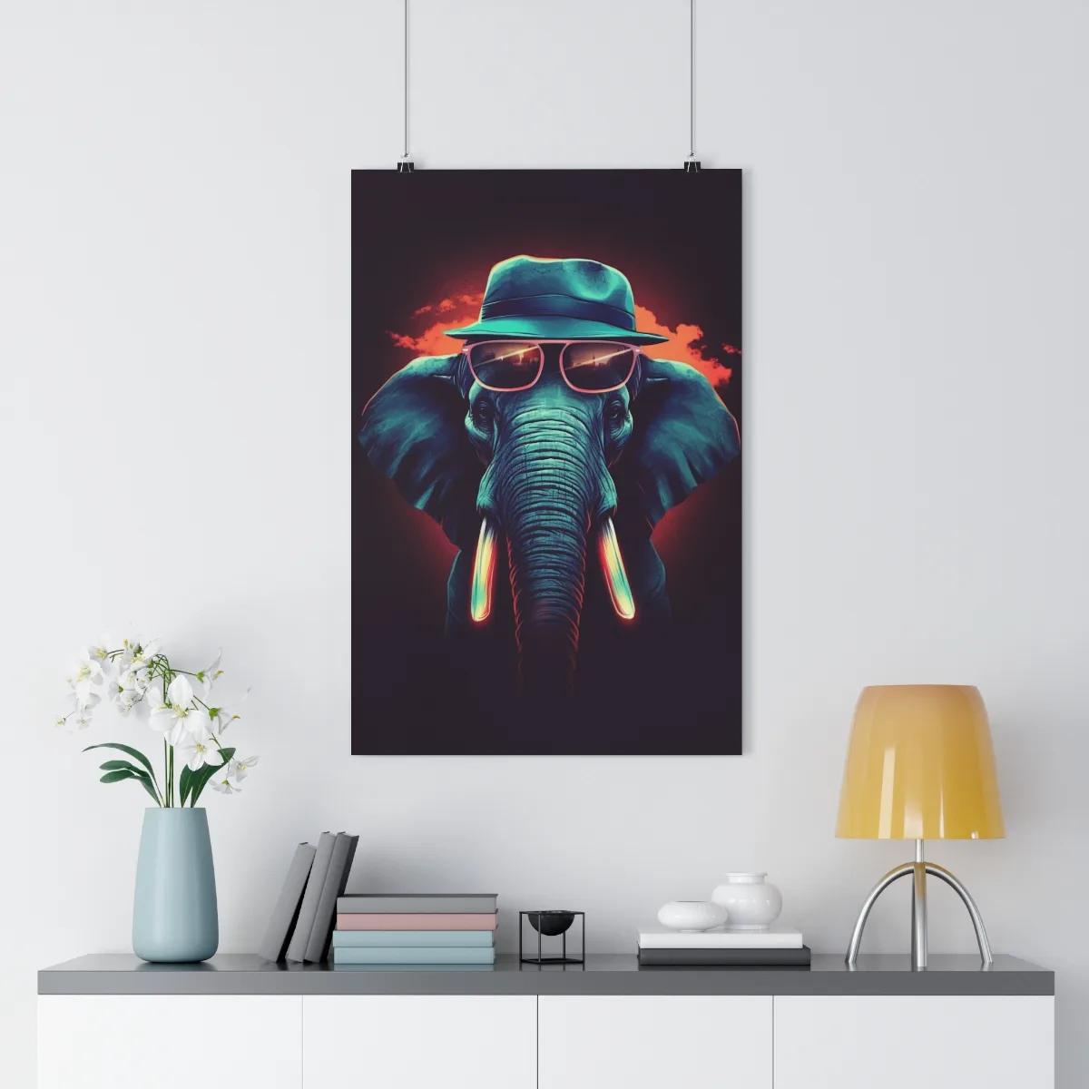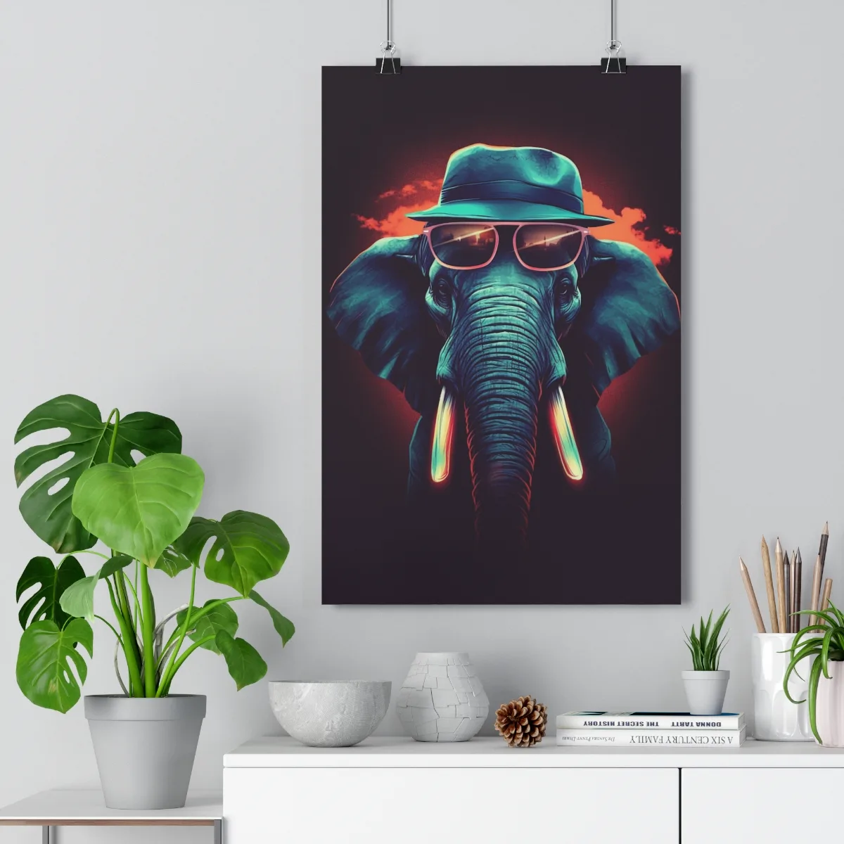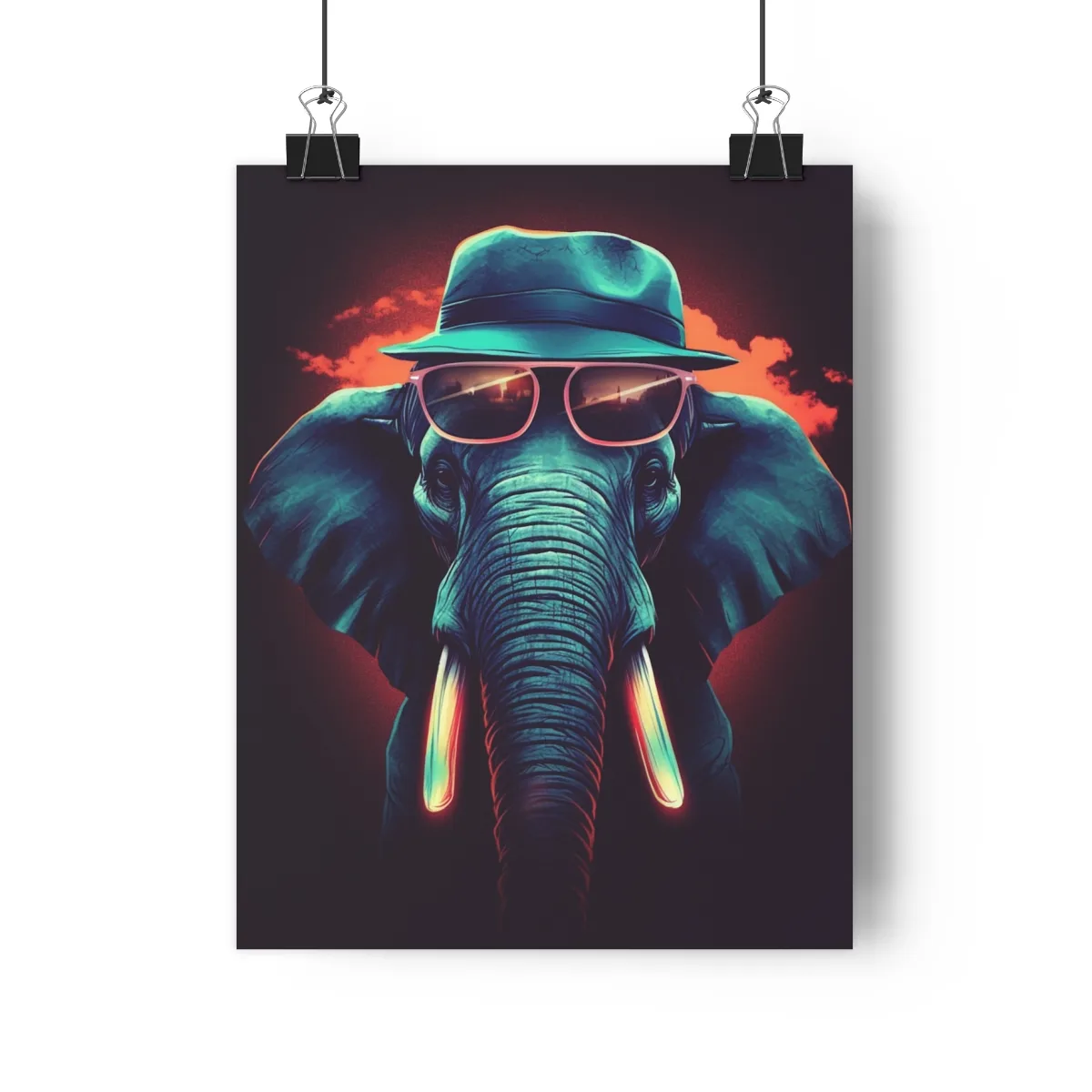 Discover our “Elephant Premium Poster,” a charming piece of AI-generated art that adds a playful touch to your decor. The poster features a stylish elephant wearing a hat and sunglasses, radiating sophistication and whimsy.