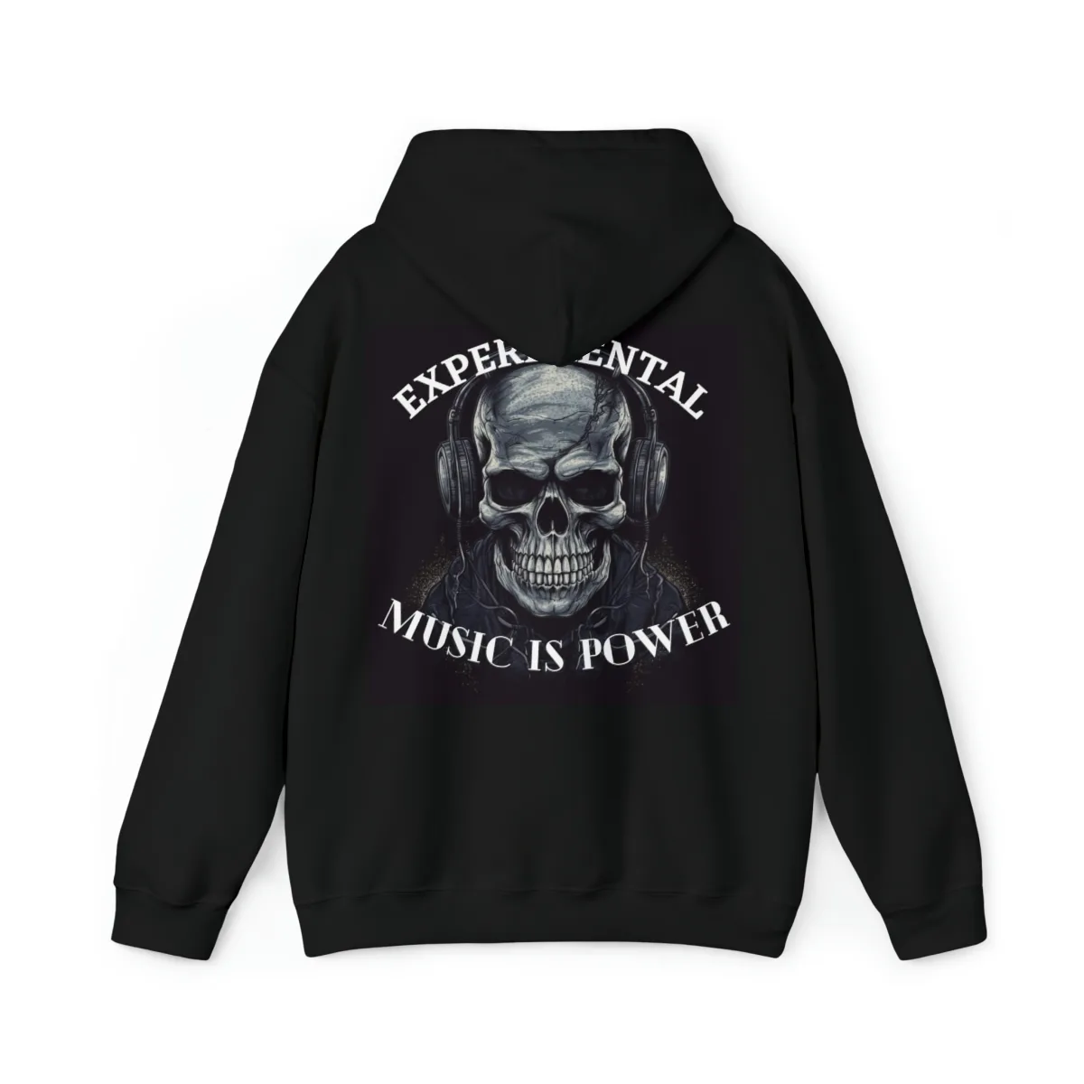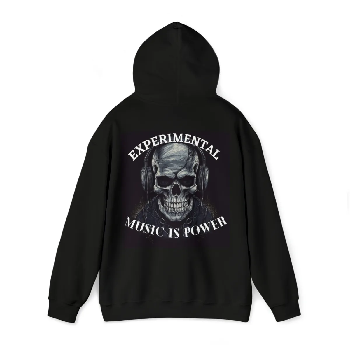 Immerse yourself in the world of music with our “Unisex Music Hooded Sweatshirt.” This stylish hoodie features a captivating design on the backside—a skull adorned with headphones, surrounded by the empowering phrase, “Experimental Music is Power.”