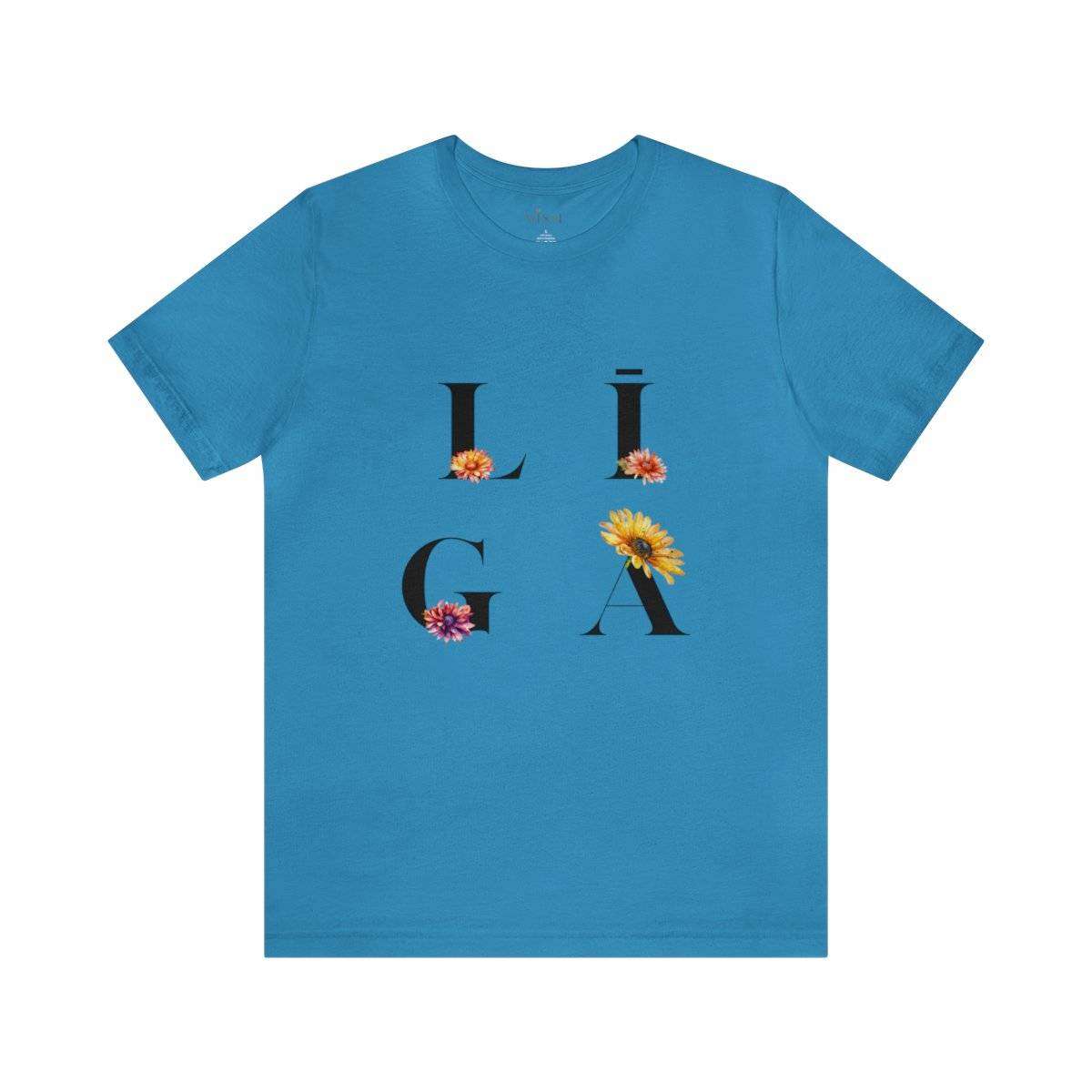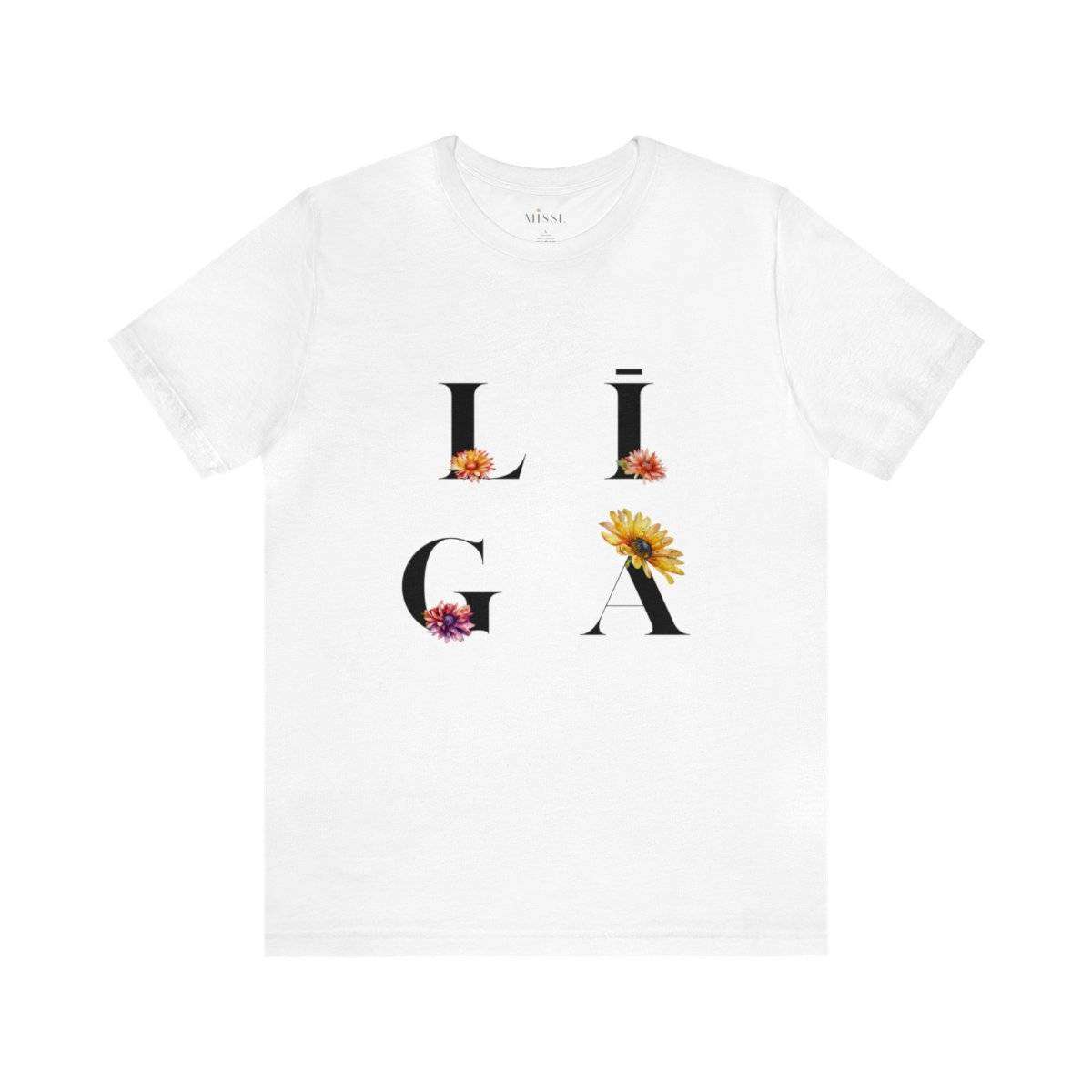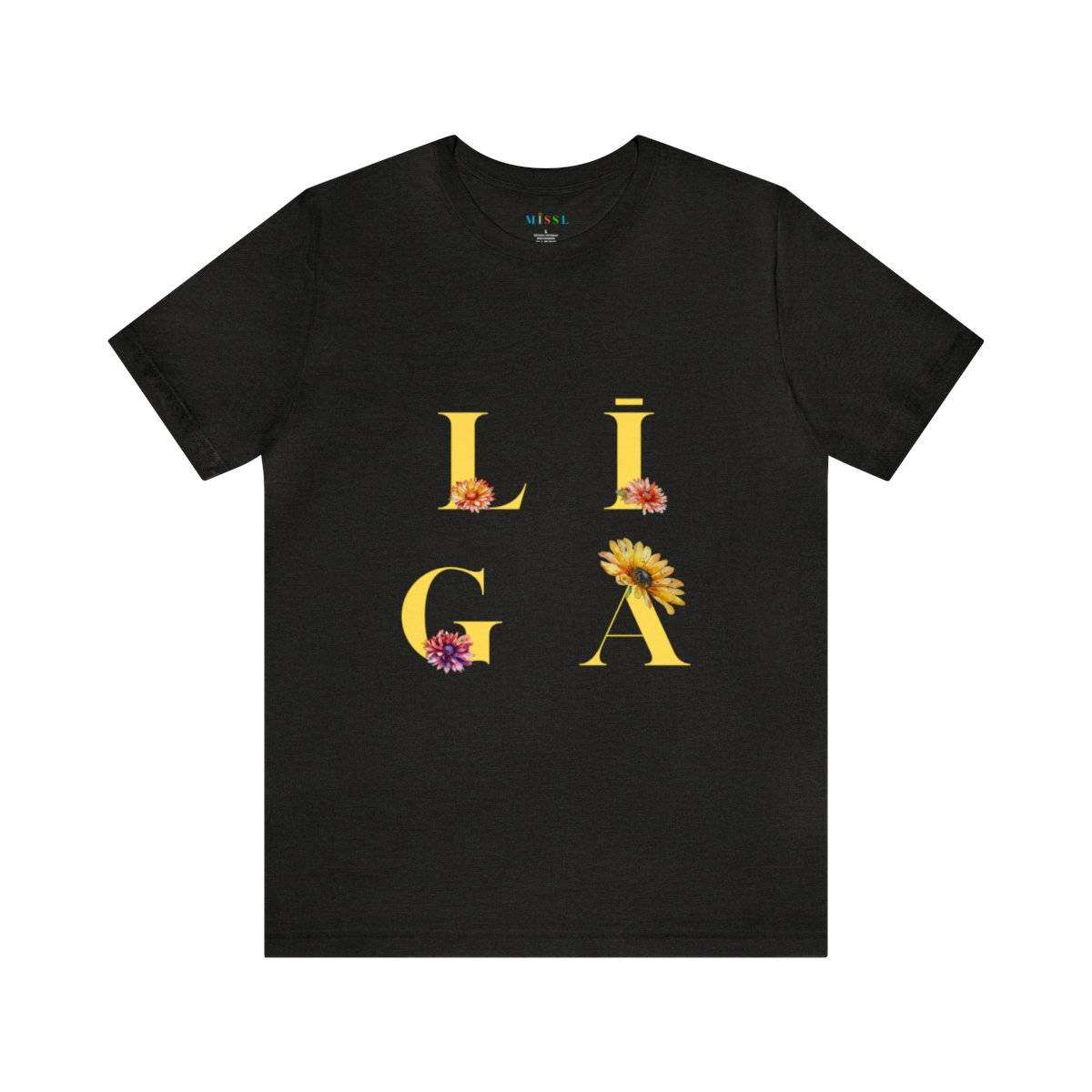 This tee is a celebration of creativity and tradition, where ‘Līga’ blooms with floral elegance. Each letter represents a vibrant flower, adding a unique touch to this stylish and festive garment.