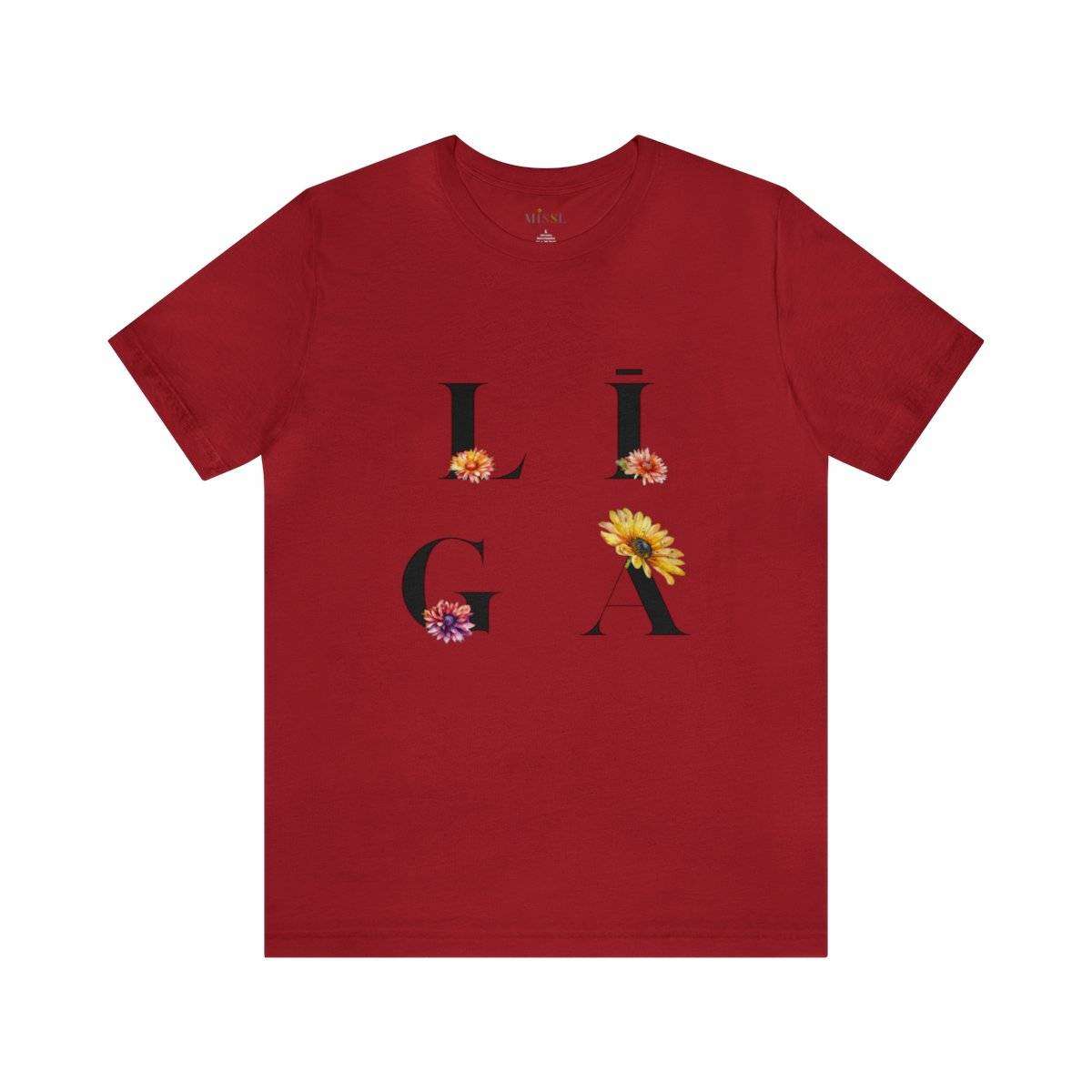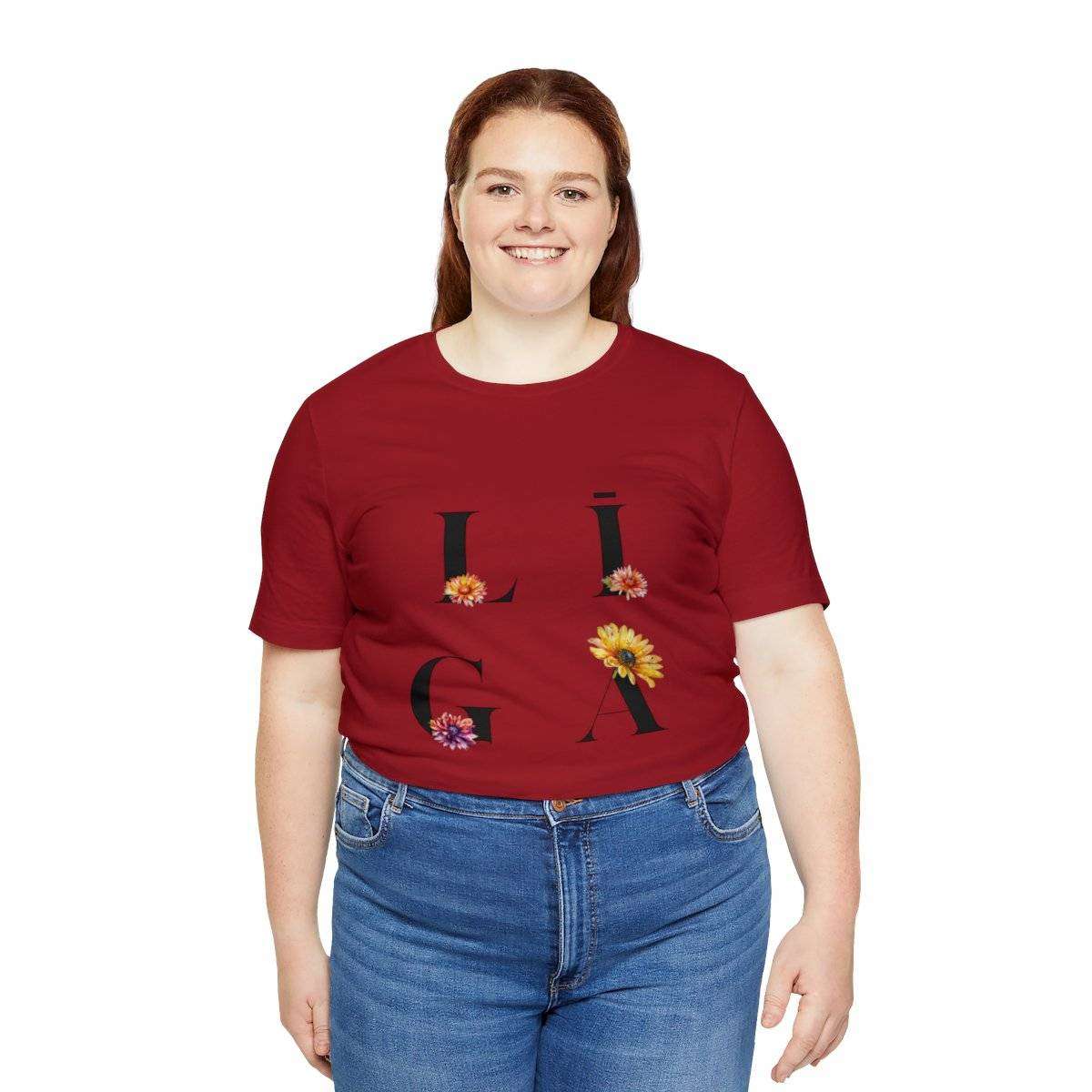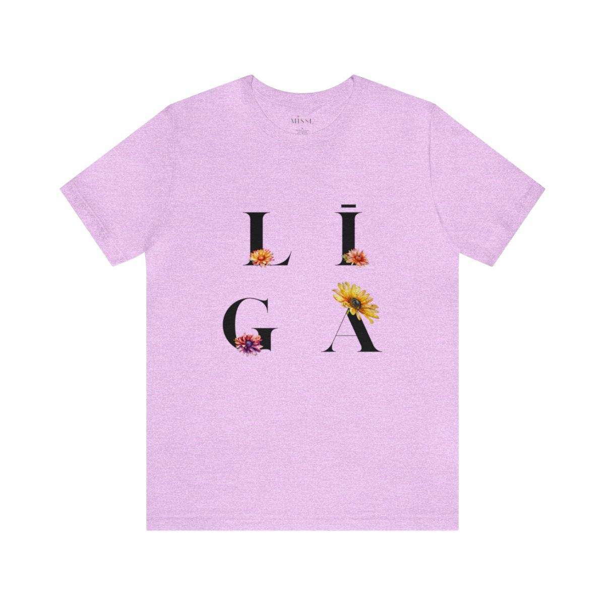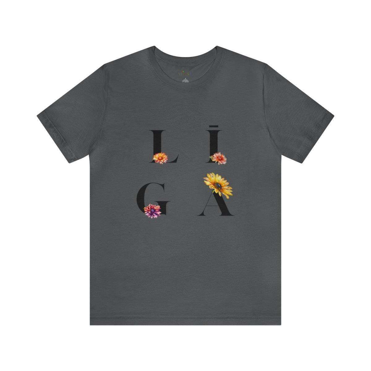 This tee is a celebration of creativity and tradition, where ‘Līga’ blooms with floral elegance. Each letter represents a vibrant flower, adding a unique touch to this stylish and festive garment.