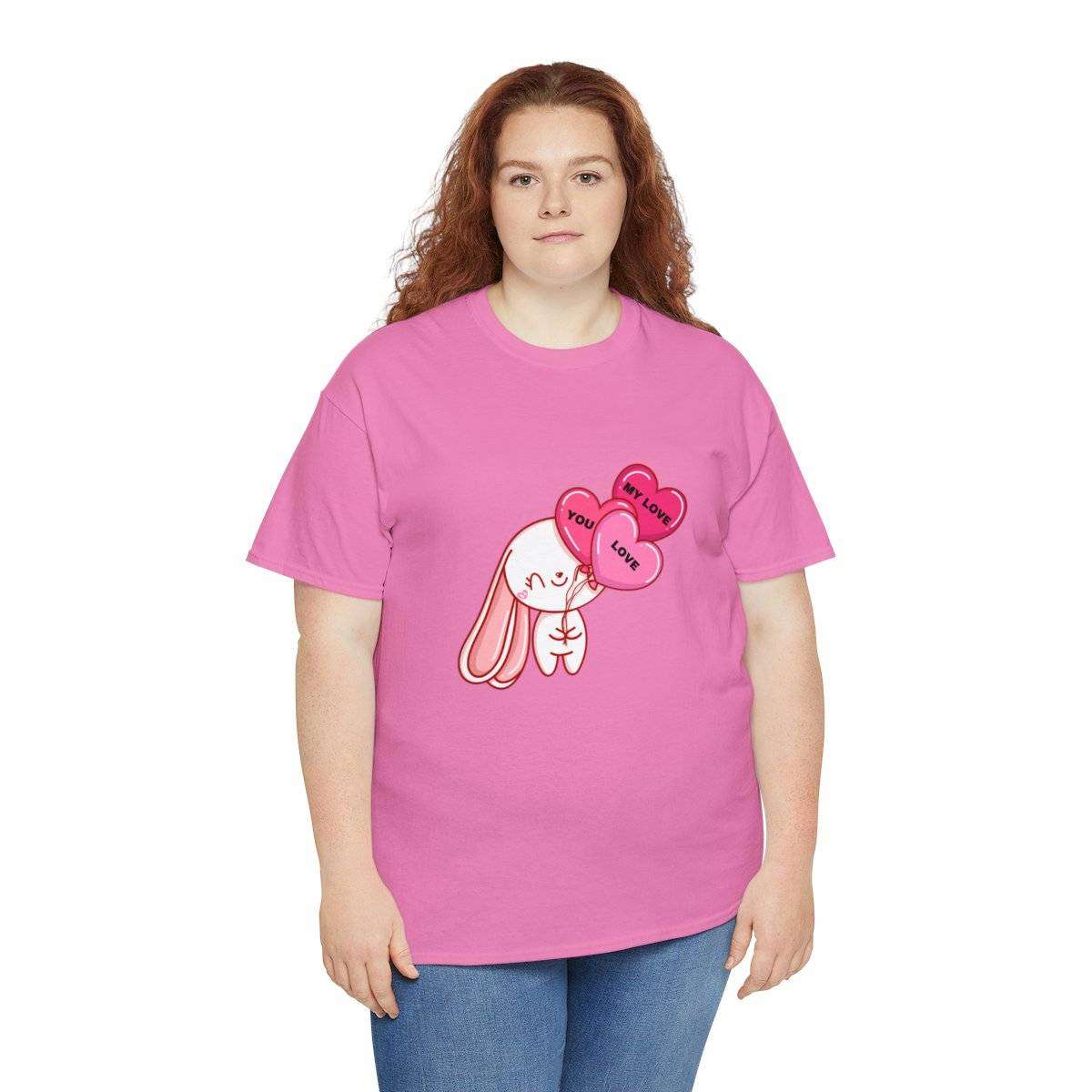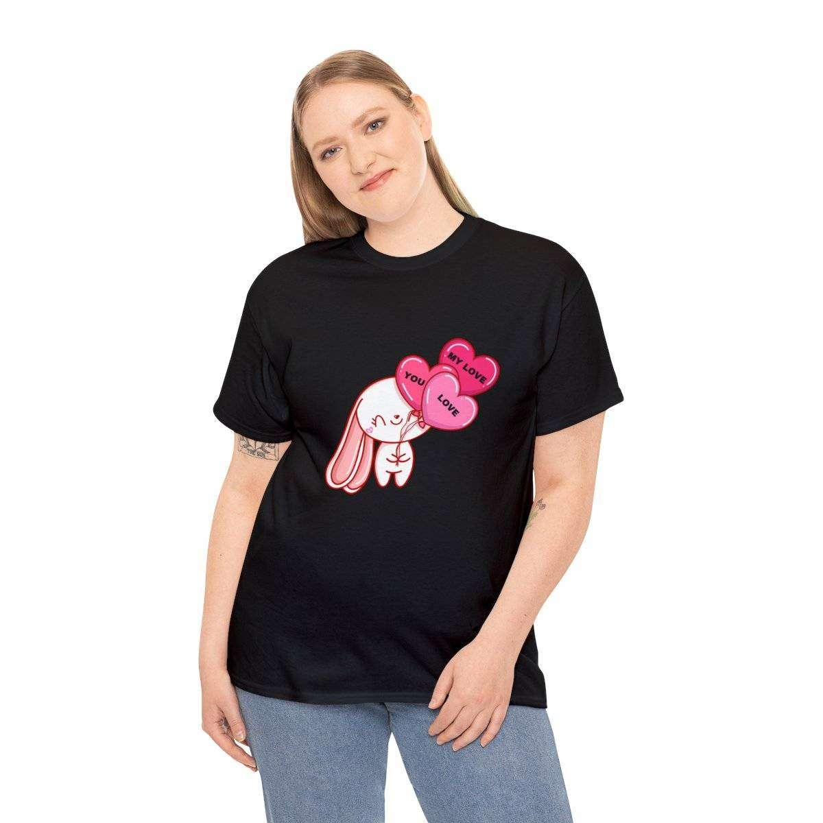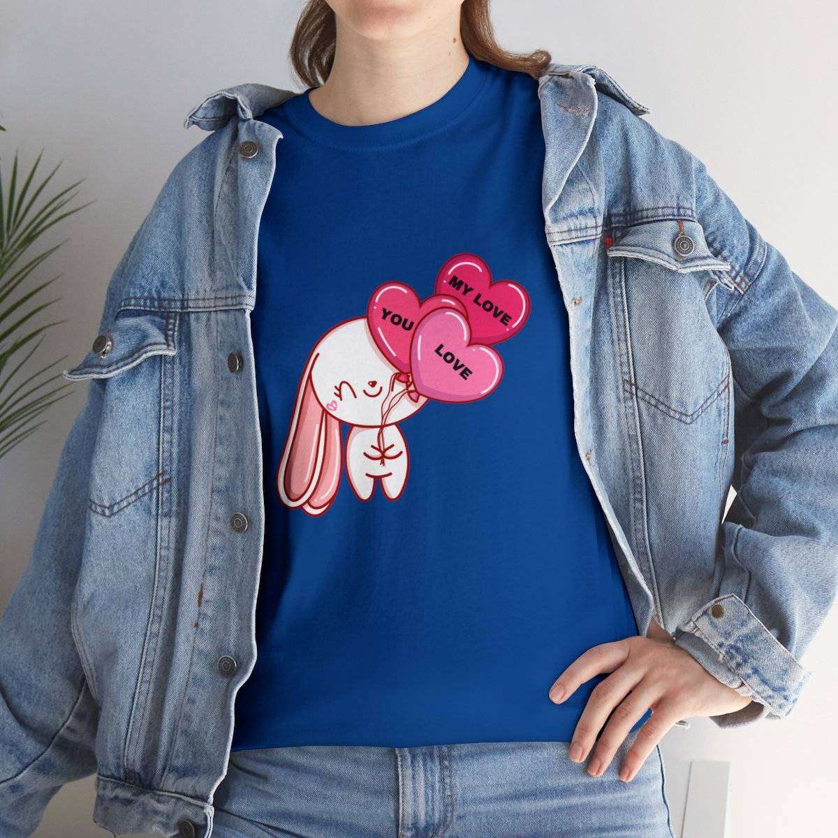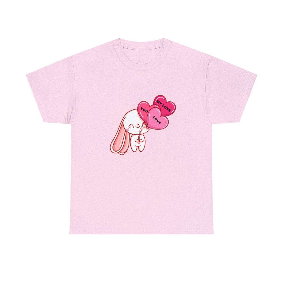 Crafted with a blend of charm and affection, this shirt embodies the sweetness of a loving sentiment. The delightful image of the rabbit with balloons, coupled with the heartfelt message, radiates warmth and tenderness, making it a perfect expression of adoration.