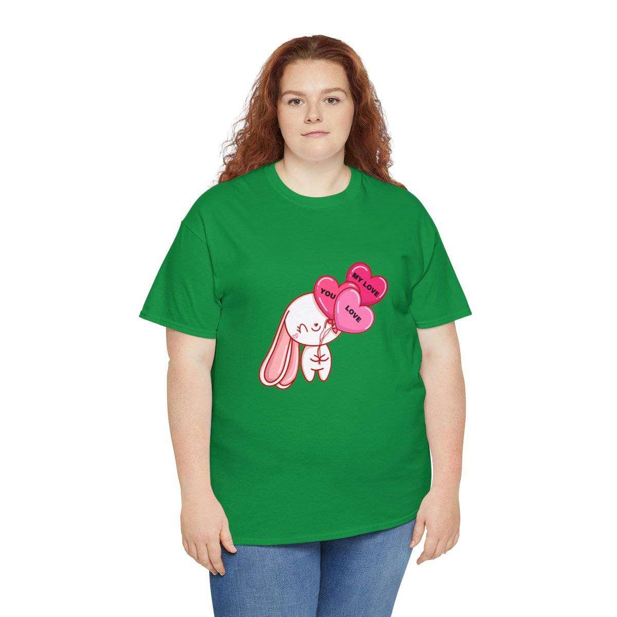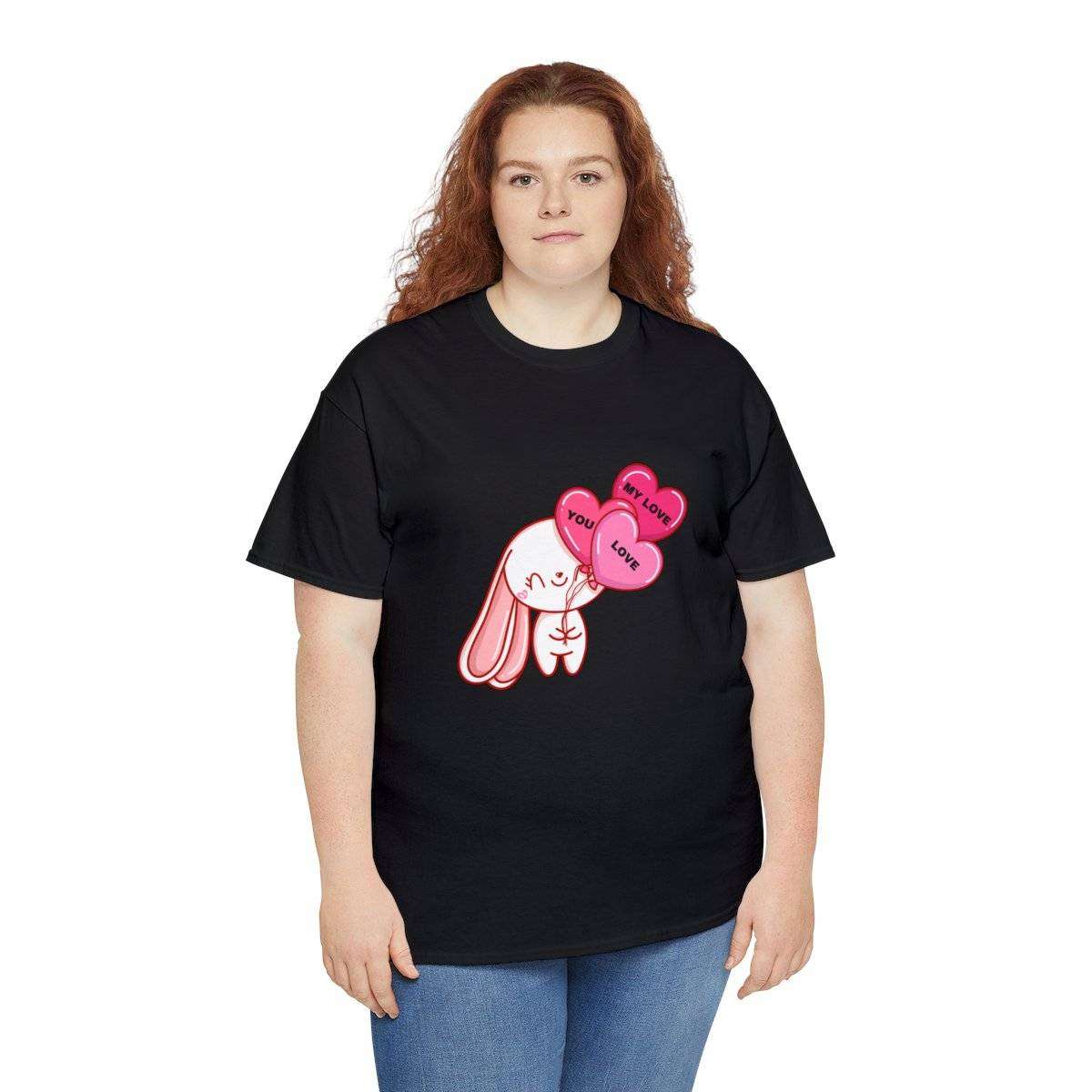 Introducing our New ‘My Love’ Woman Tee! The front of this adorable tee showcases a charming illustration of a cute rabbit holding balloons. The balloons carry the endearing message “My Love You Love”.