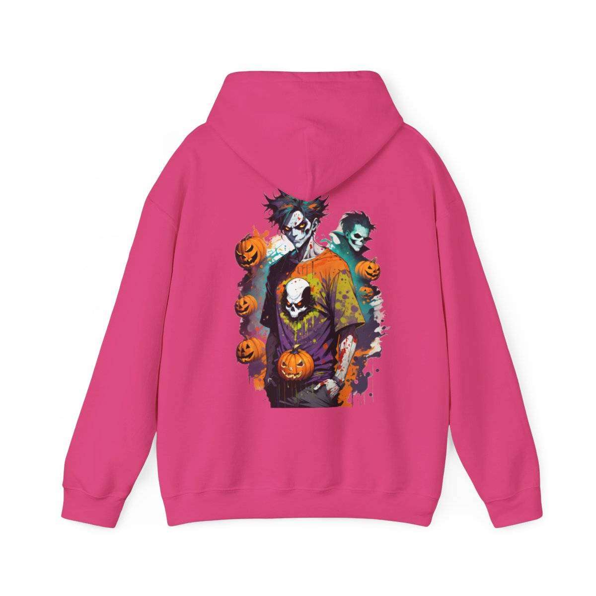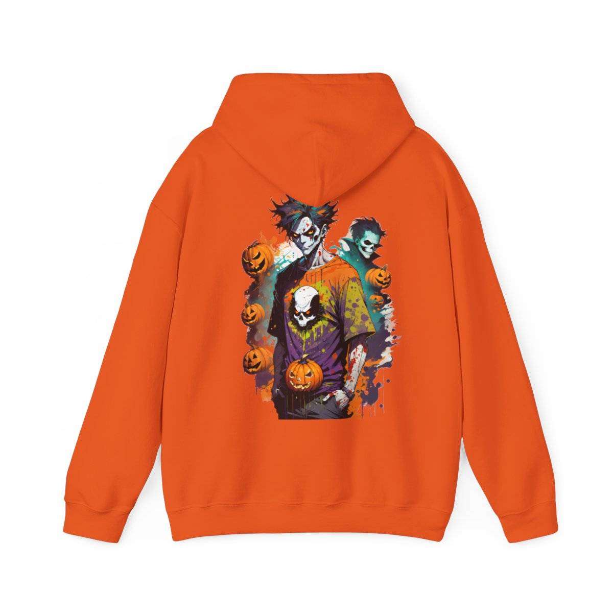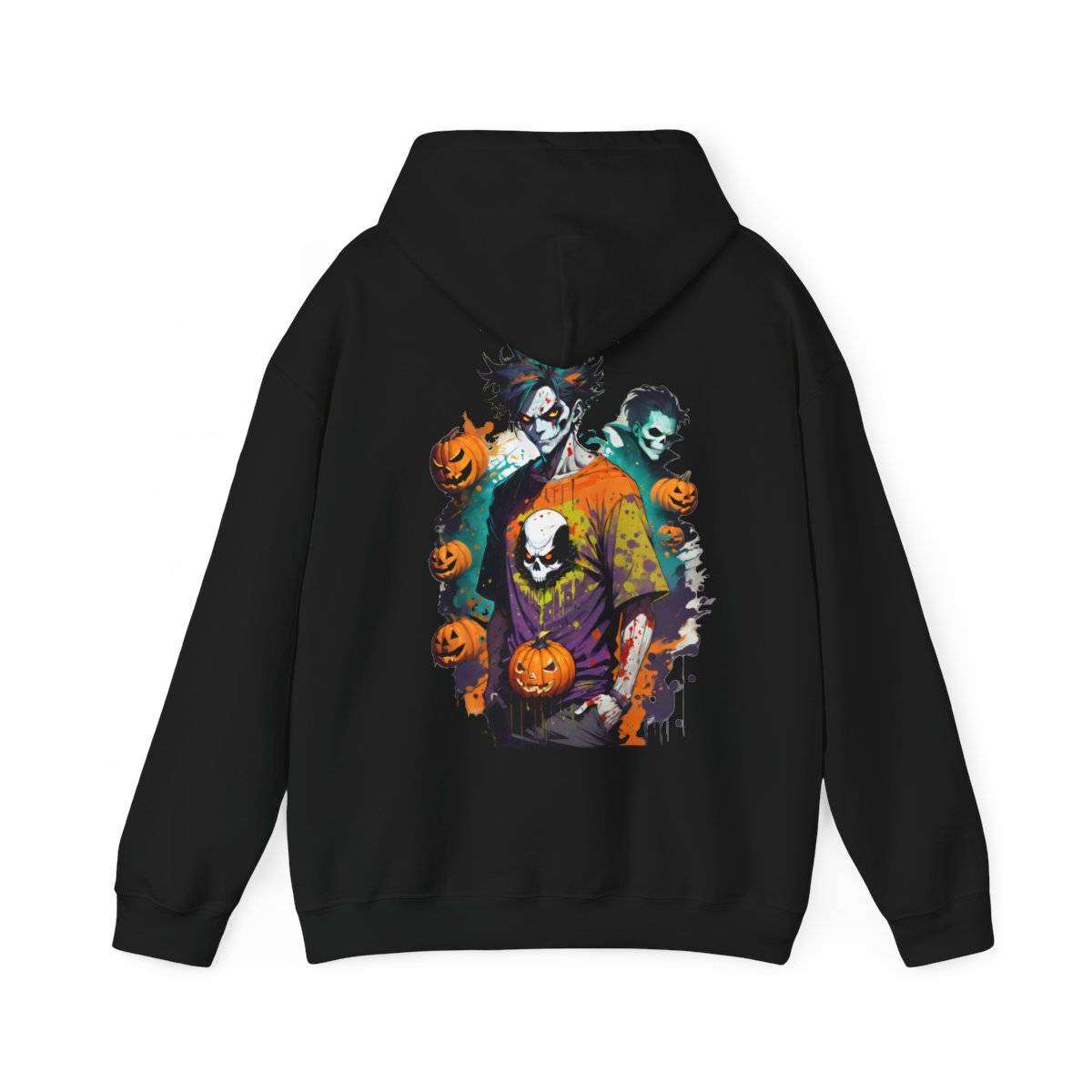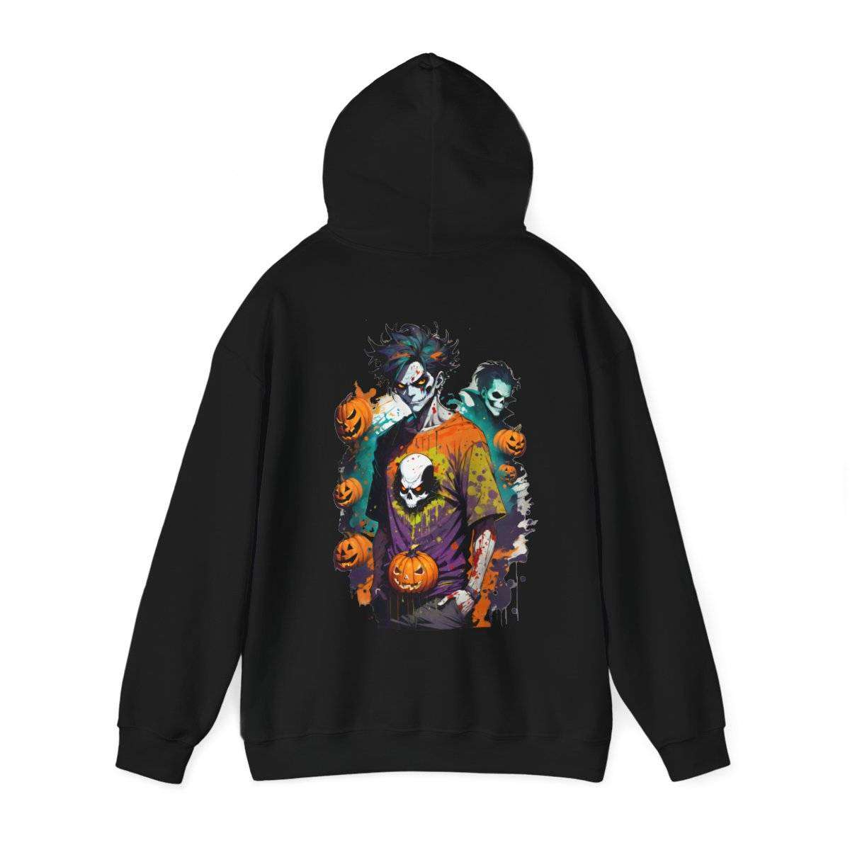 On the backside of this hoodie, you’ll find an intriguing design featuring two men with spooky white faces. They are surrounded by a circle of friendly jack-o’-lanterns, creating a captivating and eerie scene.