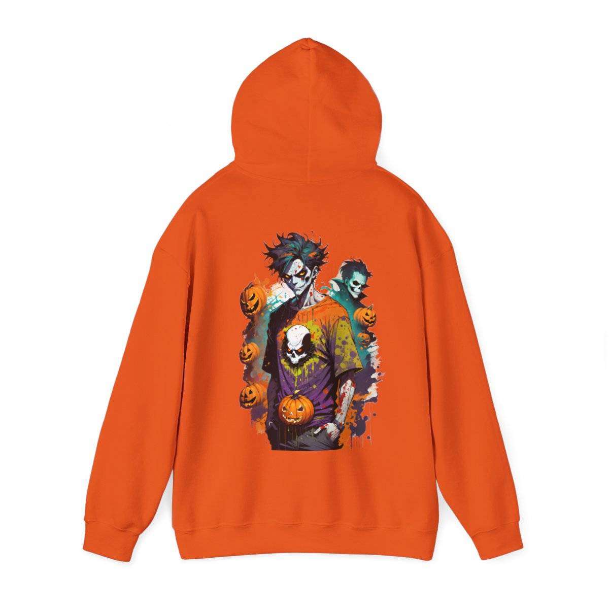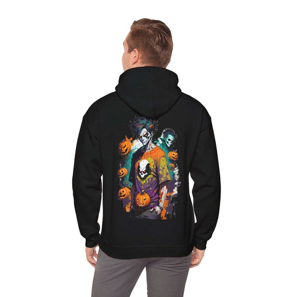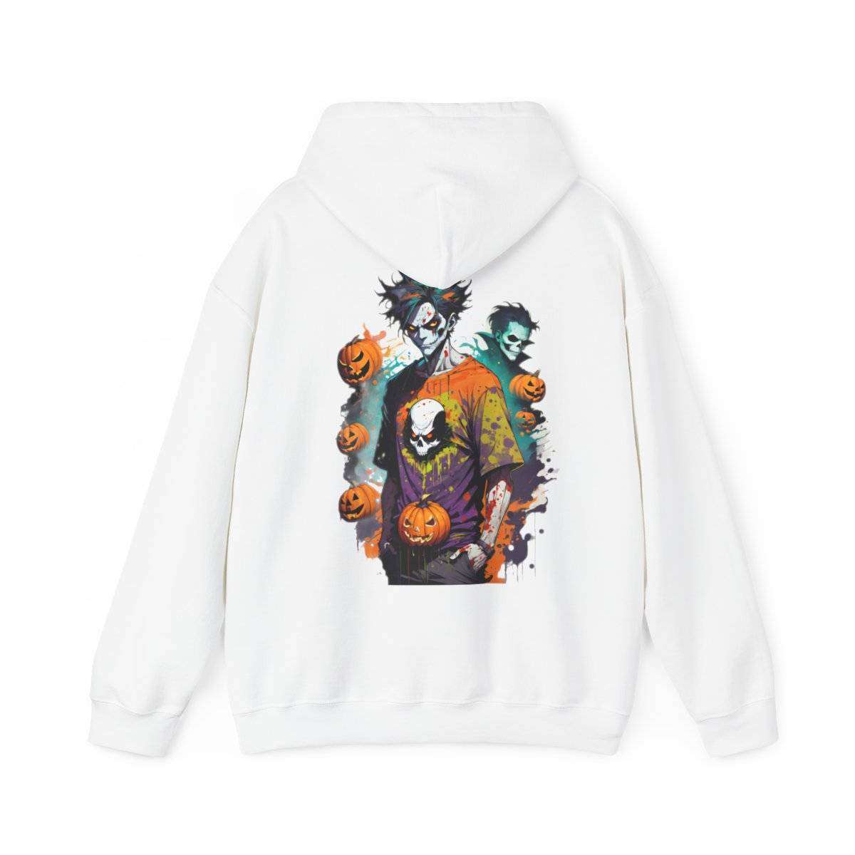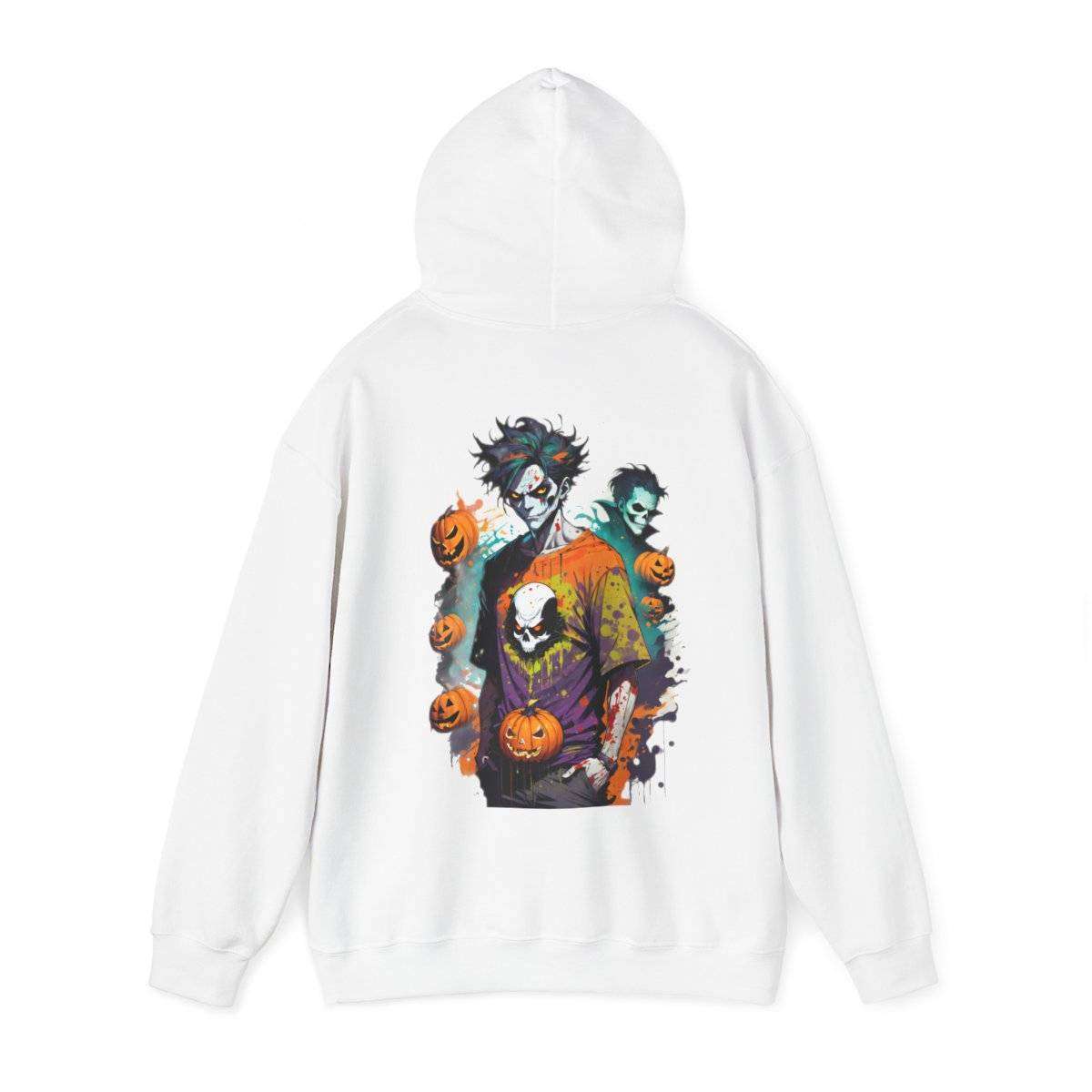 On the backside of this hoodie, you’ll find an intriguing design featuring two men with spooky white faces. They are surrounded by a circle of friendly jack-o’-lanterns, creating a captivating and eerie scene.