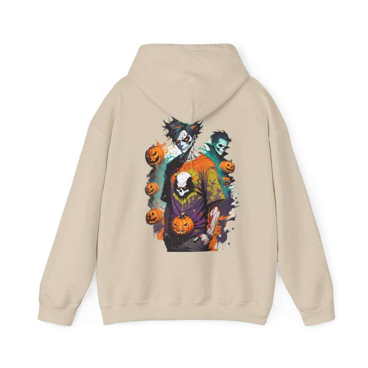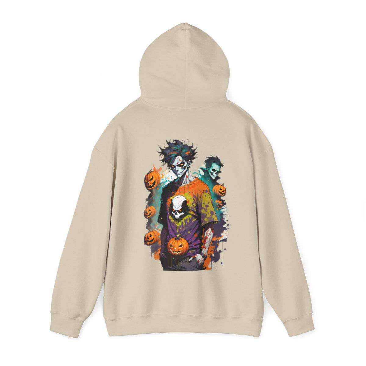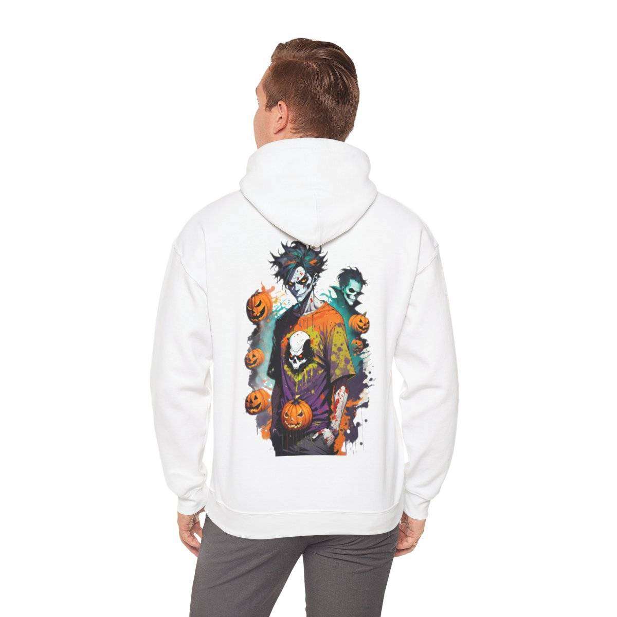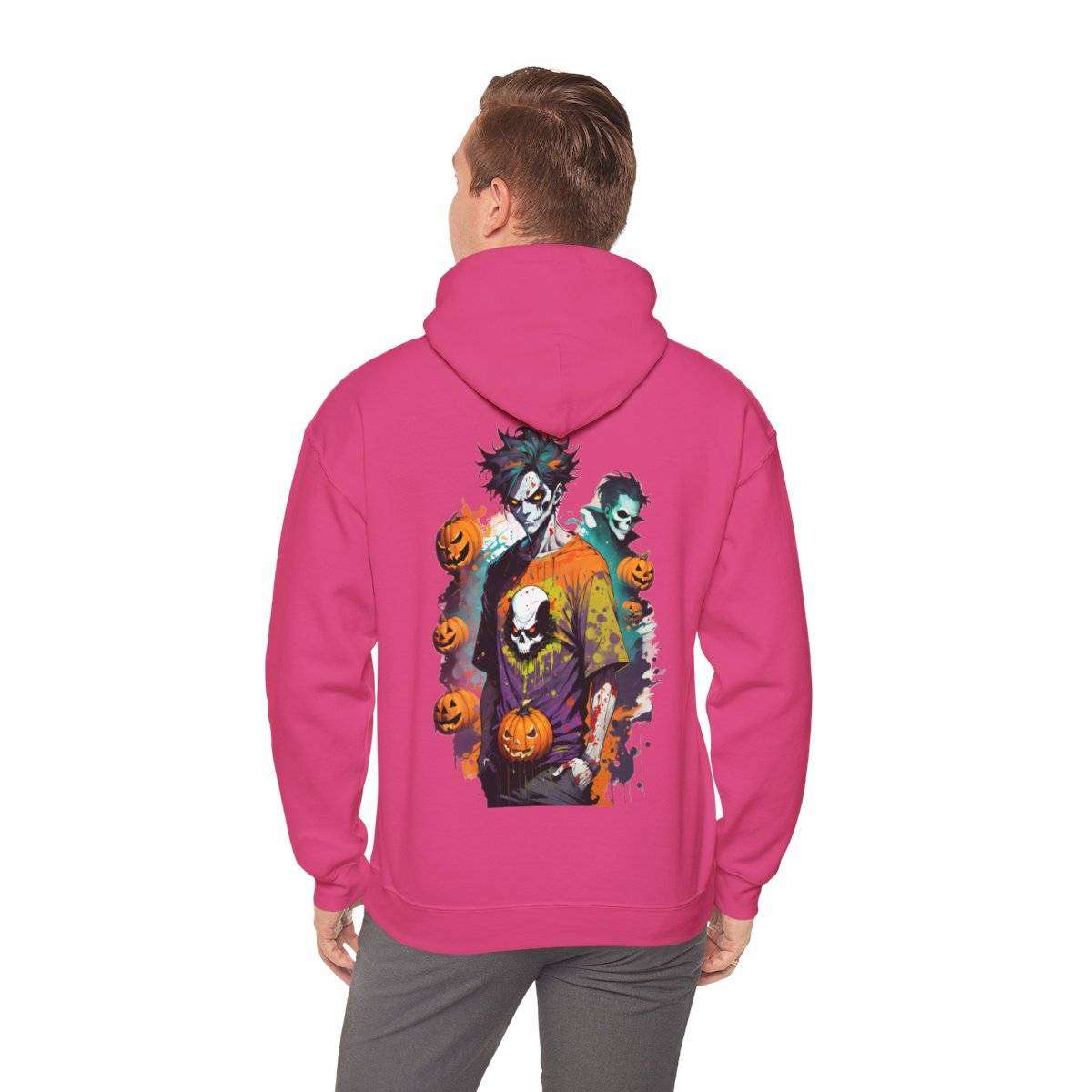 On the backside of this hoodie, you’ll find an intriguing design featuring two men with spooky white faces. They are surrounded by a circle of friendly jack-o’-lanterns, creating a captivating and eerie scene.