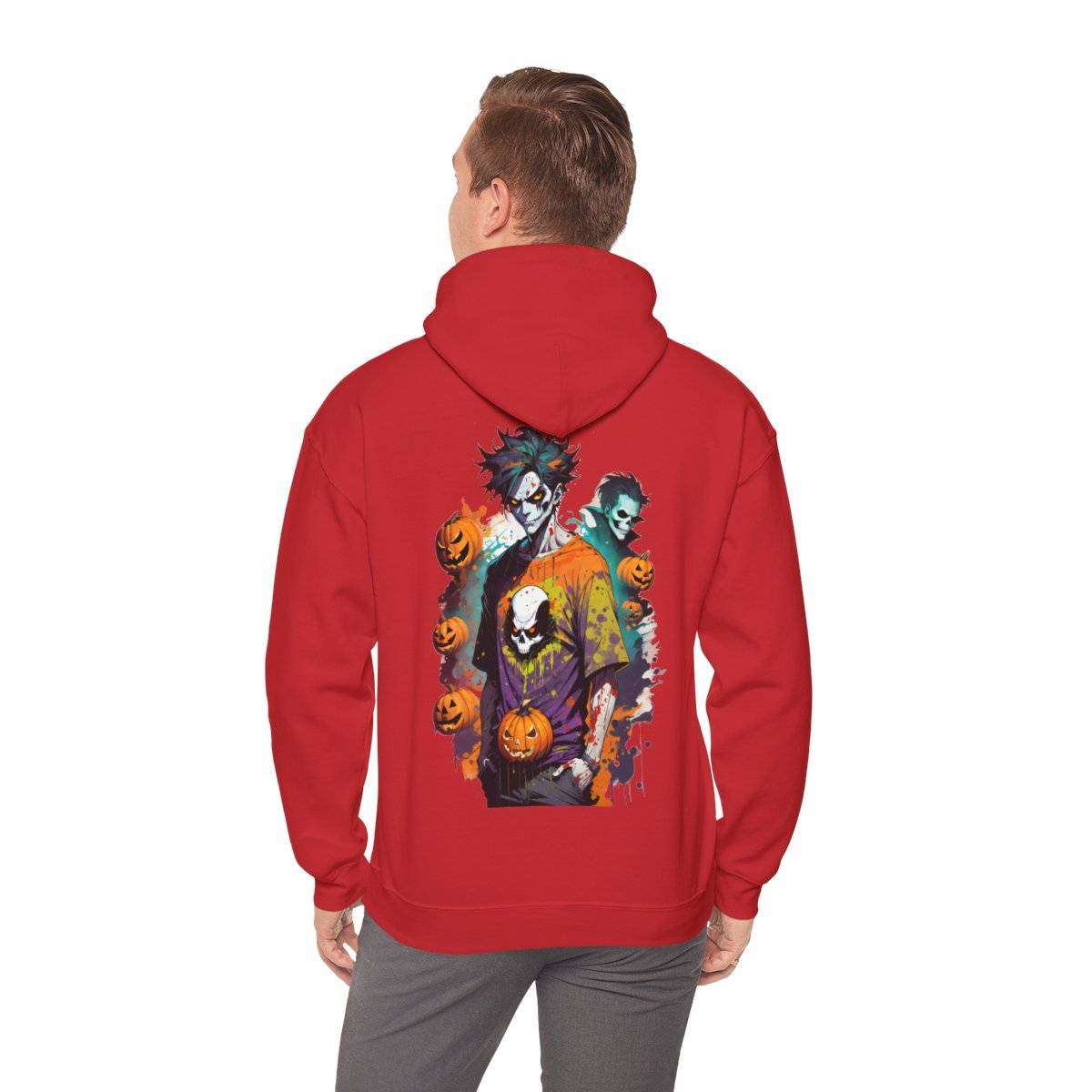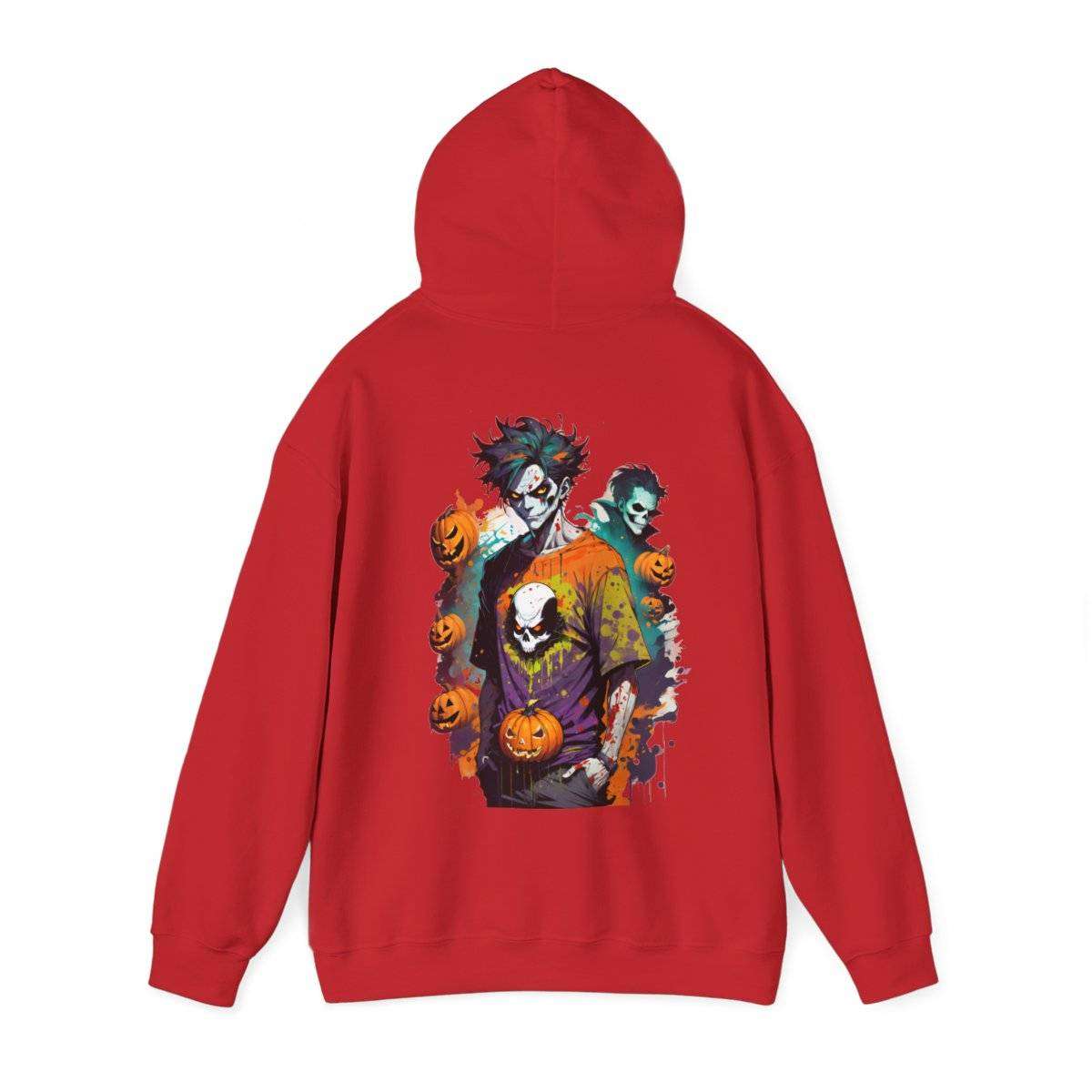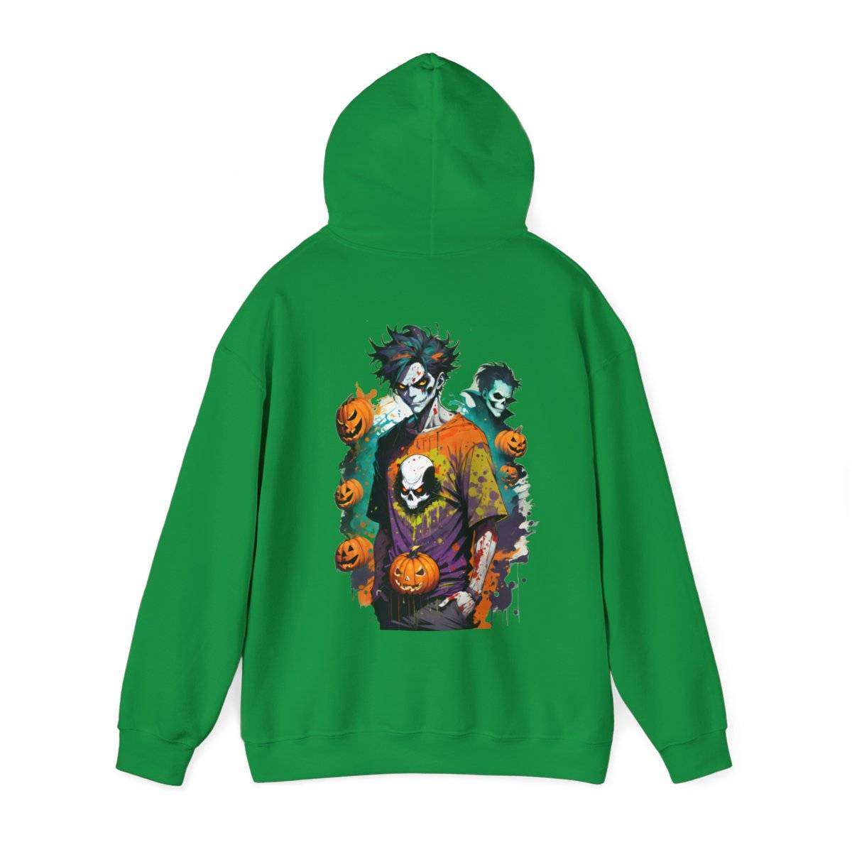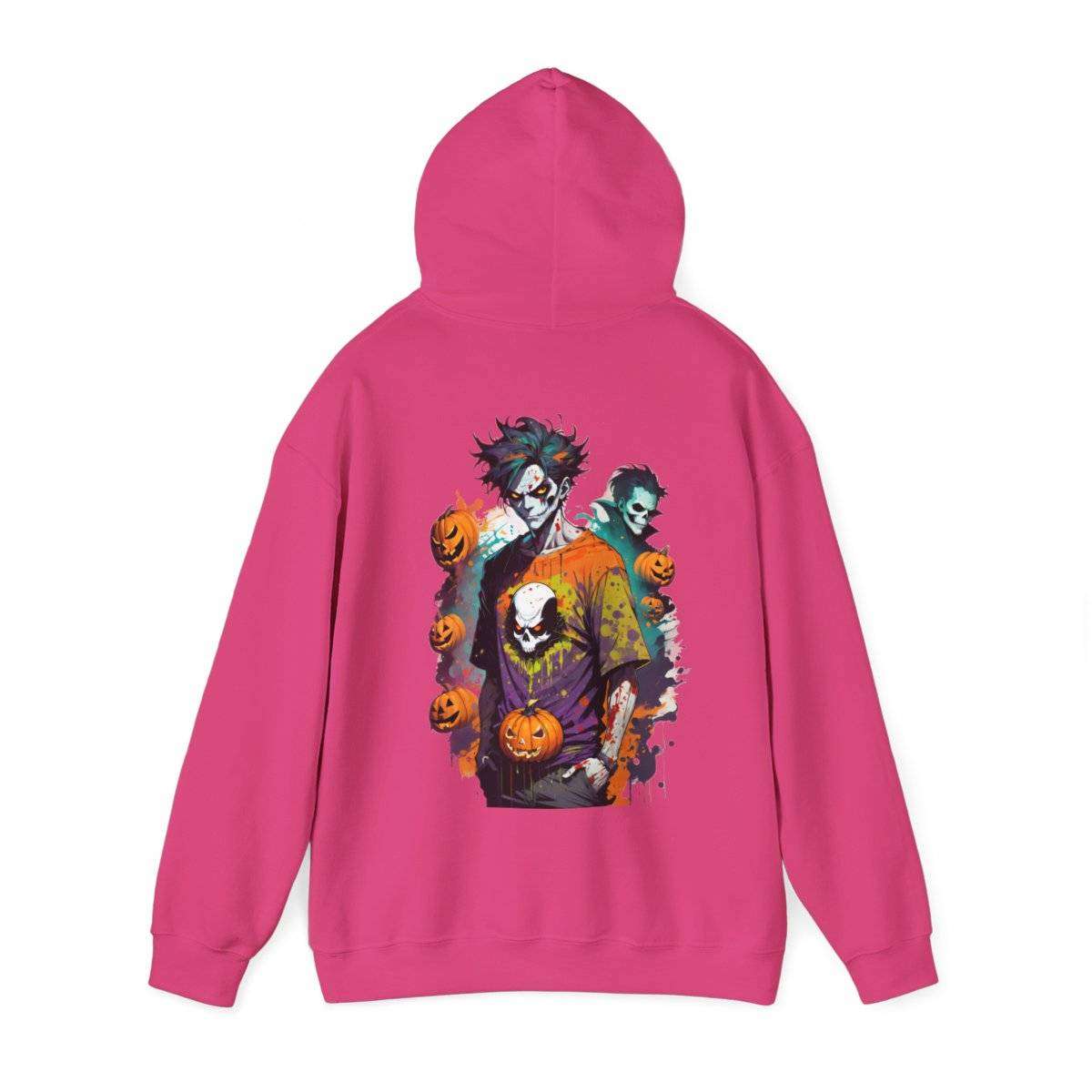 On the backside of this hoodie, you’ll find an intriguing design featuring two men with spooky white faces. They are surrounded by a circle of friendly jack-o’-lanterns, creating a captivating and eerie scene.