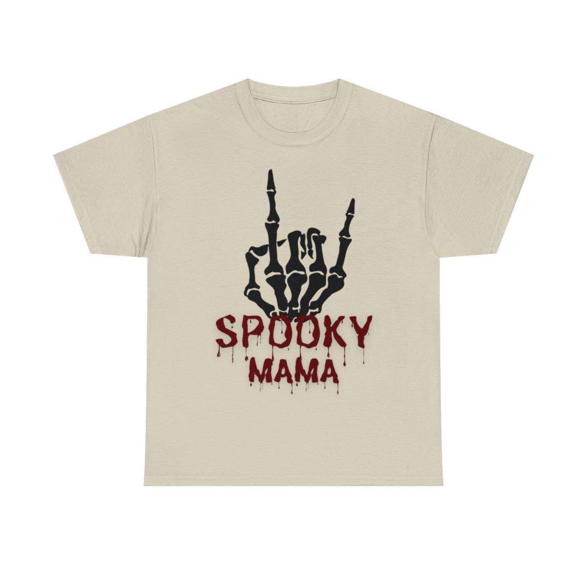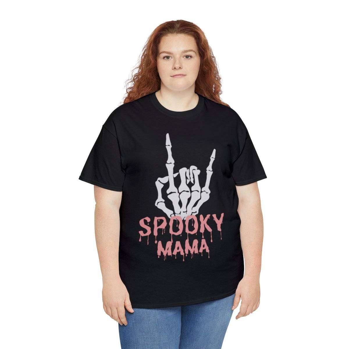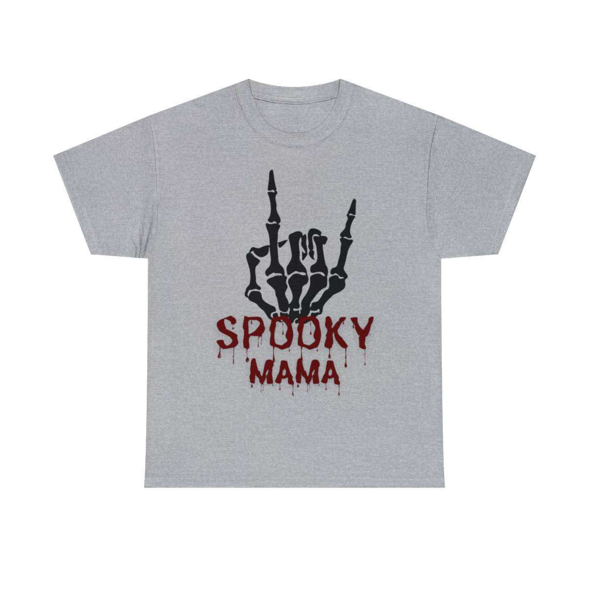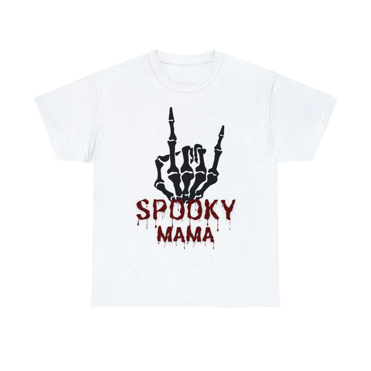 On the front of the tee, you’ll find the text “Spooky Mama” with a creative twist – it’s topped with a playful skeleton hand. It’s a design that captures the essence of Halloween and adds a touch of whimsy to your outfit.