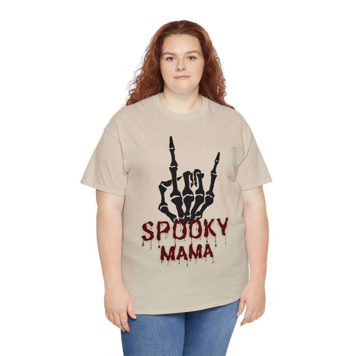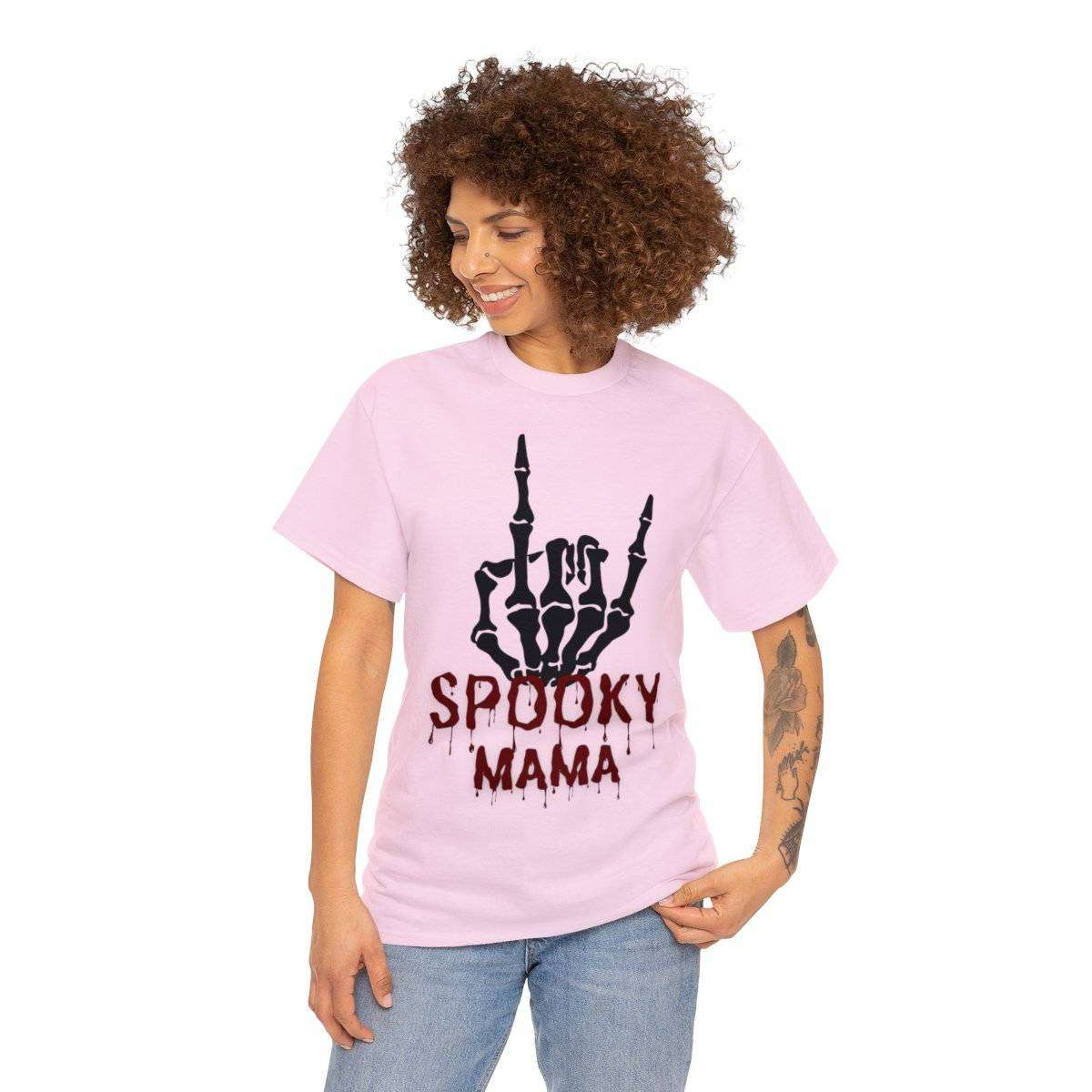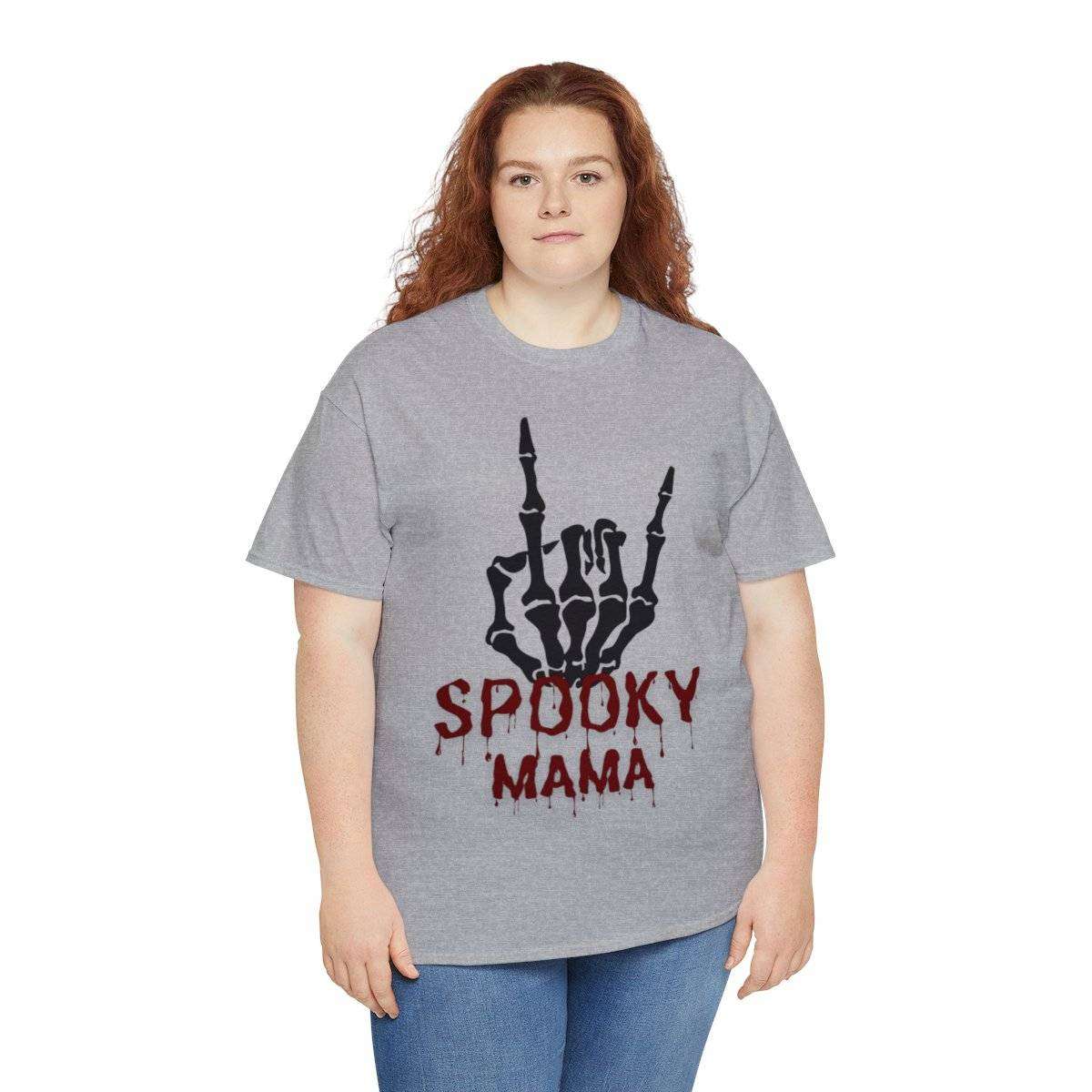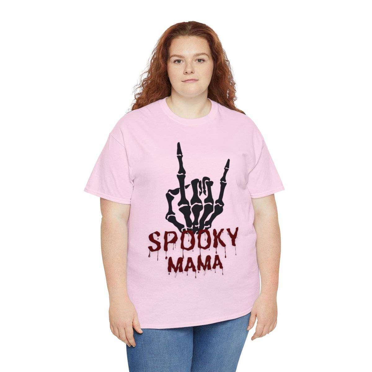 On the front of the tee, you’ll find the text “Spooky Mama” with a creative twist – it’s topped with a playful skeleton hand. It’s a design that captures the essence of Halloween and adds a touch of whimsy to your outfit.