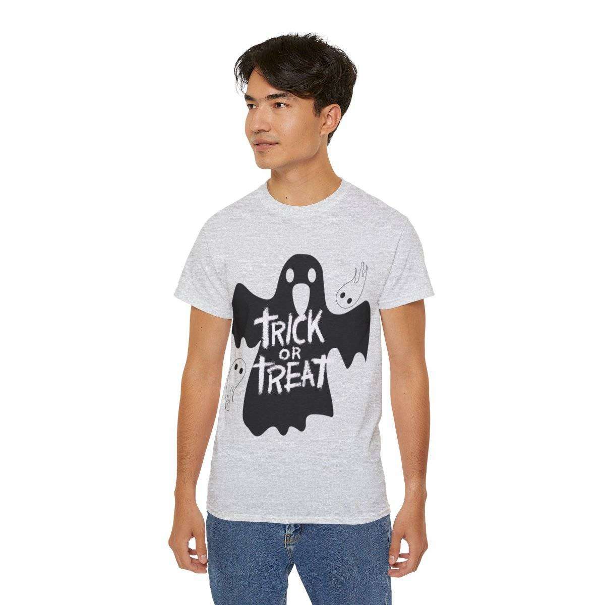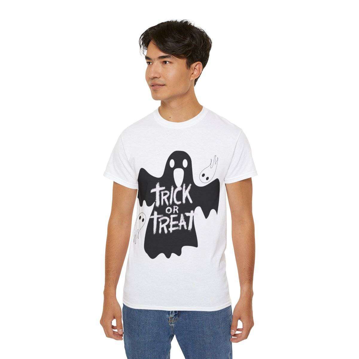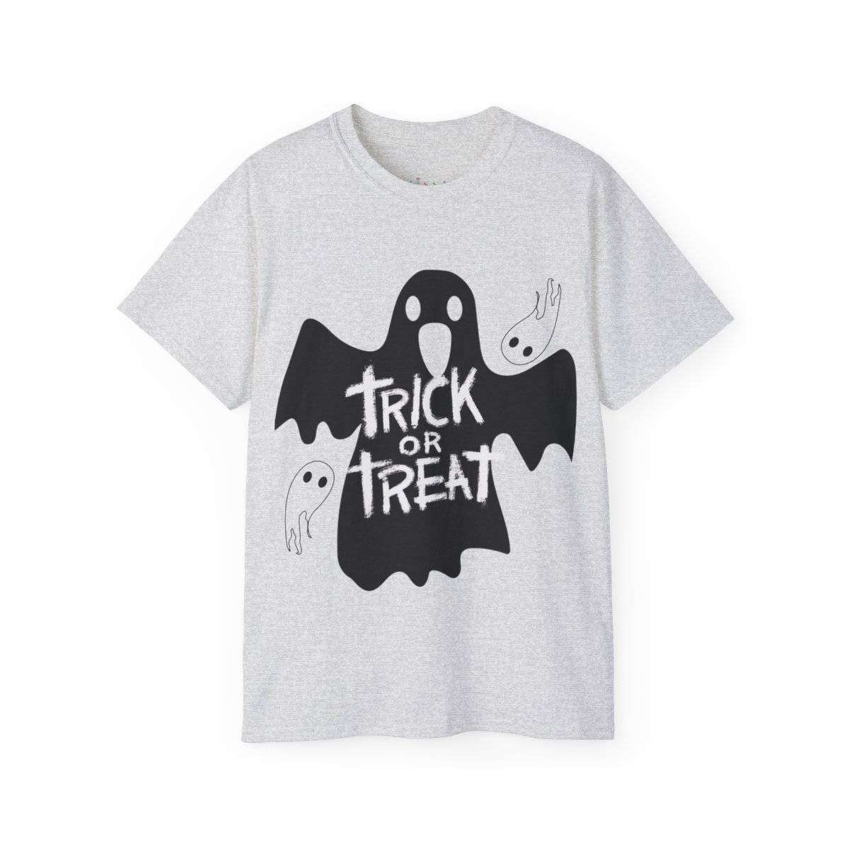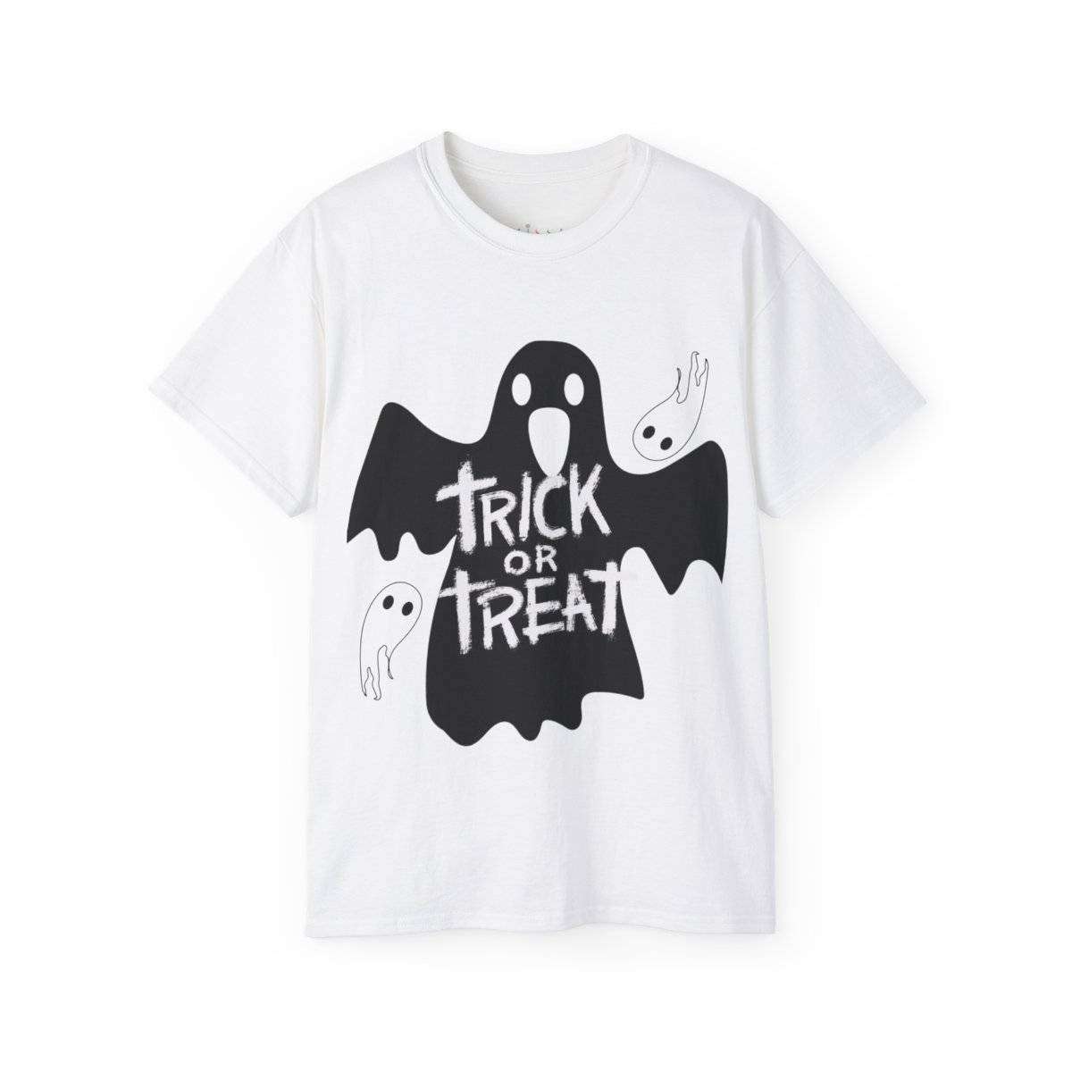 On the front of the tee, you’ll discover the words “Trick or Treat” written in a playful and spooky font. Accompanying these words is a spooky ghost in the background, adding a fun and slightly eerie touch to the design.