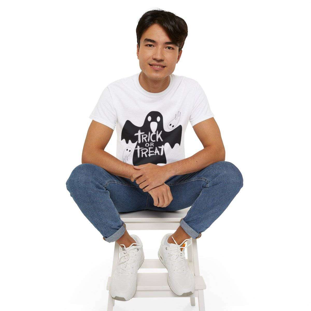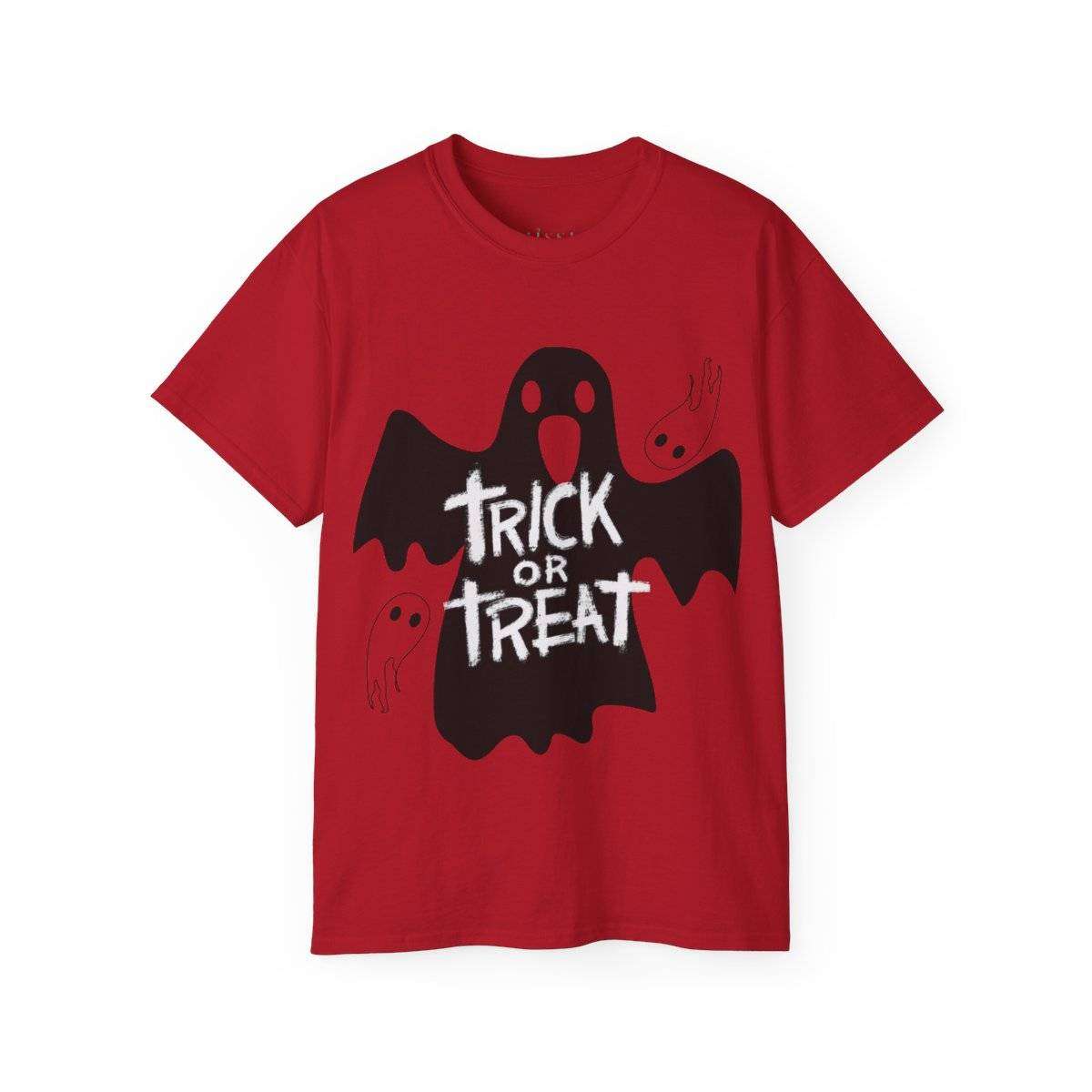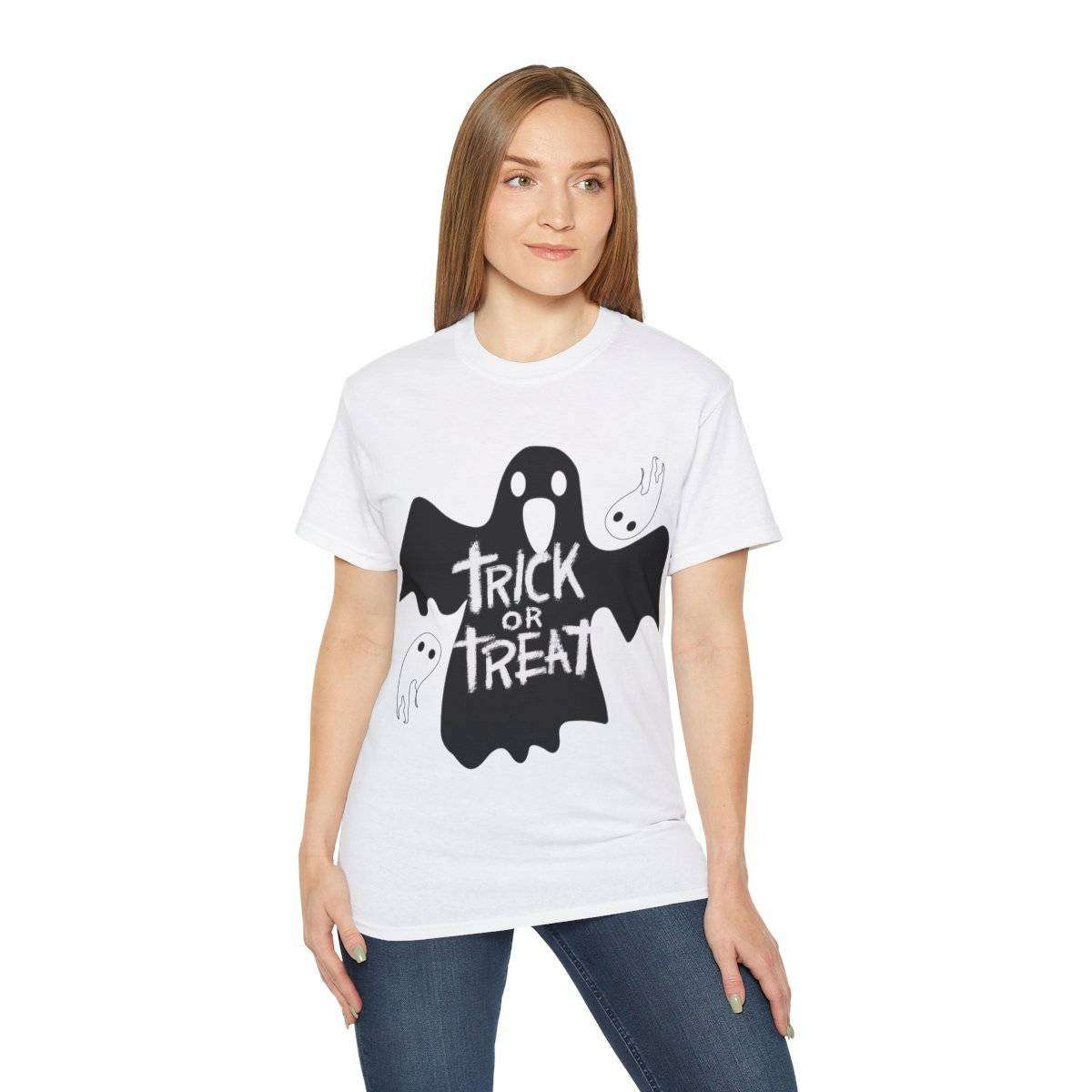 On the front of the tee, you’ll discover the words “Trick or Treat” written in a playful and spooky font. Accompanying these words is a spooky ghost in the background, adding a fun and slightly eerie touch to the design.