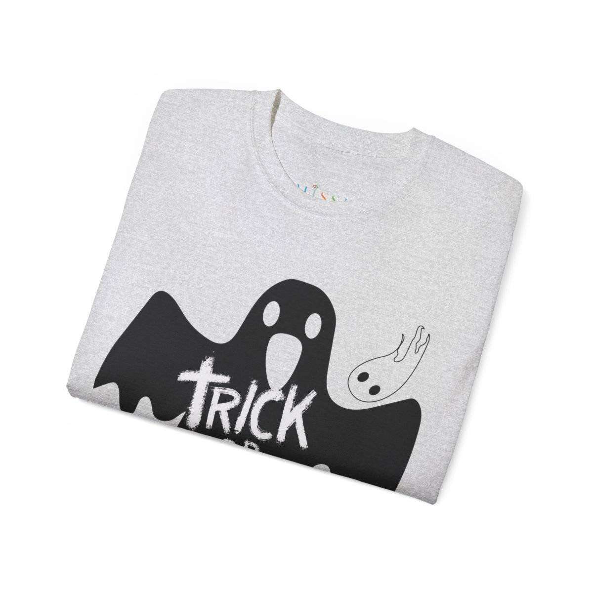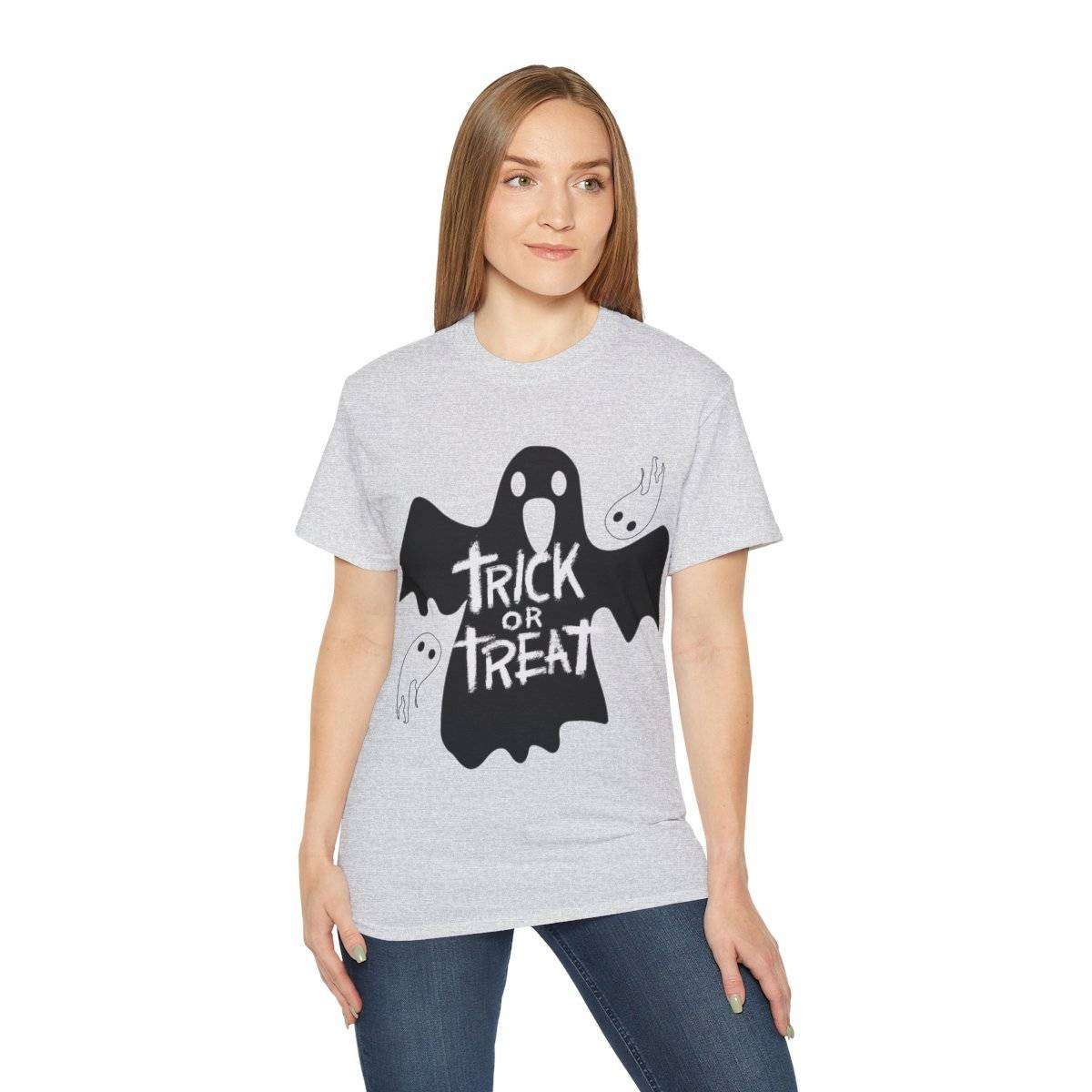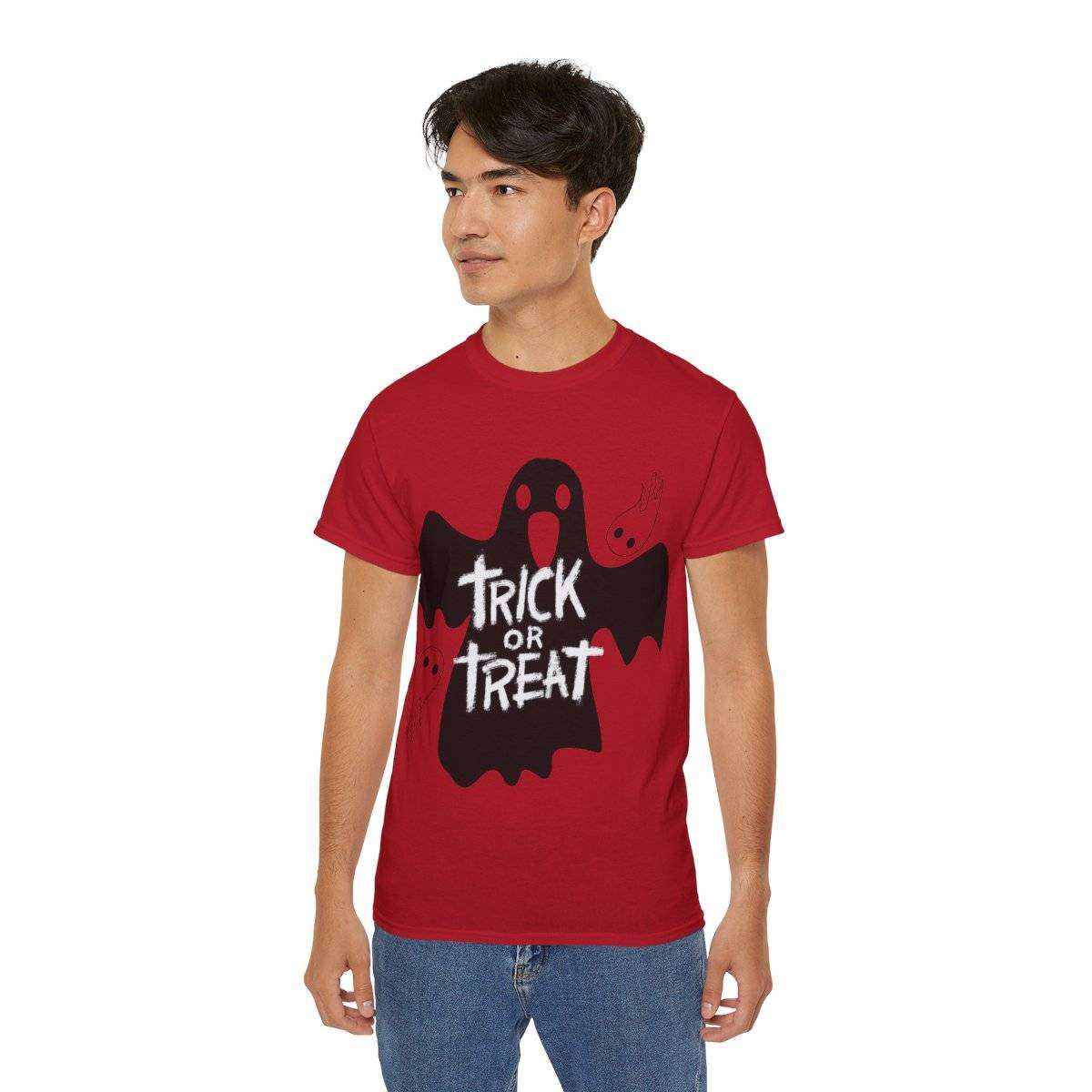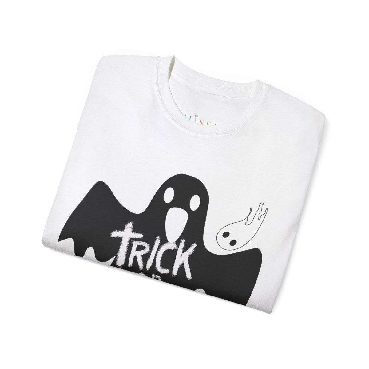 On the front of the tee, you’ll discover the words “Trick or Treat” written in a playful and spooky font. Accompanying these words is a spooky ghost in the background, adding a fun and slightly eerie touch to the design.