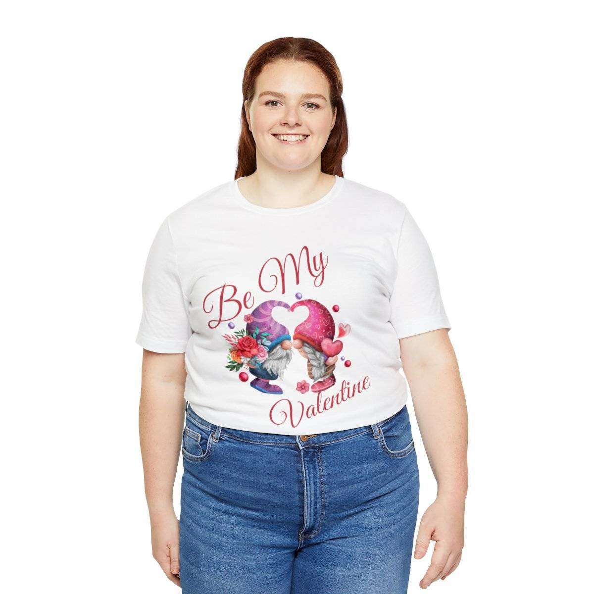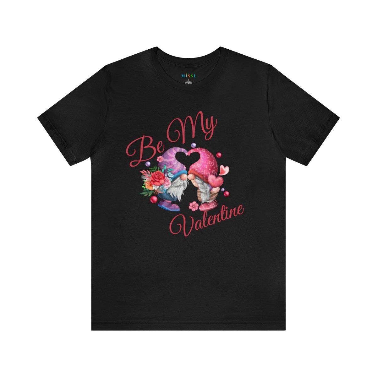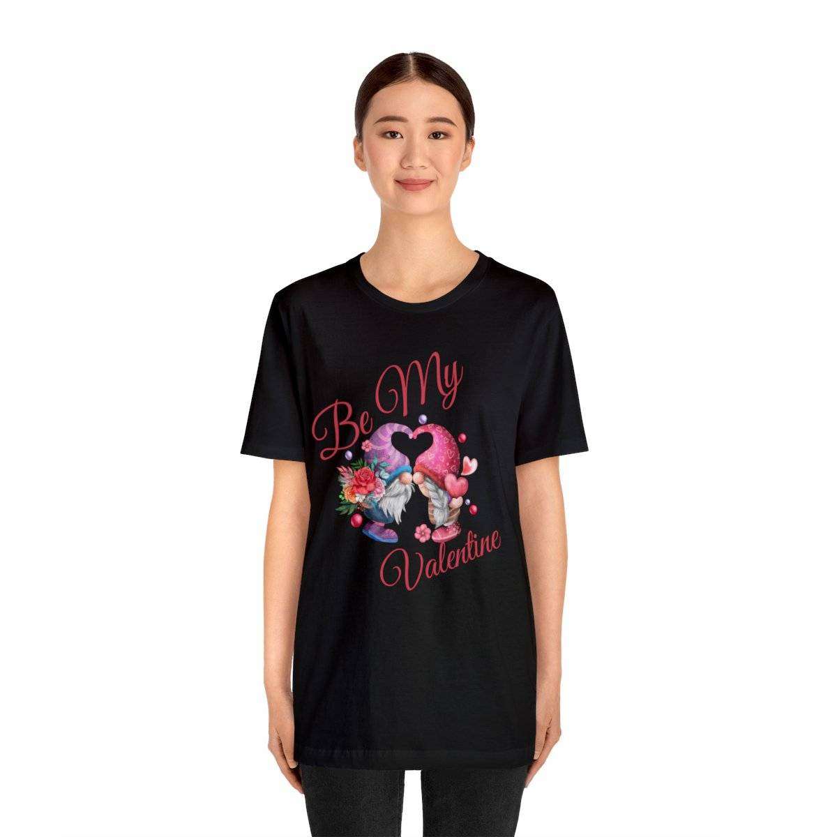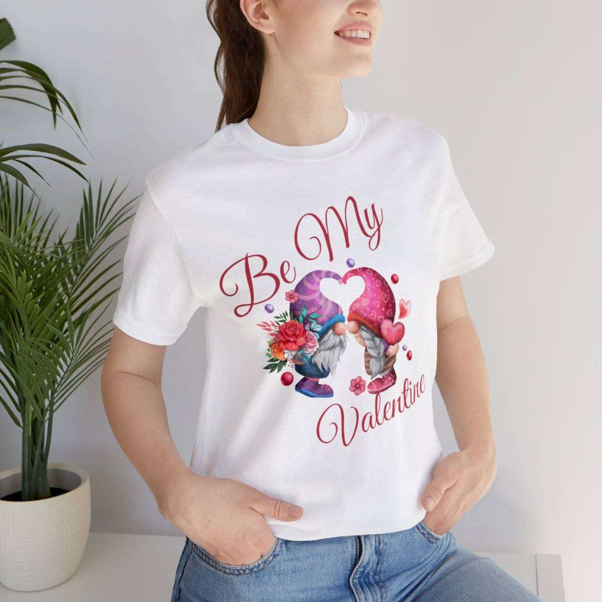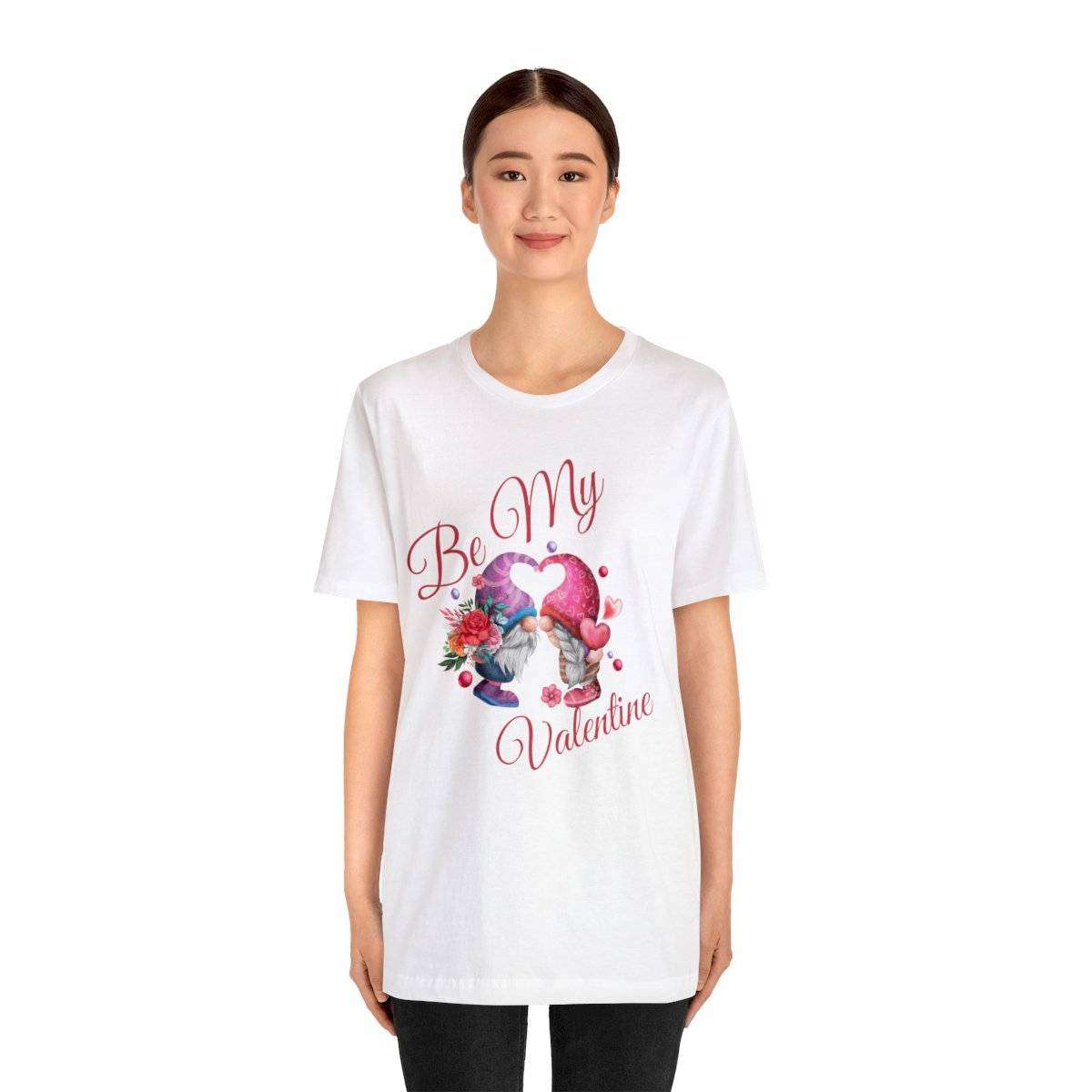 Introducing our New Women’s Valentine T-shirt! The front of this charming tee showcases two gnomes—a male gnome holding a bouquet of roses, with their hats cleverly forming a heart shape. Accompanying this adorable scene is the affectionate text “Be My Valentine.”