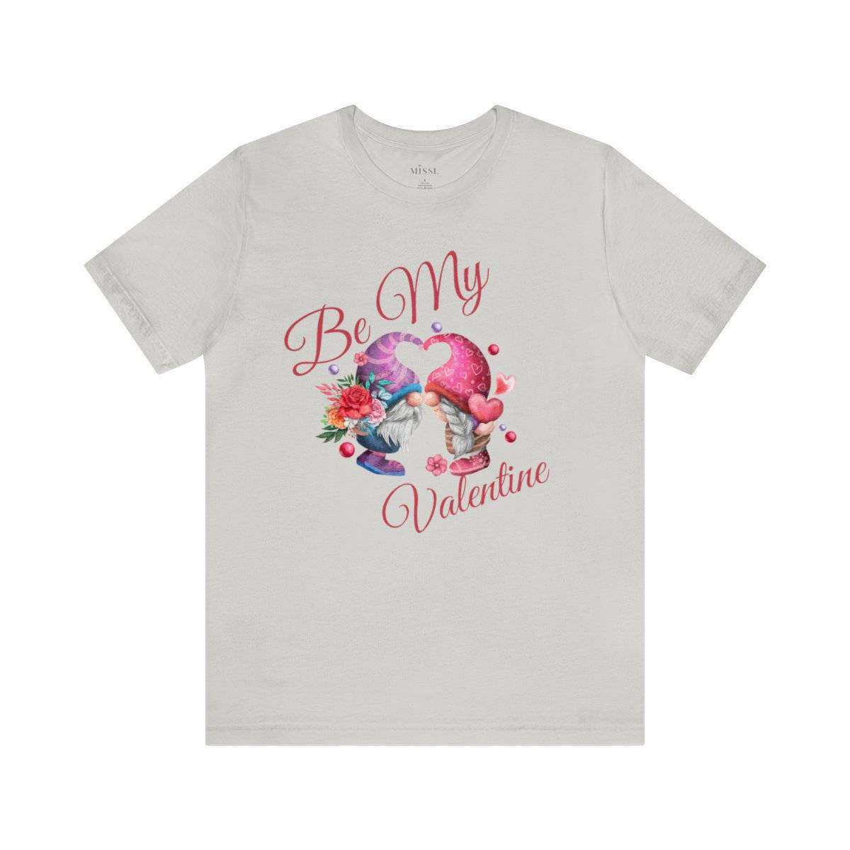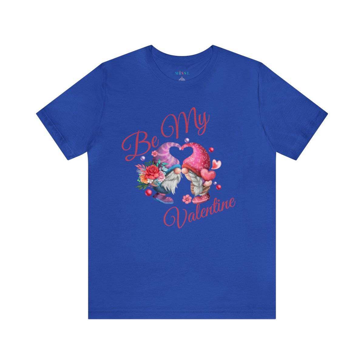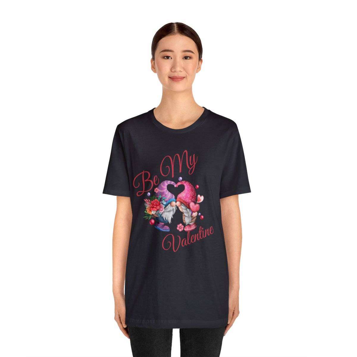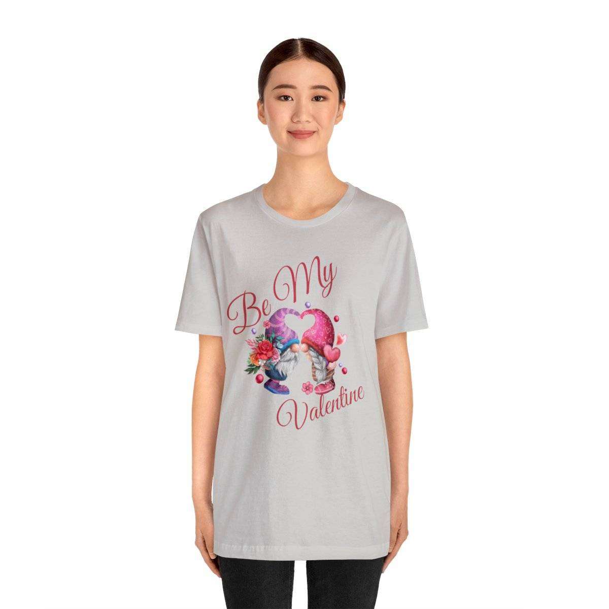 Introducing our New Women’s Valentine T-shirt! The front of this charming tee showcases two gnomes—a male gnome holding a bouquet of roses, with their hats cleverly forming a heart shape. Accompanying this adorable scene is the affectionate text “Be My Valentine.”