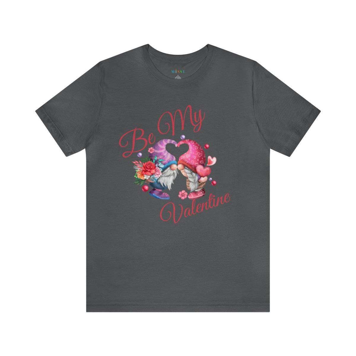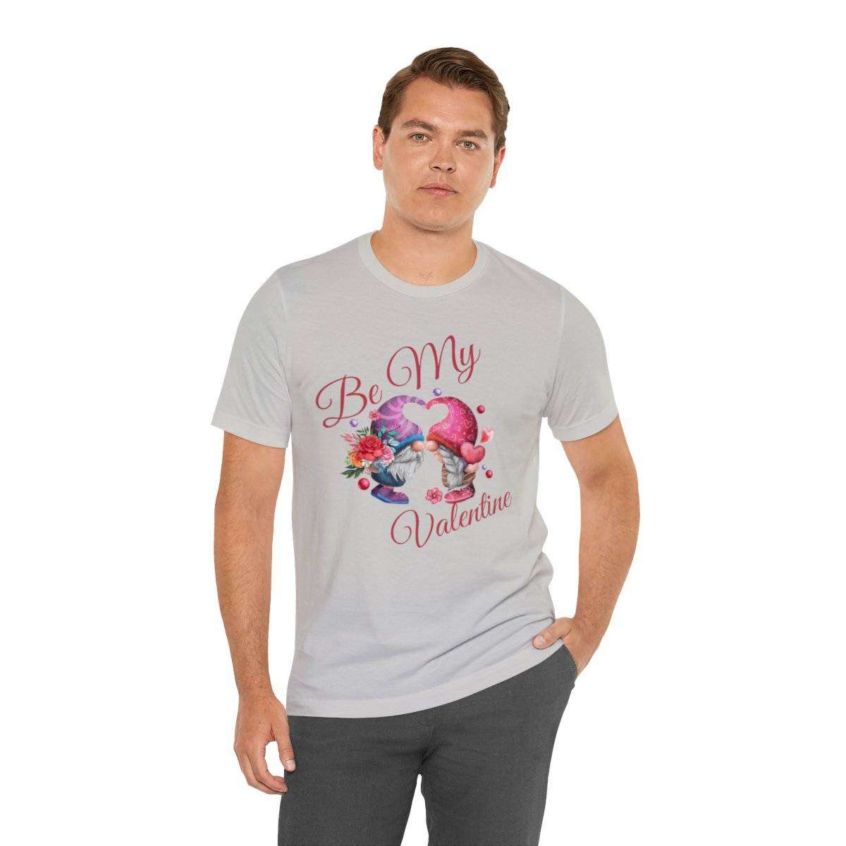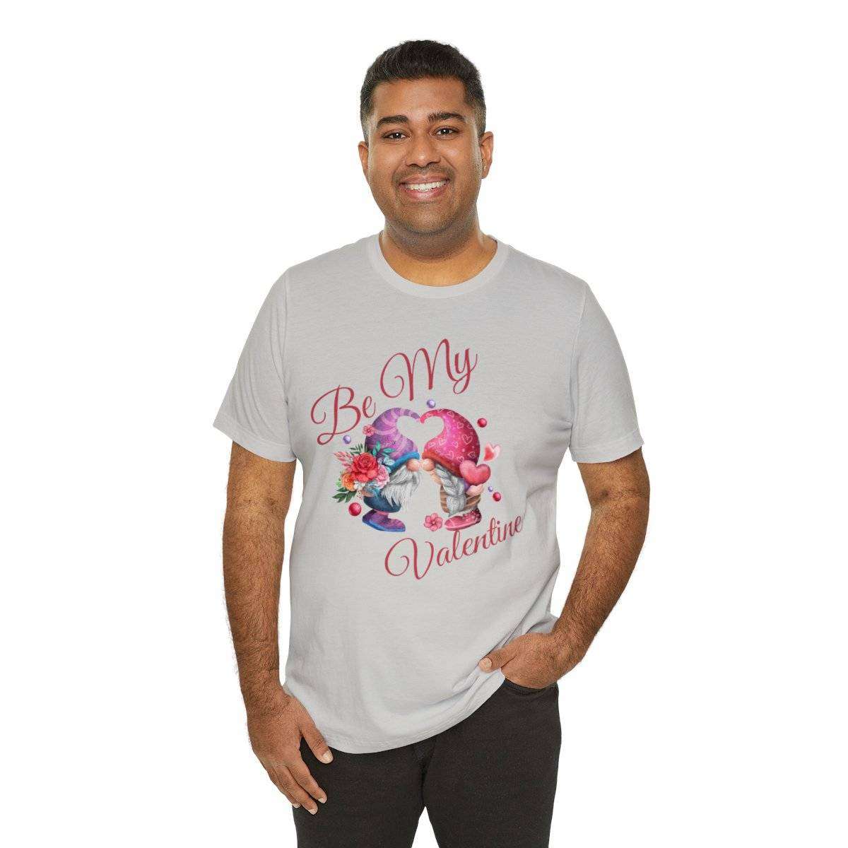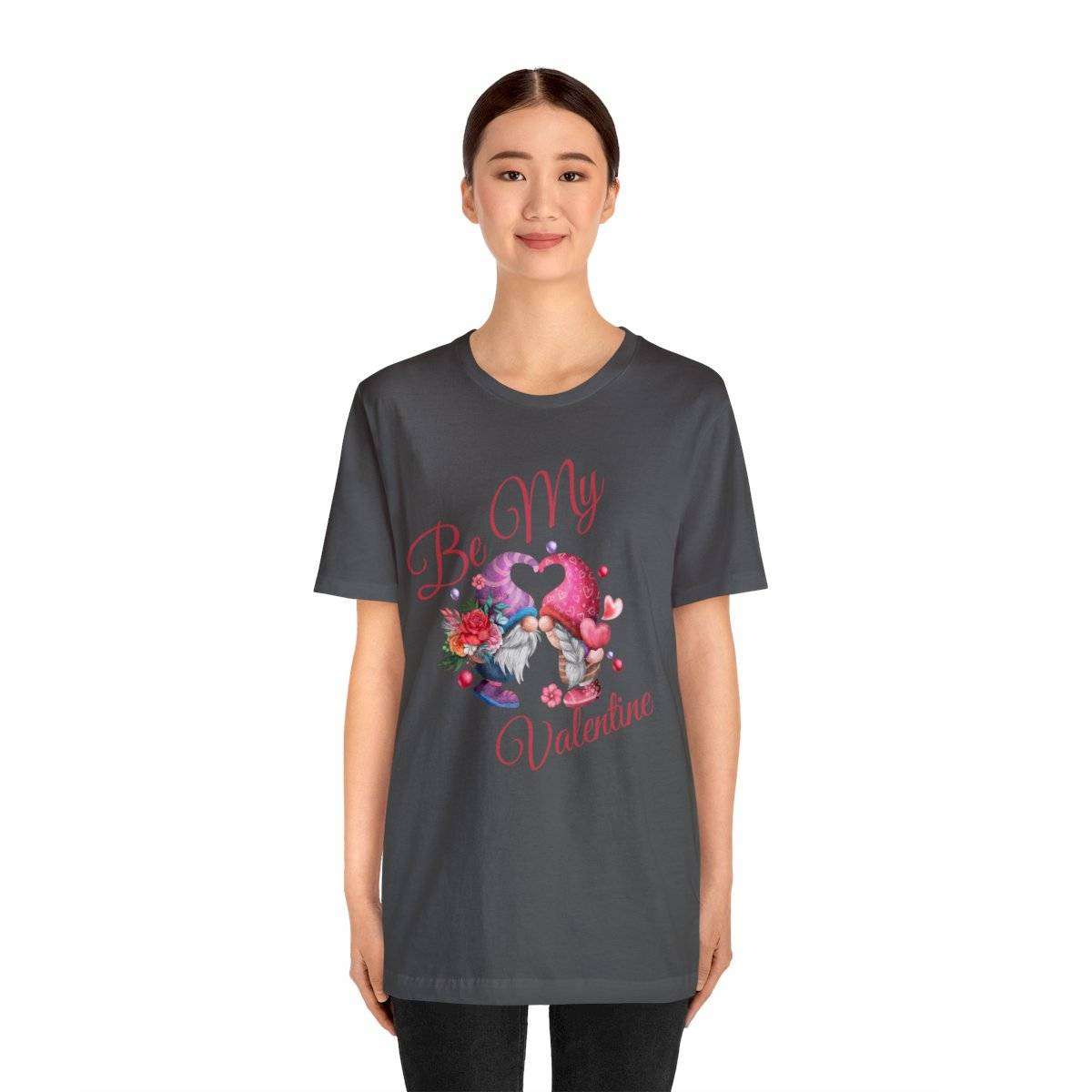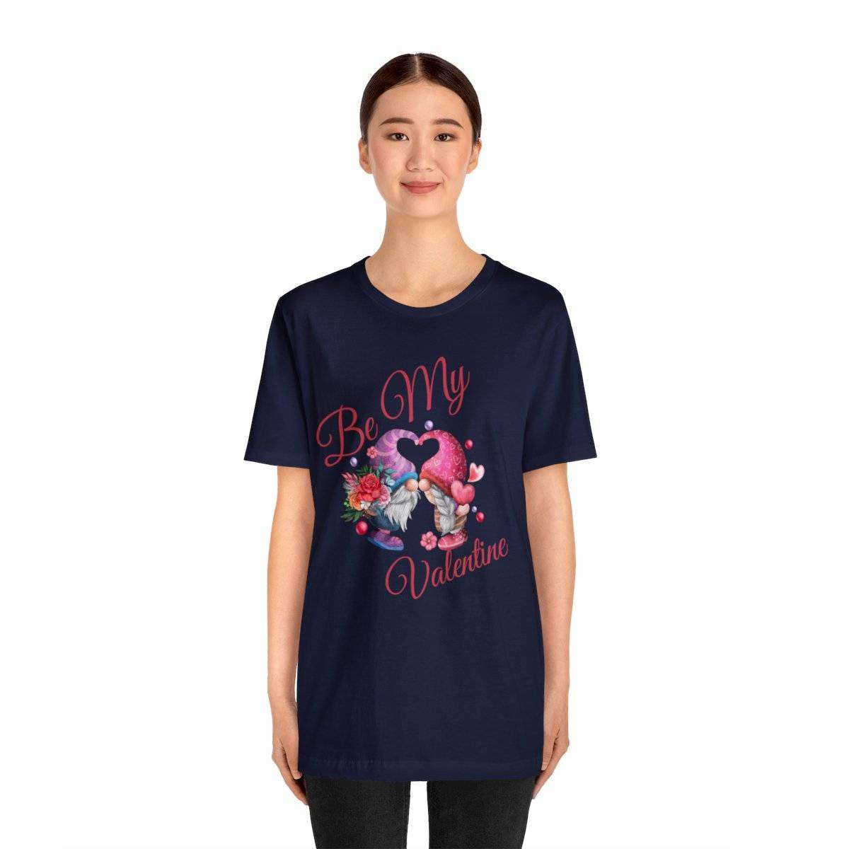 Introducing our New Women’s Valentine T-shirt! The front of this charming tee showcases two gnomes—a male gnome holding a bouquet of roses, with their hats cleverly forming a heart shape. Accompanying this adorable scene is the affectionate text “Be My Valentine.”