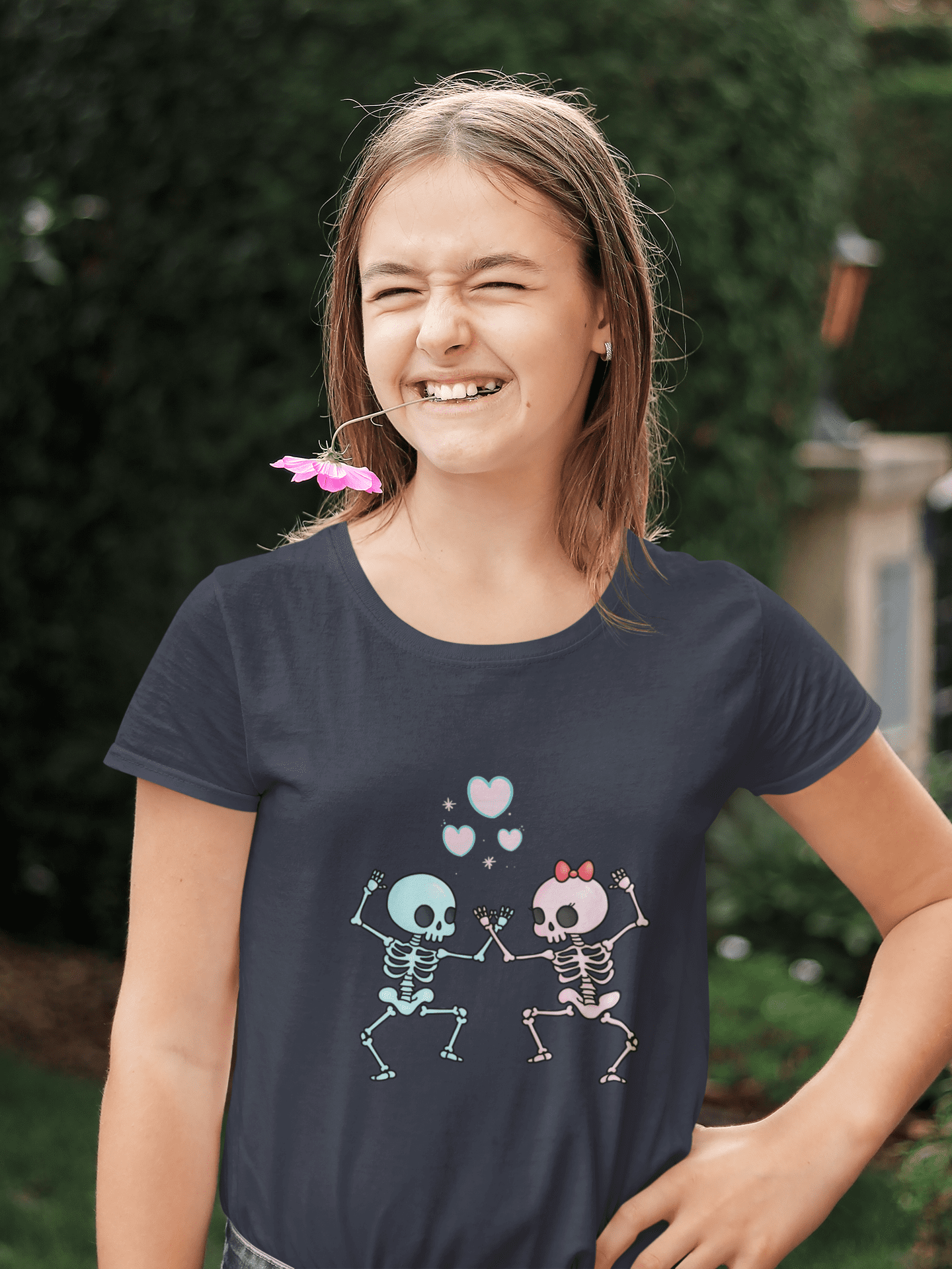 More than just clothing, this tee is a wearable celebration of love. The lively illustration and the playful depiction of dancing skeletons make it a perfect choice for young ones who enjoy a touch of whimsy in their wardrobe.