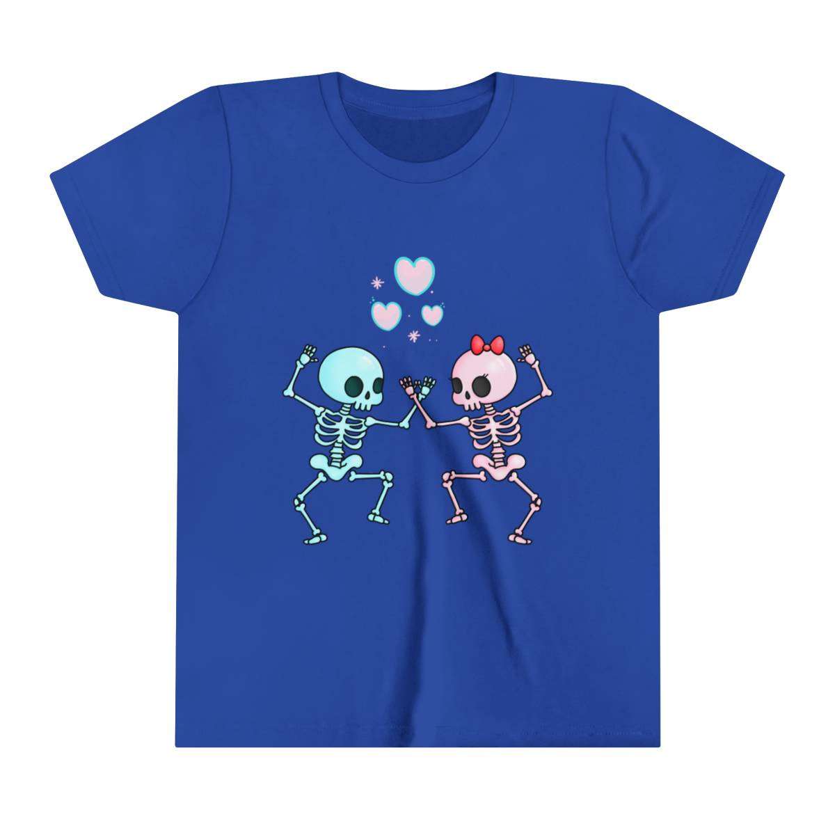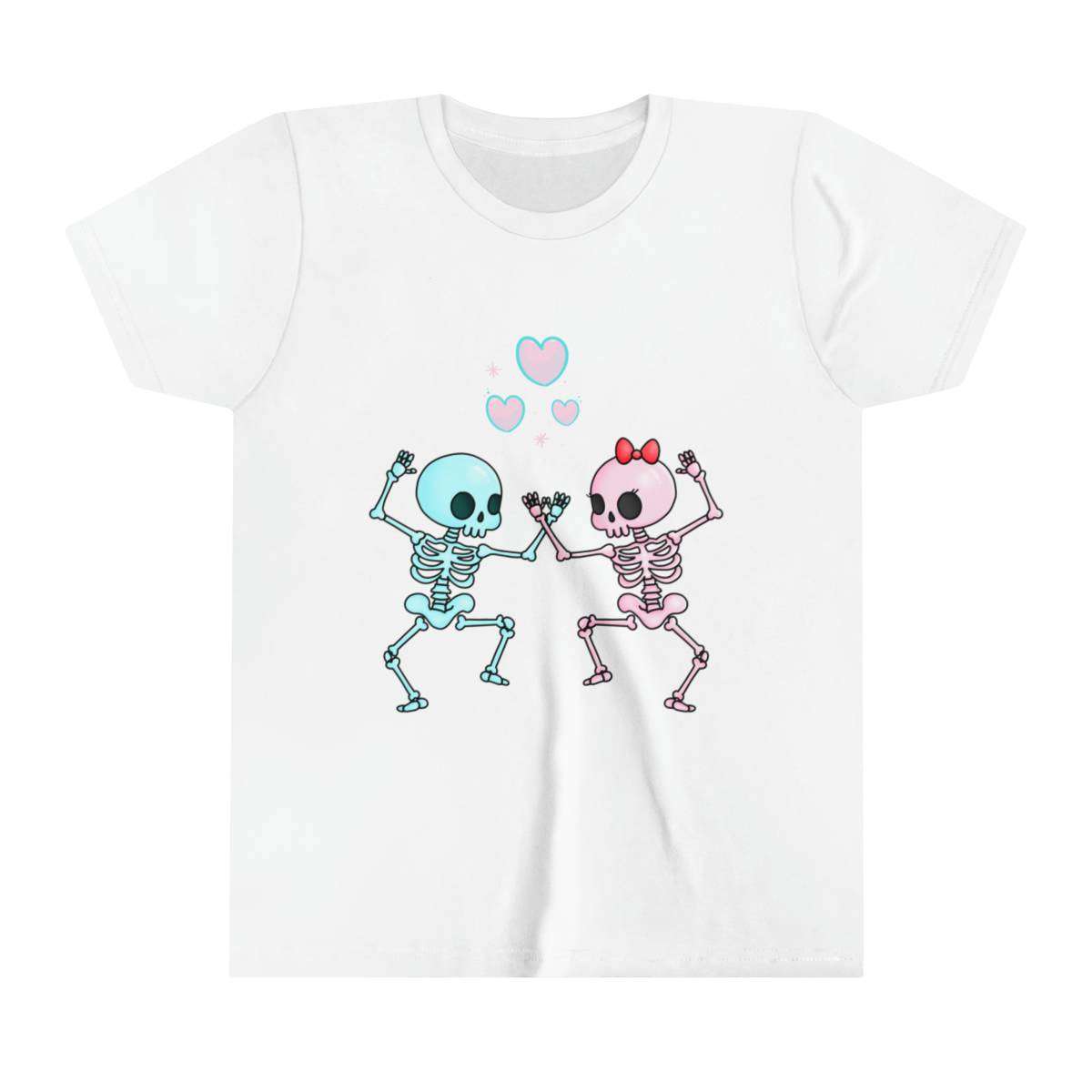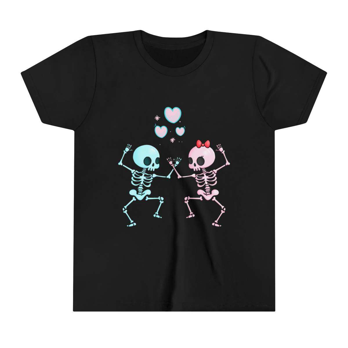 Introducing our Youth Skeleton Love Tee! The front of this tee showcases a playful and charming scene with two skeletons dancing, holding hands. Above them, hearts float, adding a whimsical touch to the design.