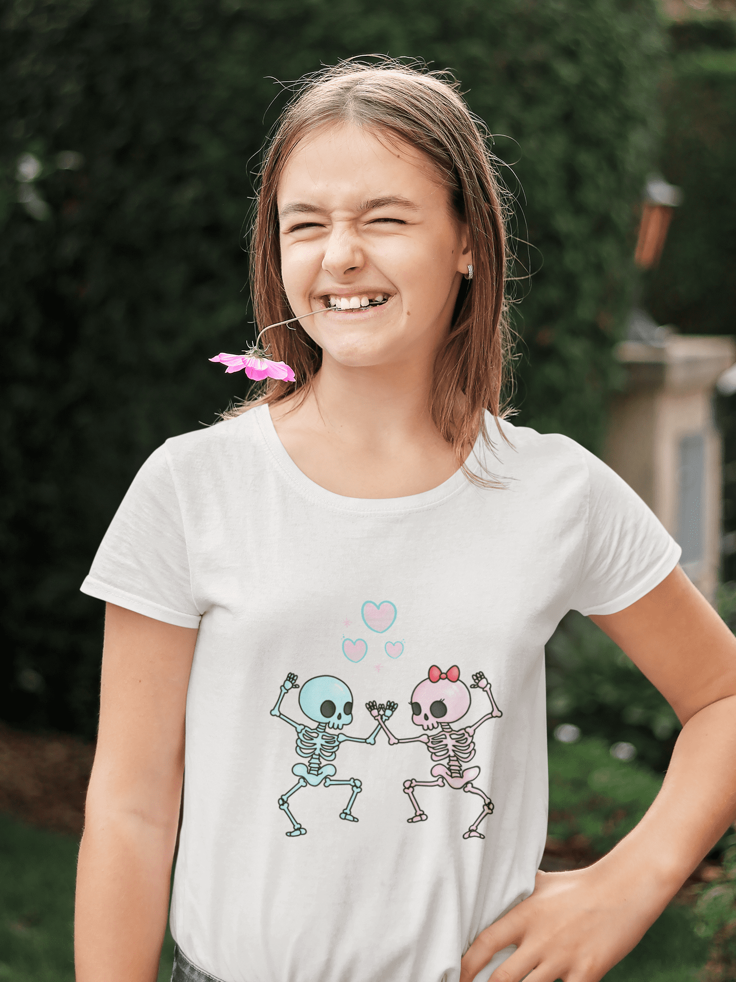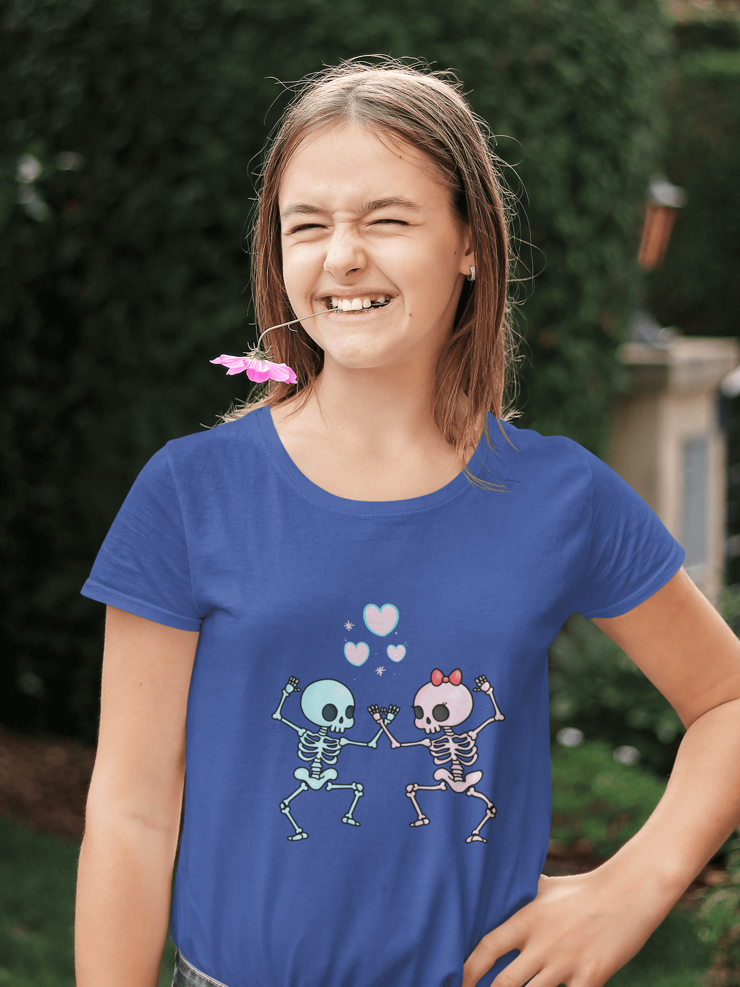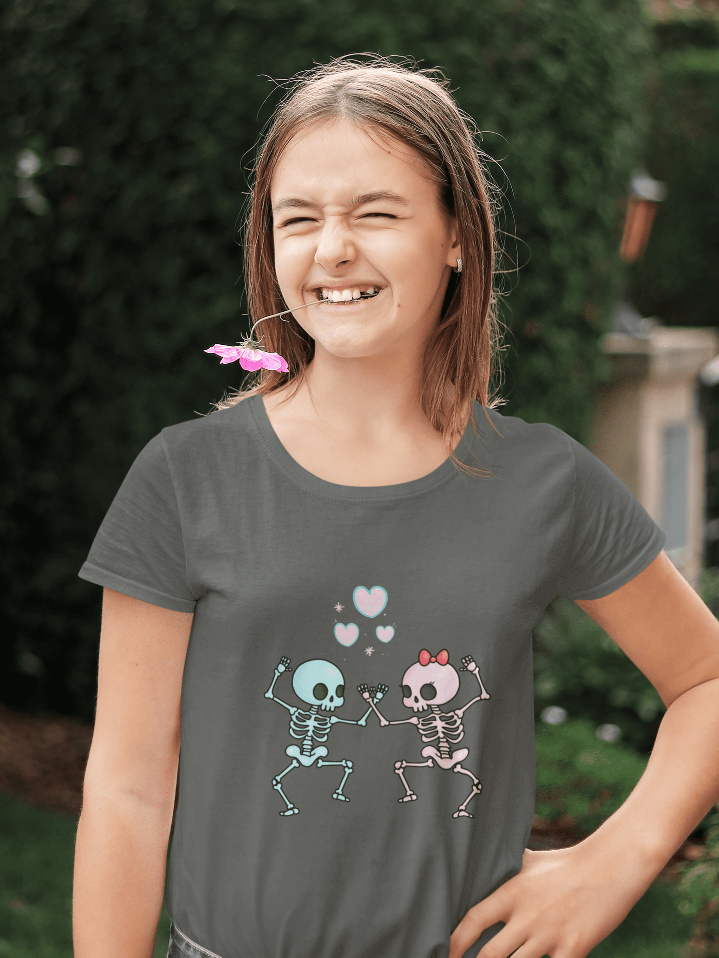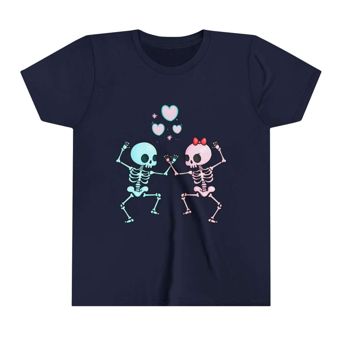 Introducing our Youth Skeleton Love Tee! The front of this tee showcases a playful and charming scene with two skeletons dancing, holding hands. Above them, hearts float, adding a whimsical touch to the design.
