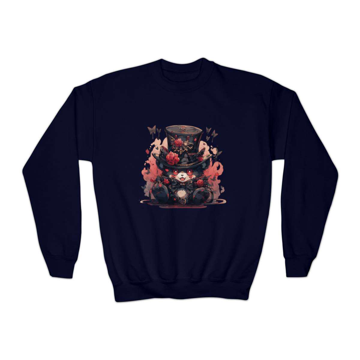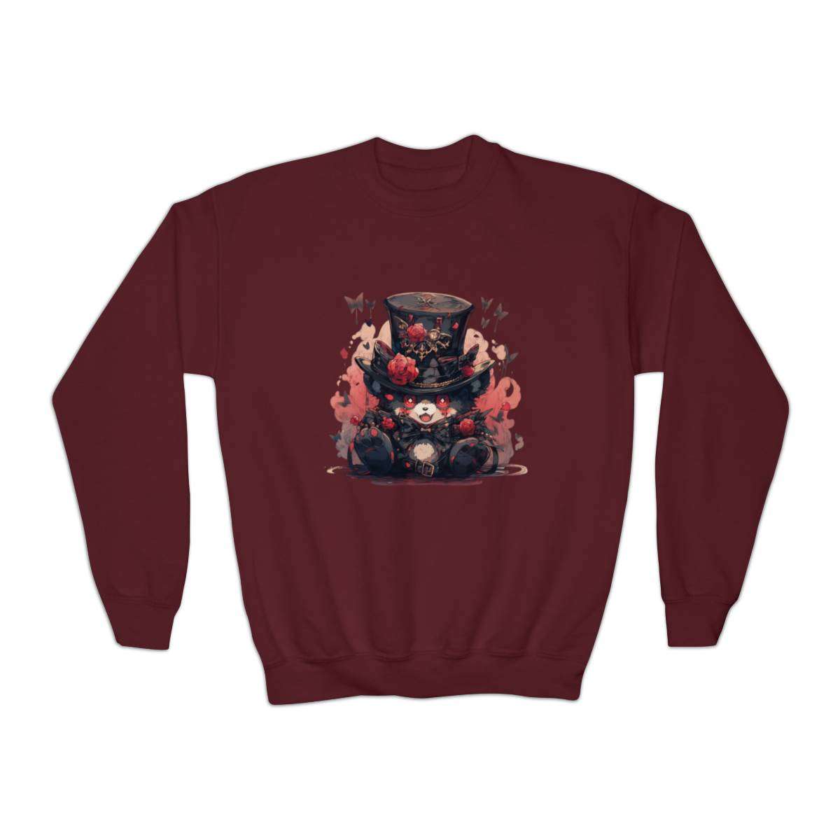 Introducing our Youth Vampire Teddy Love Sweatshirt! The front of this unique sweatshirt showcases a gothic-style teddy bear with red eyes wearing a magician hat. In the background, black butterflies playfully flutter, adding an intriguing and mystical touch.